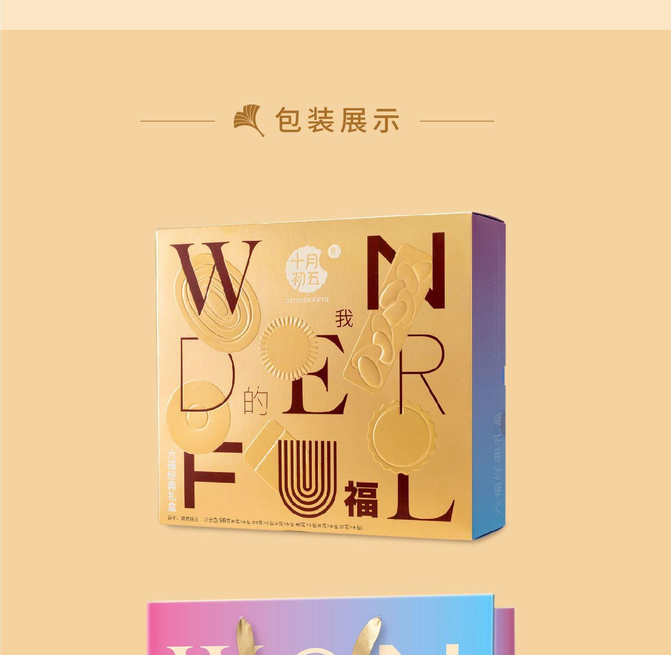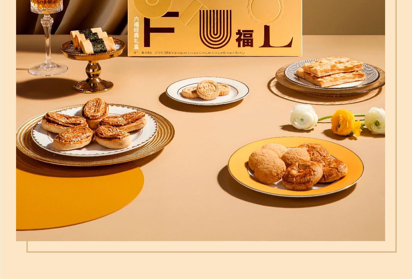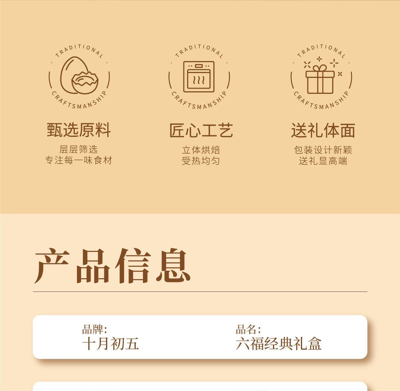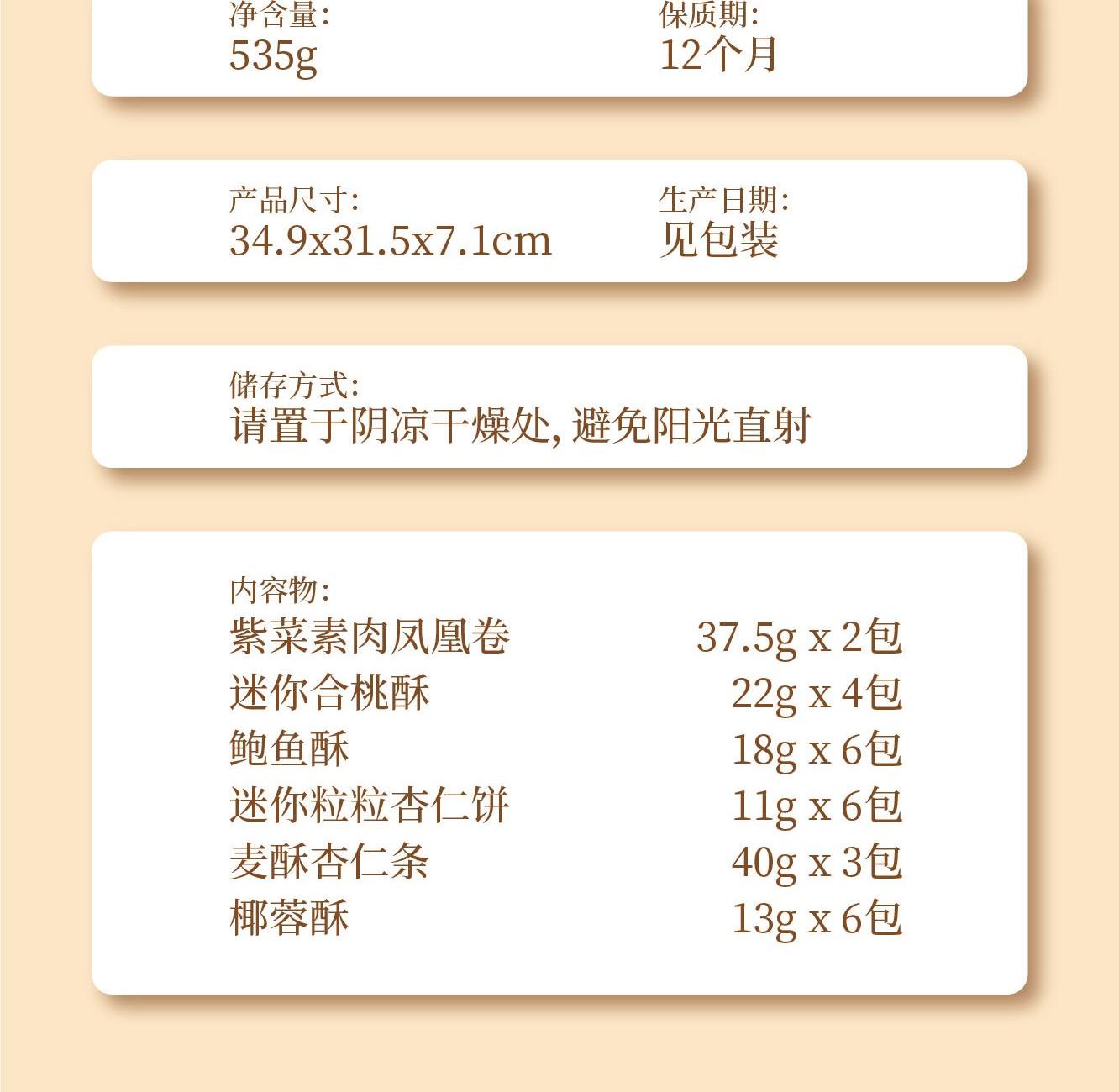 十月初五六福经典礼盒 净含量:535g 11g迷你粒粒杏仁饼X6 13g椰蓉酥X6 18g鲍鱼酥X6 40g麦酥杏仁条X3 37.5g紫菜素肉凤凰卷X2 22g迷你合桃酥X4