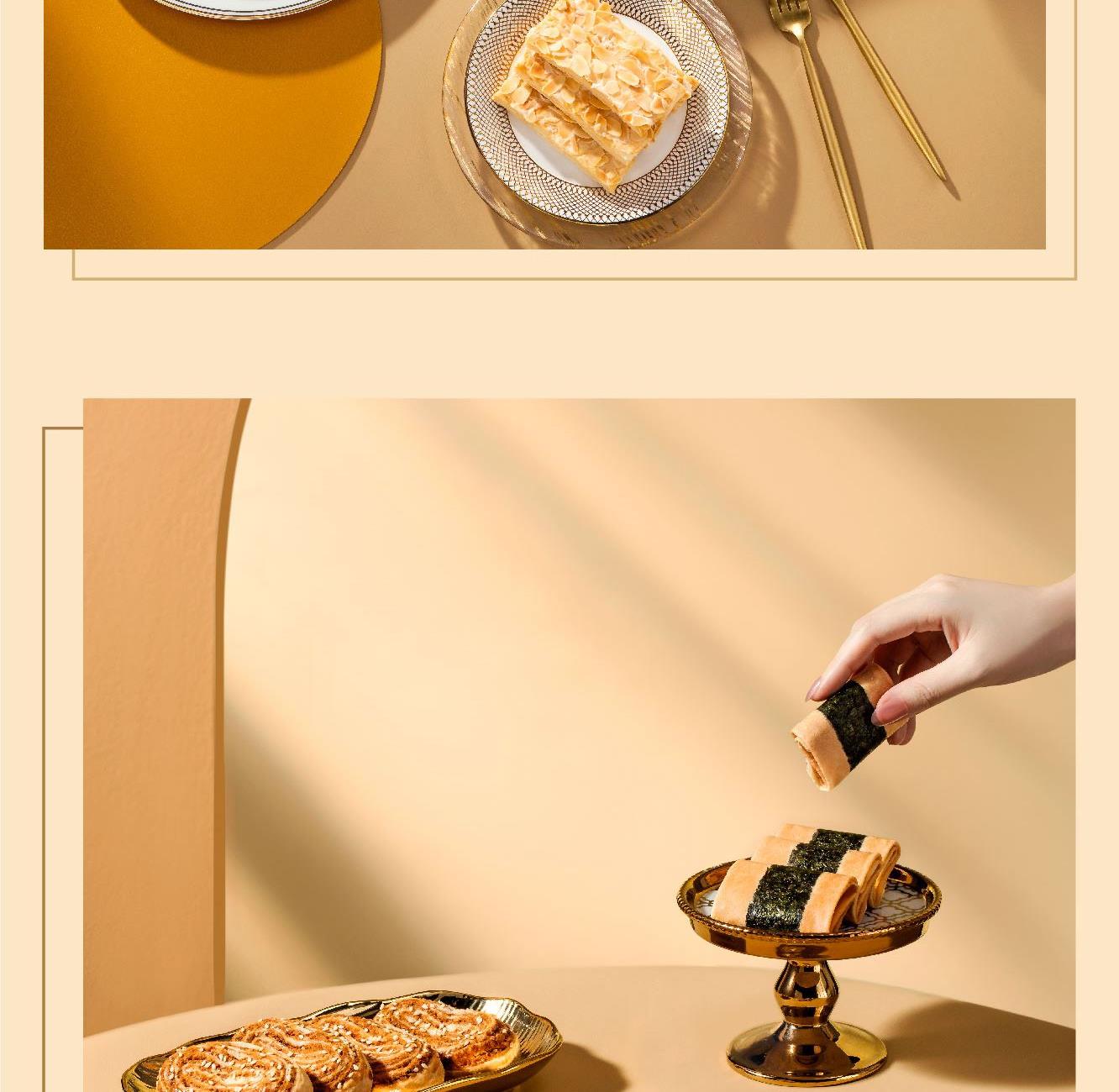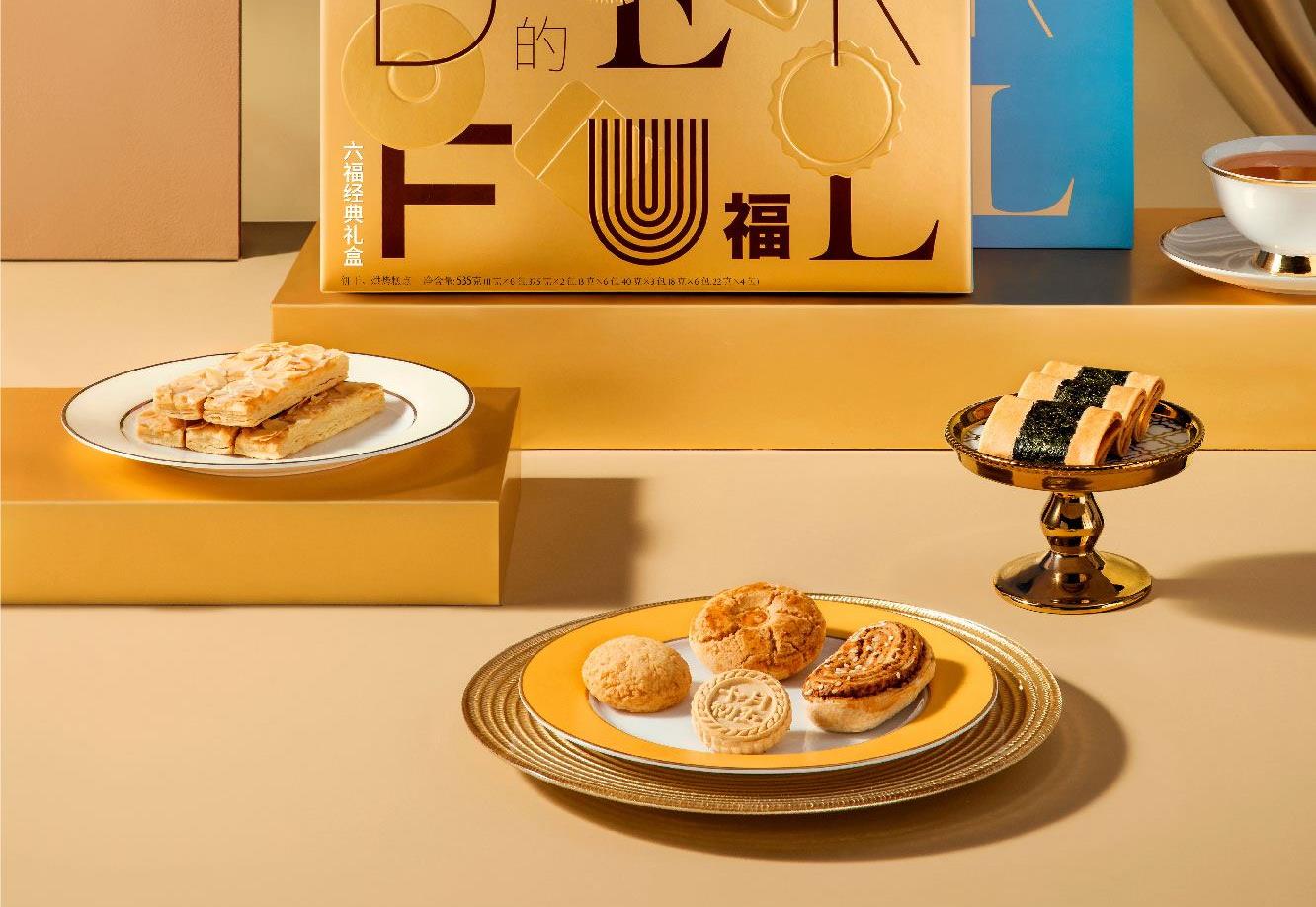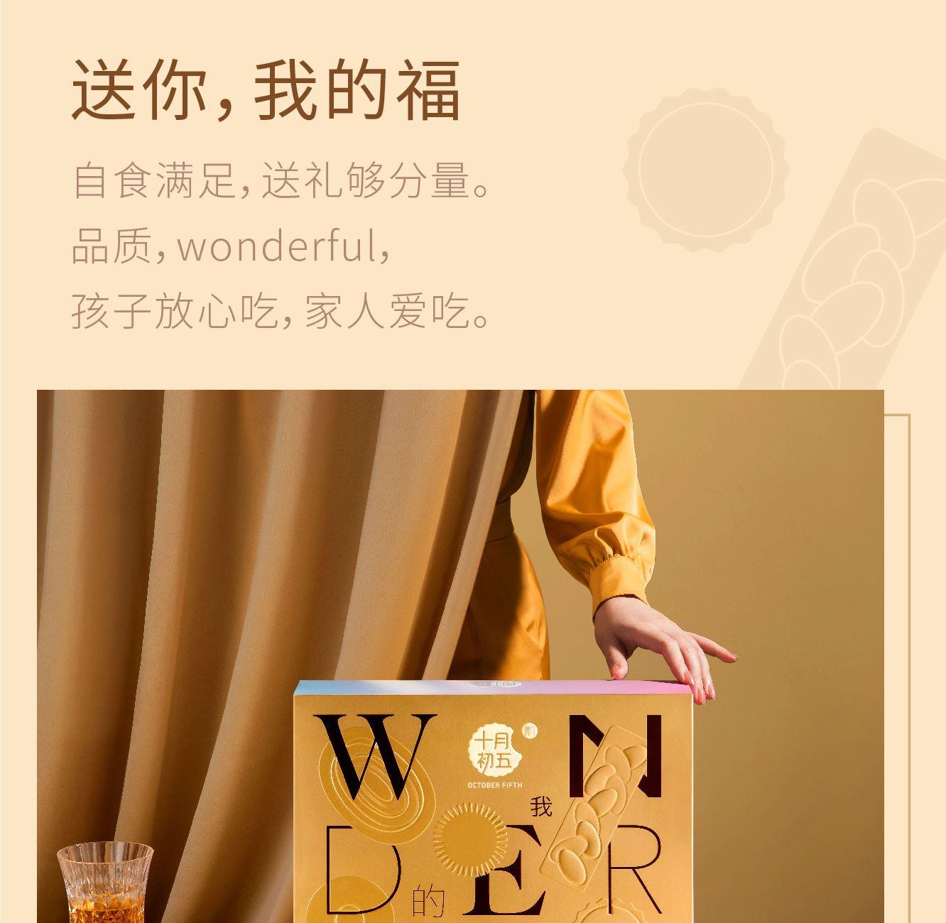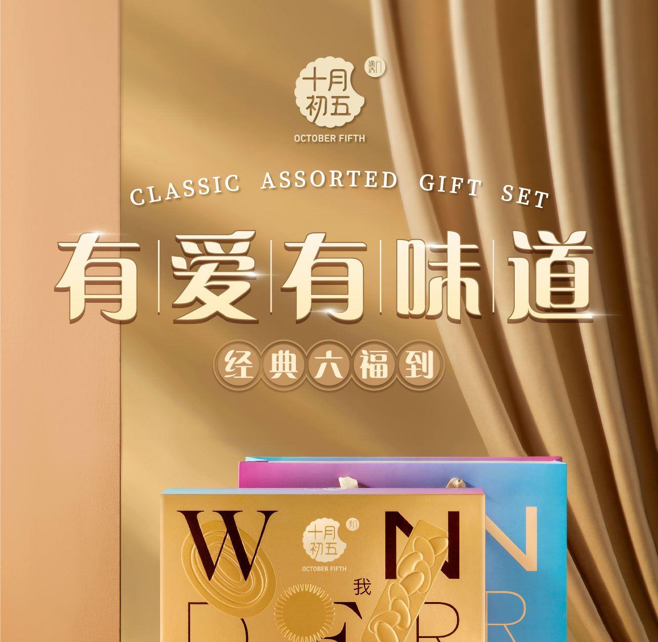 十月初五六福经典礼盒 净含量:535g 11g迷你粒粒杏仁饼X6 13g椰蓉酥X6 18g鲍鱼酥X6 40g麦酥杏仁条X3 37.5g紫菜素肉凤凰卷X2 22g迷你合桃酥X4