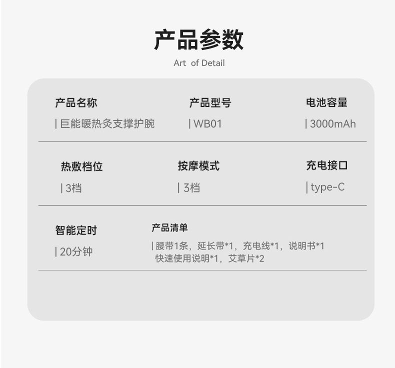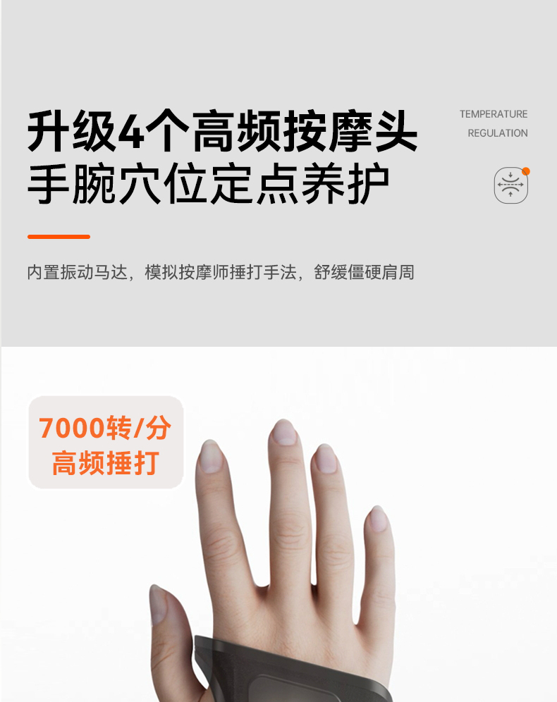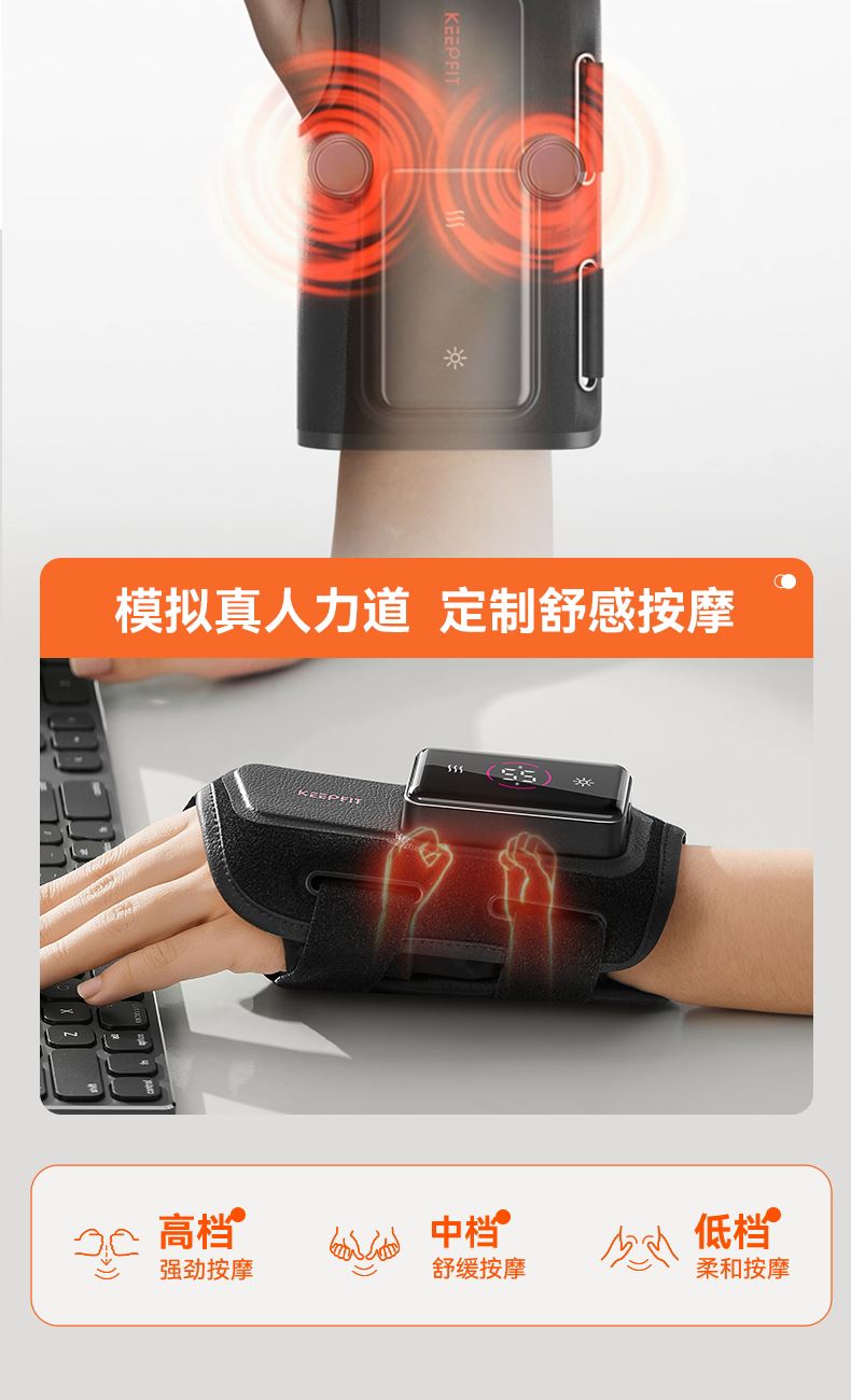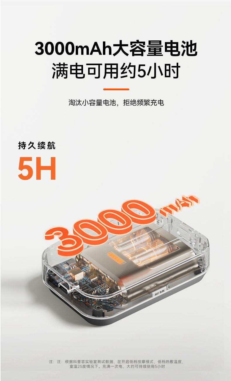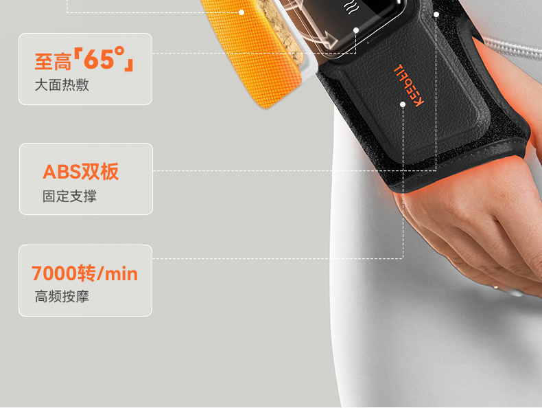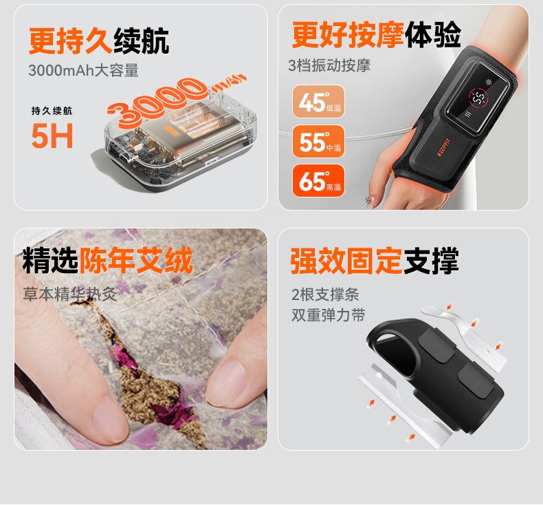 【四核独立按摩】内置4个精密按摩头,独立操控,可组合多种律动模式 【双面立体支撑】内外双面贴合设计,佩戴稳固不位移,按摩力度直达深层肌群 【发热材质】石墨烯发热片,5S速热,发热均匀,深层渗透肌肉有效缓解酸痛 【电池容量】3000mAh大容量电池