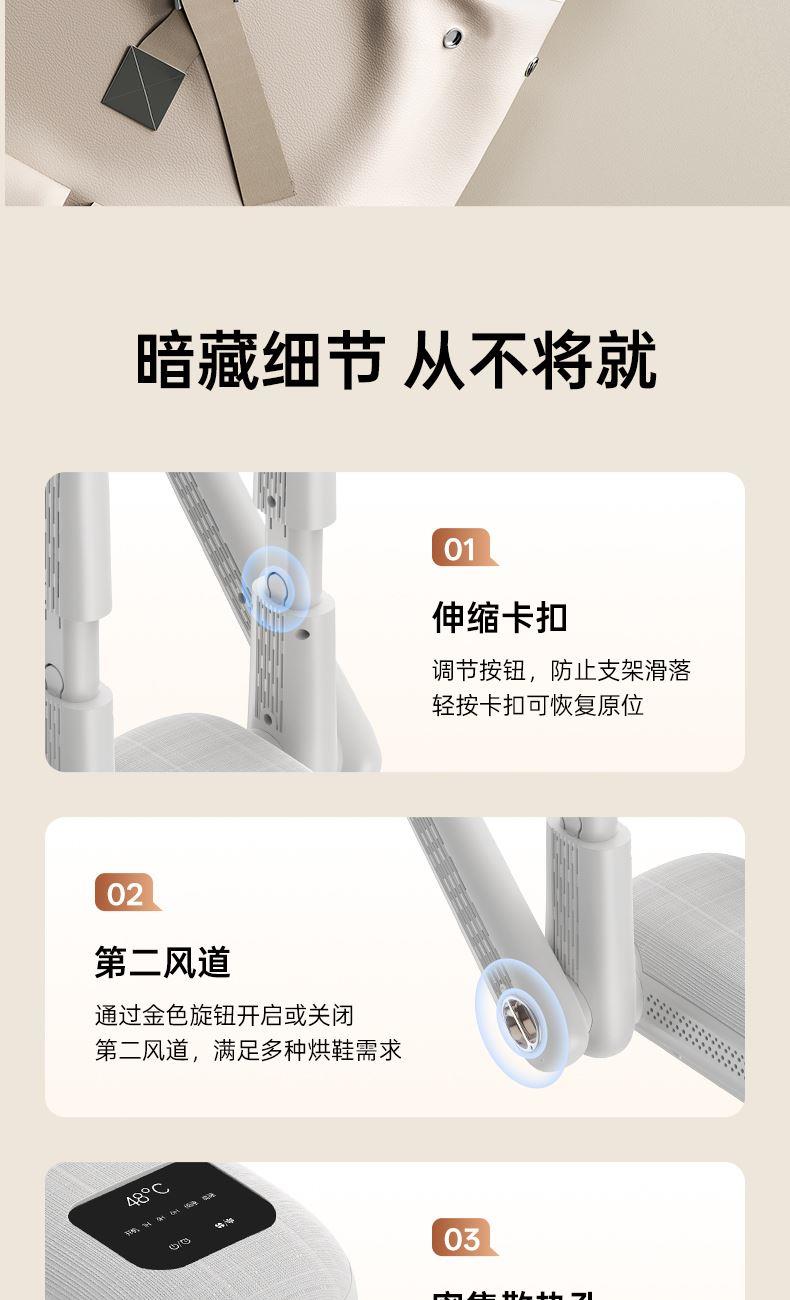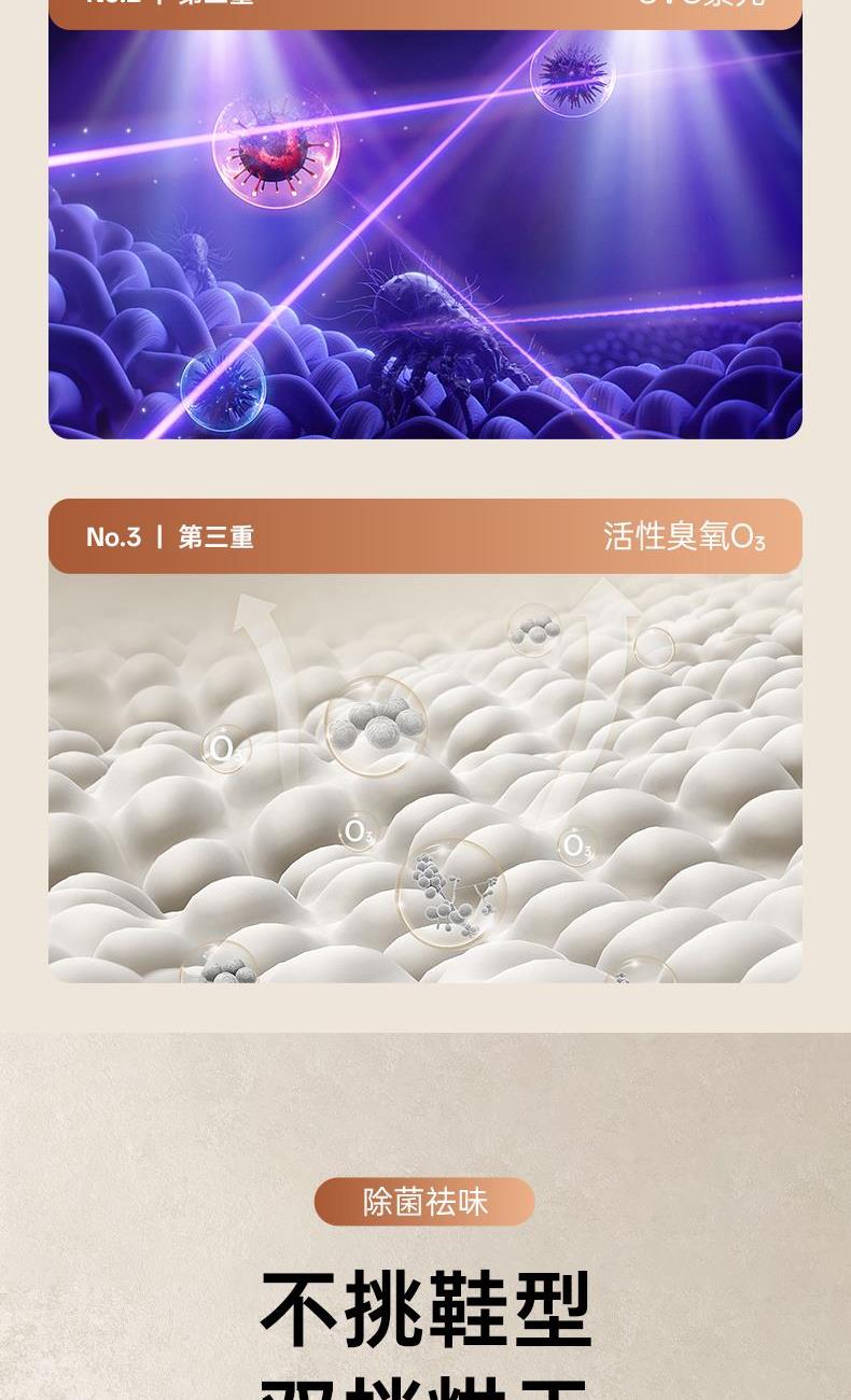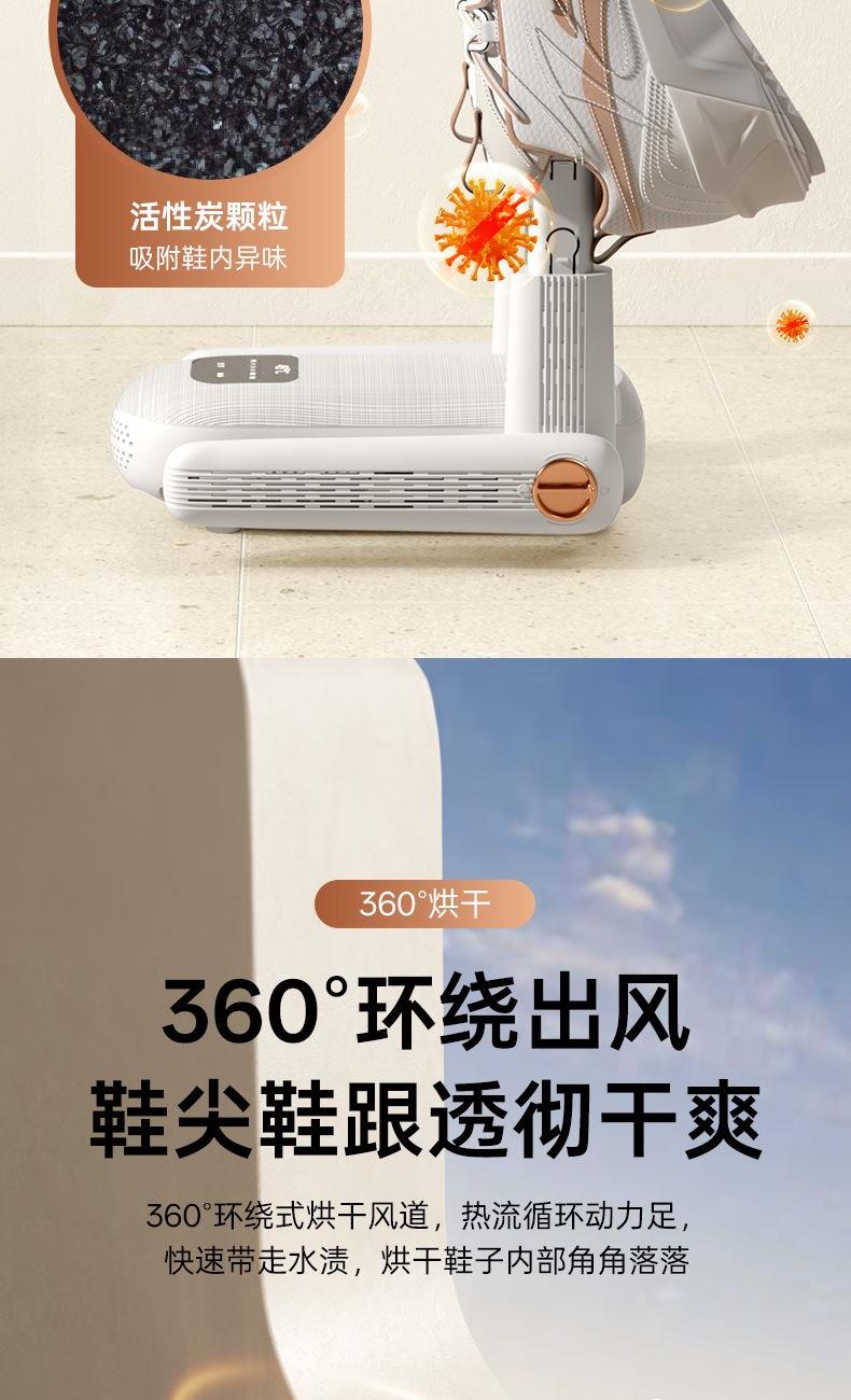 10分钟闪烘 速干,一次可以烘两双,密集出风孔设计,优化风道,实现360度环绕出风,鞋跟不漏烘, 风道自由切换,节能更高效,