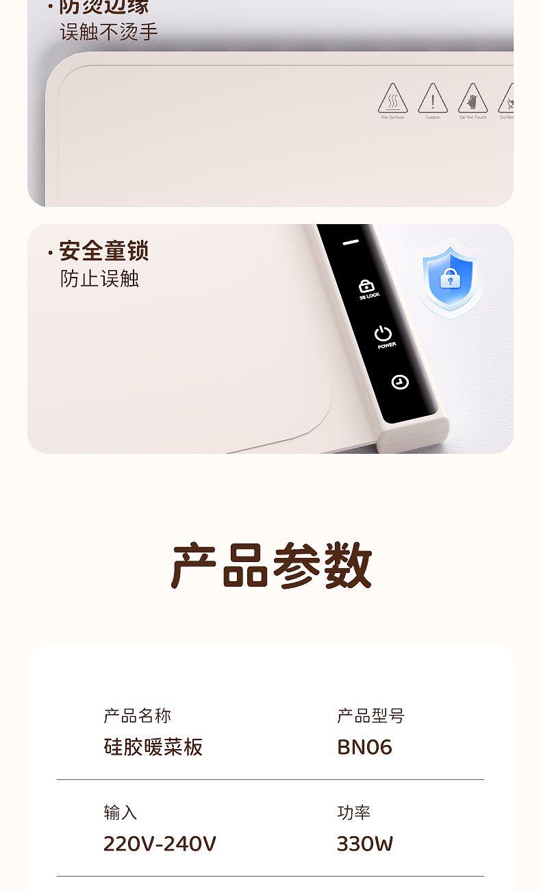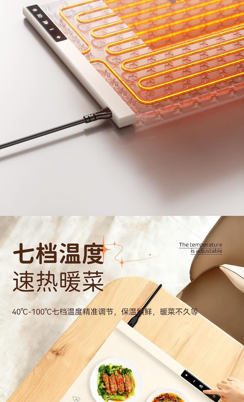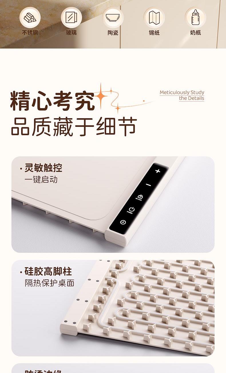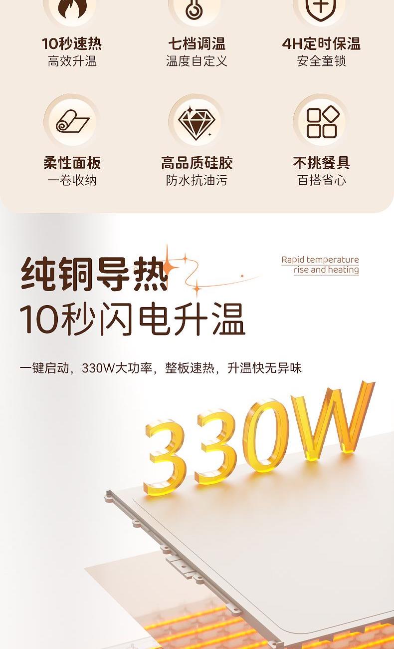 7档调温,定时通缩,整板速热,灵敏触控,一键启动,硅胶高脚柱,