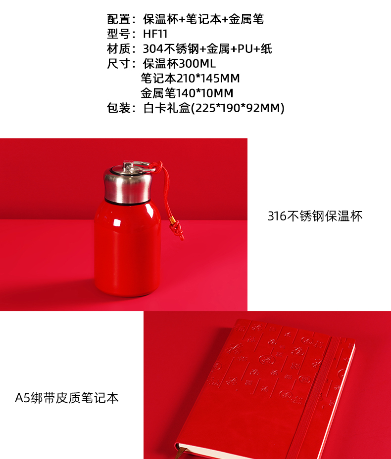 配置:保温杯+笔记本+金属笔 型号:NF11 材质:304不锈钢+金属+PU+纸 尺寸:保温杯300mL 笔记本210*145mm 金属笔140*10mm 包装:白卡礼盒(225*190*92mm)