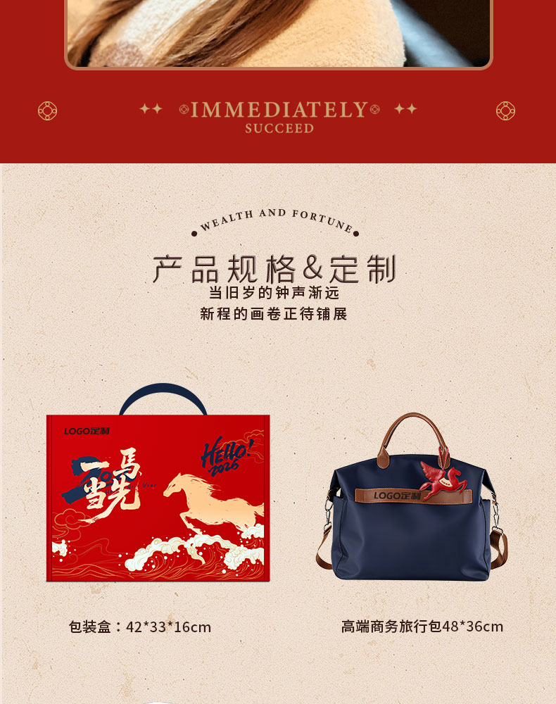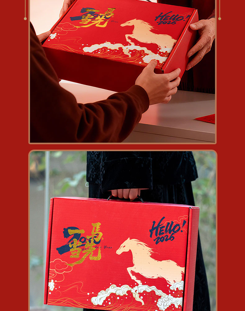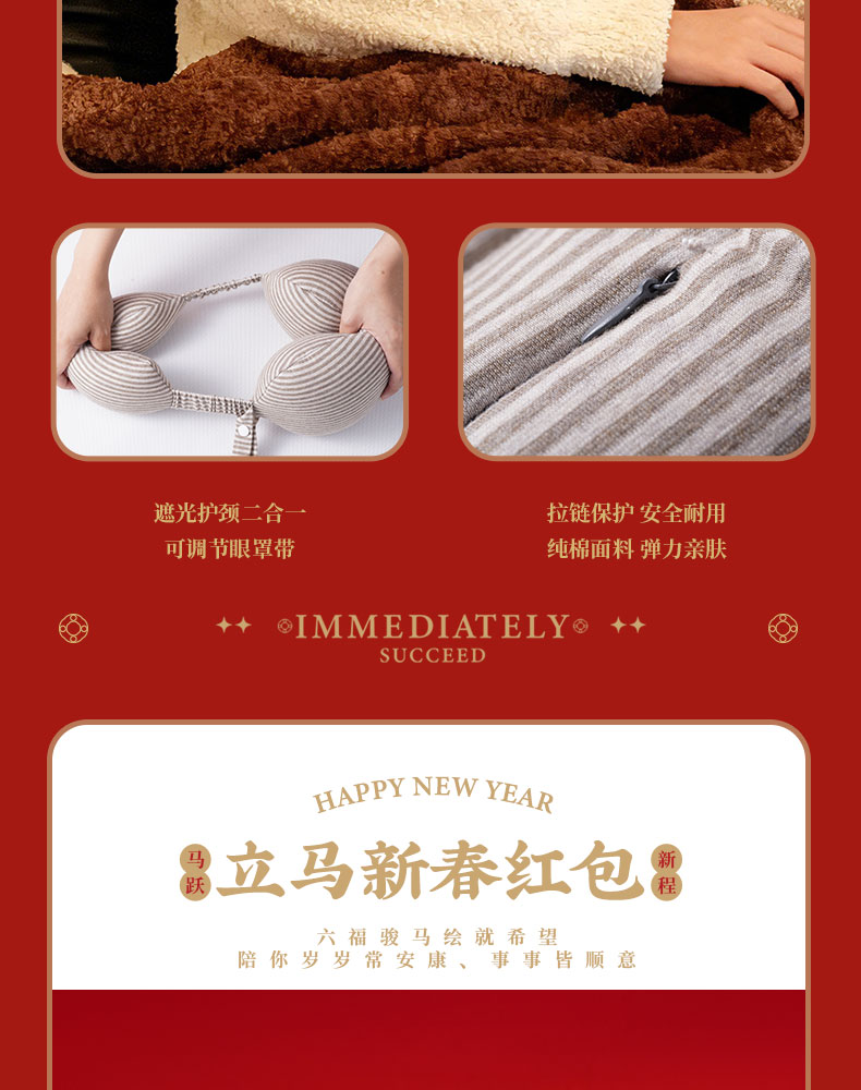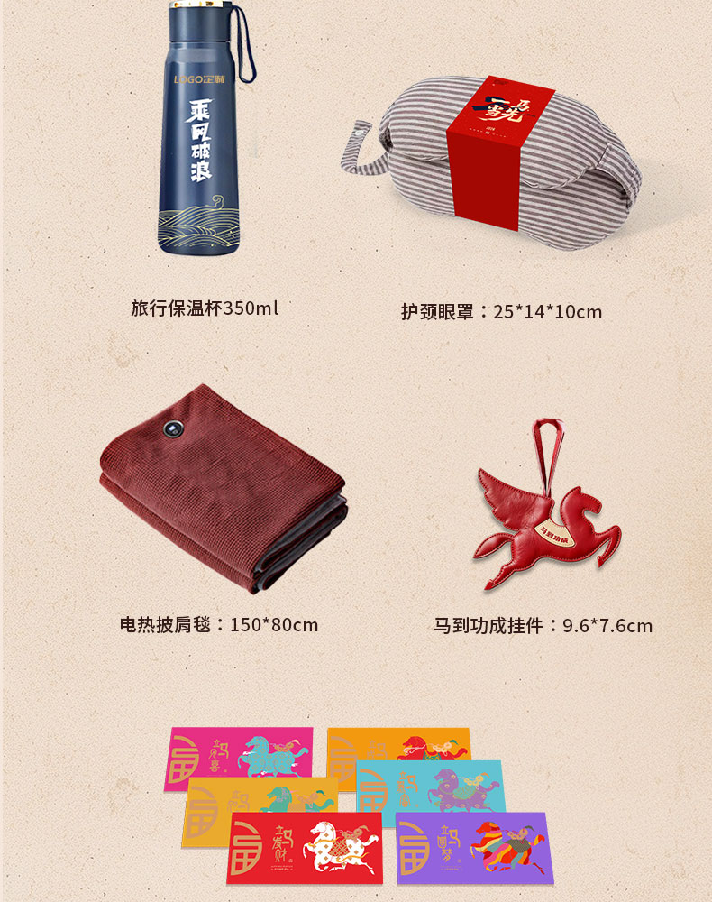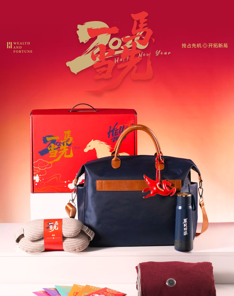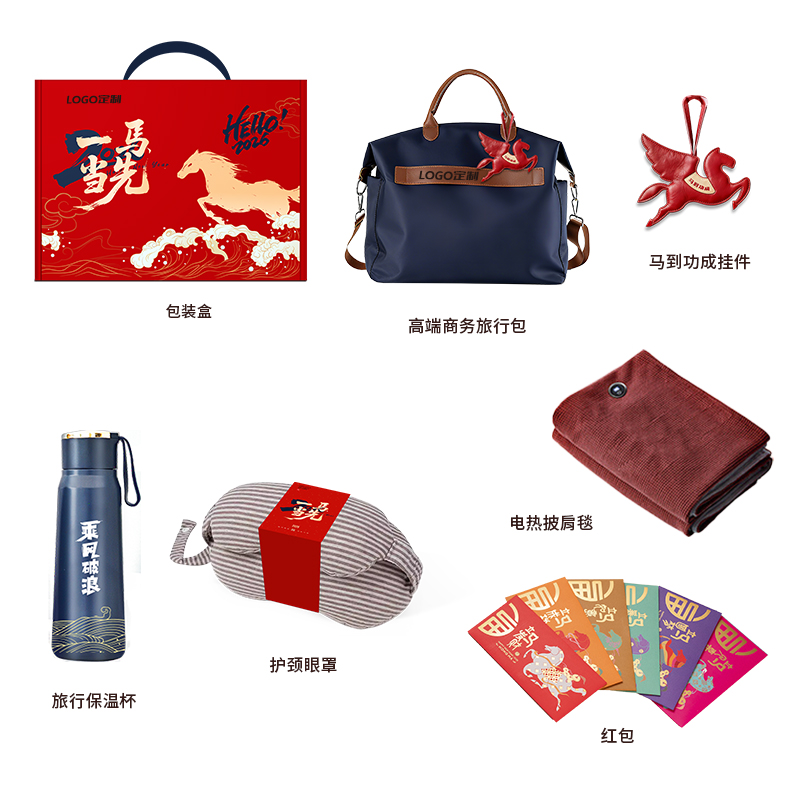 • 商务旅行包装下出行所需 • 专属飞马钥匙扣挂于包上,每一次出发都有好运随行; • 乘风破浪保温杯,旅途中总有暖意相伴; •加热毛毯披肩,是关怀的核心——它不止是抵御寒意的物件,更是企业把“心疼你旅途辛苦”的心意织进面料里 •多功能呵护眼罩与枕颈,缓解奔波疲惫,让每段旅程都有舒适依靠 • 6个红包藏满新年期许