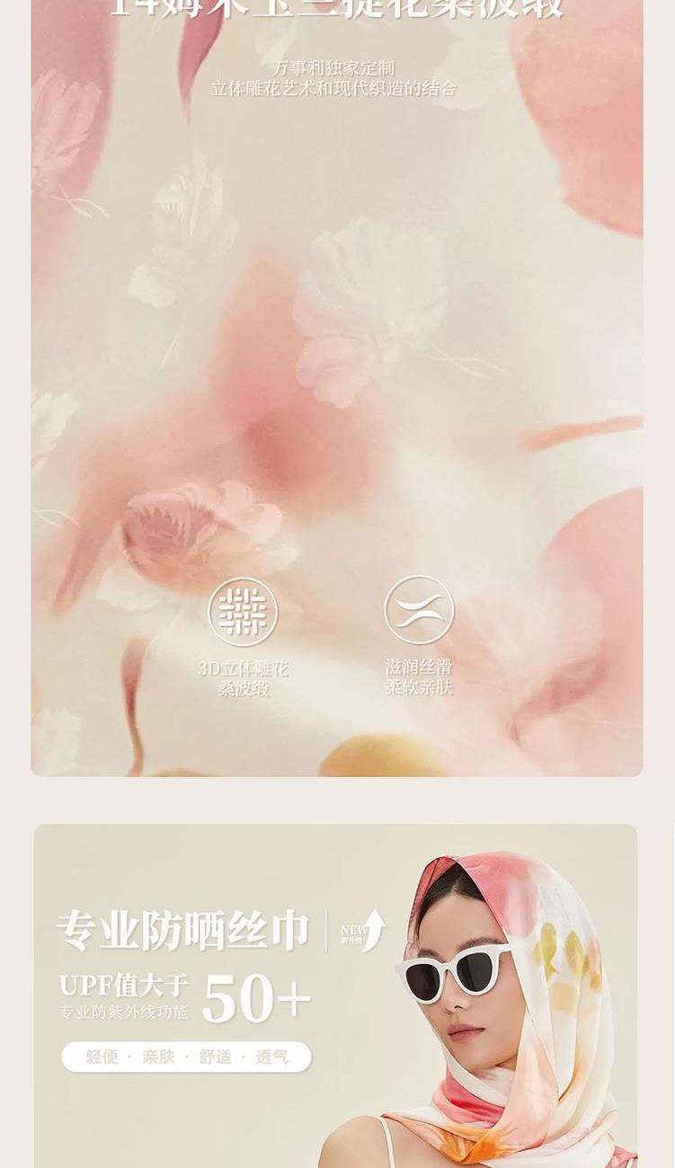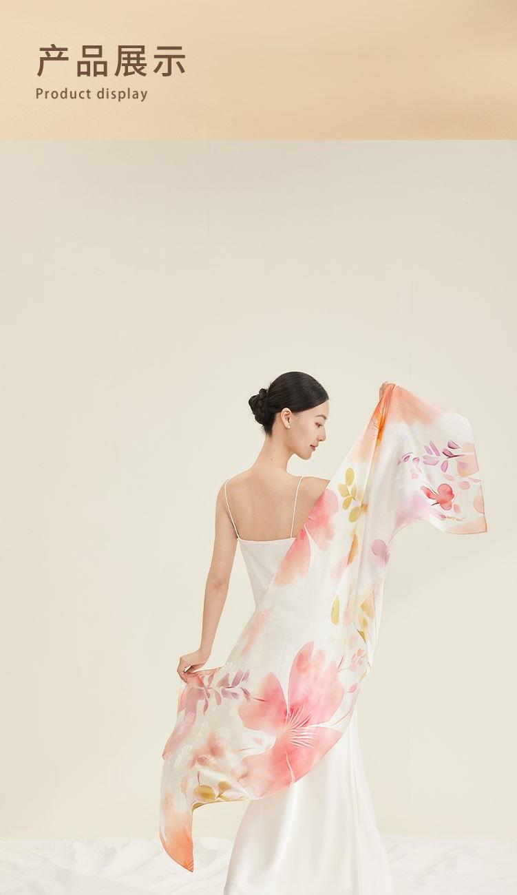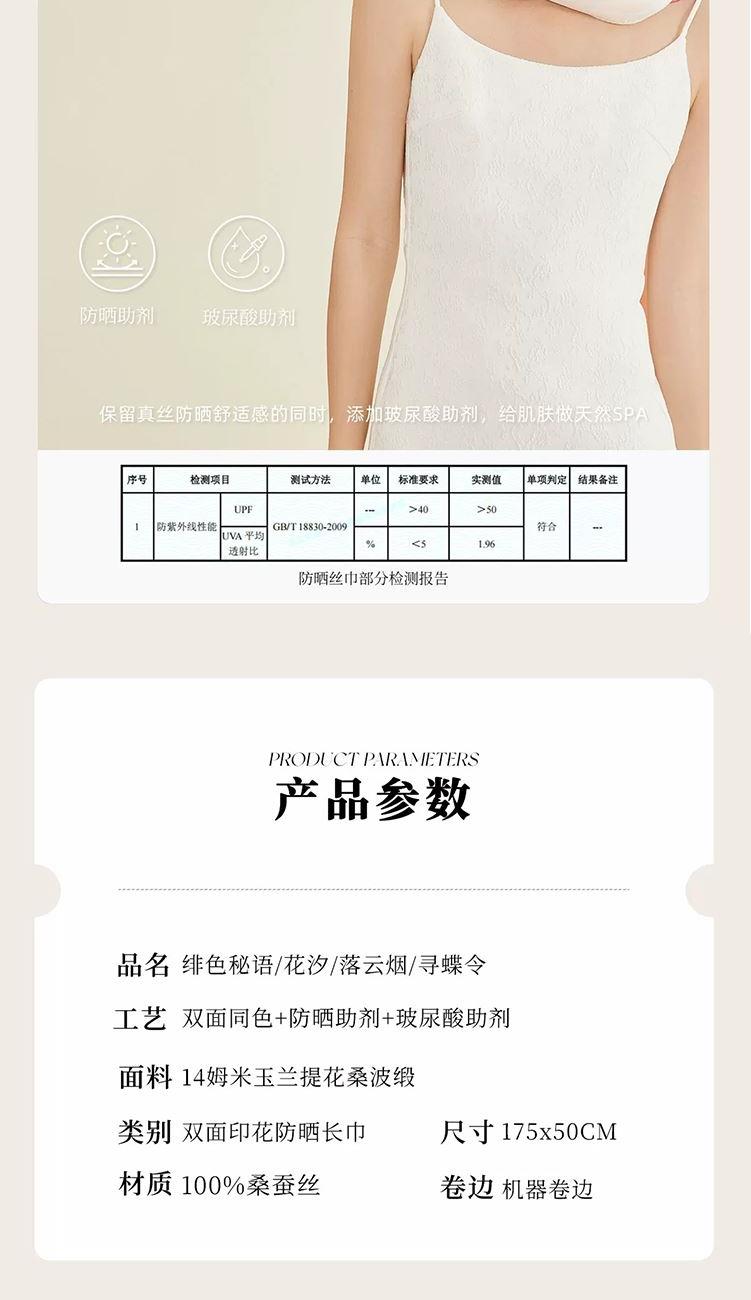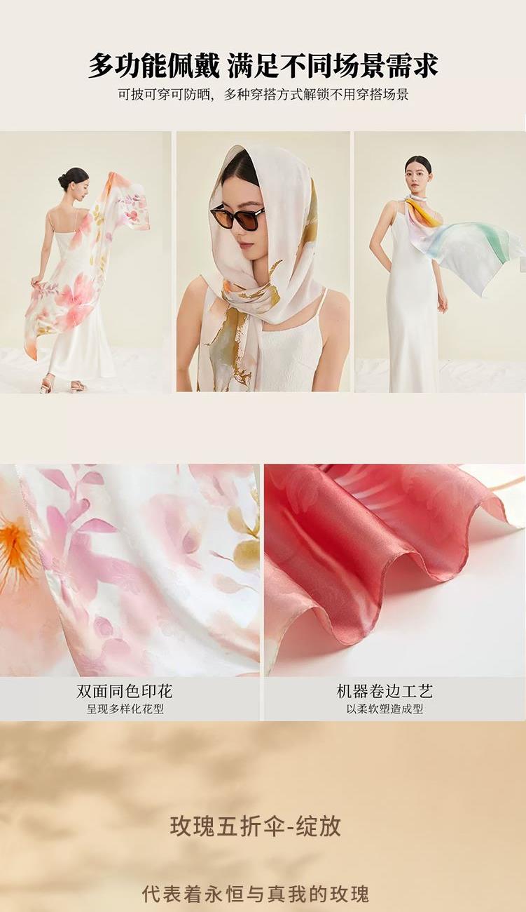 内含: 双面印花防晒长巾-1条 (四款任选一条) 玫瑰五折伞-绽放1把 丝巾款式:绯色秘语/花汐/落云烟/寻蝶令 工艺:双面同色+防晒助剂+玻尿酸助剂 面料:14姆米玉兰提花桑波缎 尺寸:175x50CM 材质:100桑蚕丝 卷边:机器卷边