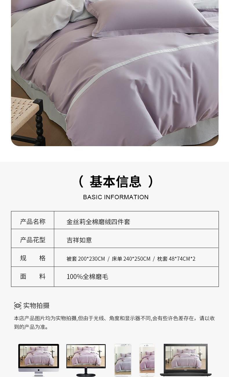 花 型:吉祥如意 面 料:全棉磨毛 规 格:被套200×230cm 床单240×250cm 枕套48×74cm×2 全棉磨绒、告别寒冷、高支高密柔软织绒,采用轻磨毛工艺,在织物表面形成一层短密齐整的绒毛,触感柔软,快速发热的保暖效果,增加了面料的保暖性和舒适性
