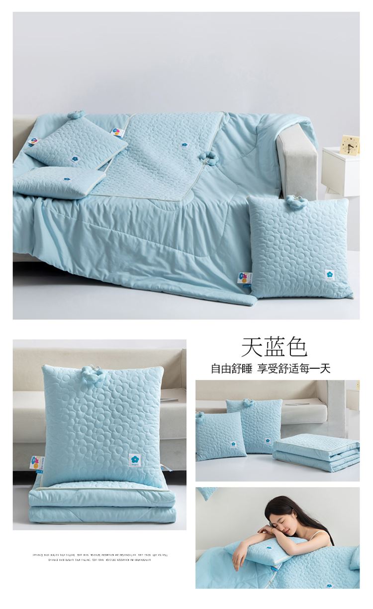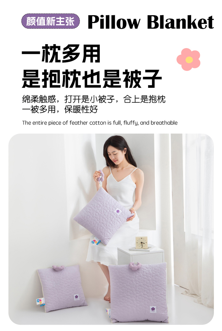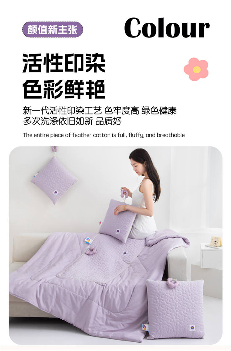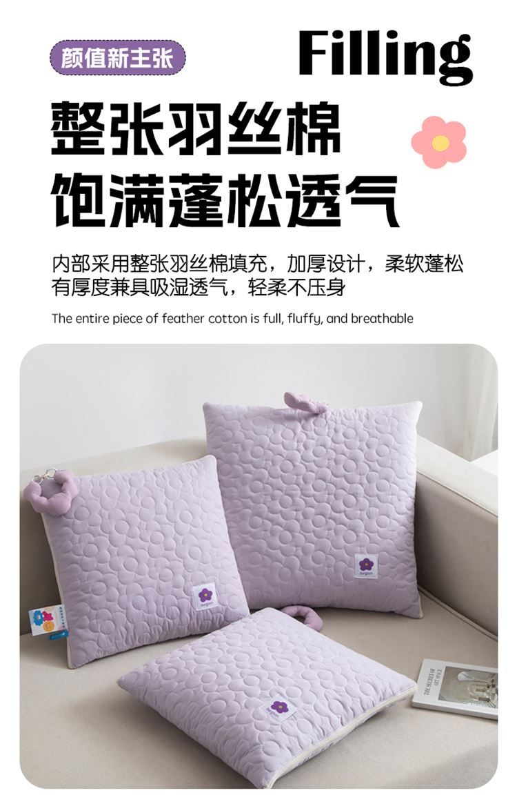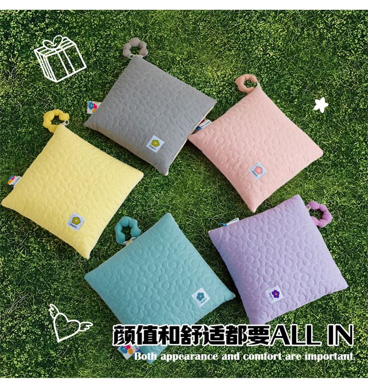 全棉面料具有保暖舒适、蓬松透气、吸湿排汗、亲肤舒适不过敏等特点! 独具匠心的制作工艺别出心裁的设计理念!新款提手可以随意拆卸,方便携带收纳! 面料:全棉 填充:整张羽丝棉 工艺:多针绗缝+单针锁棉 尺寸:40*40cm 打开110*150cm
