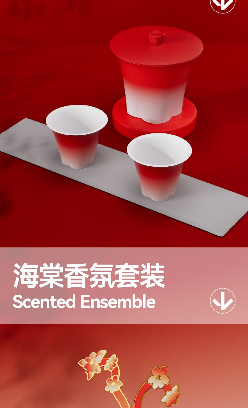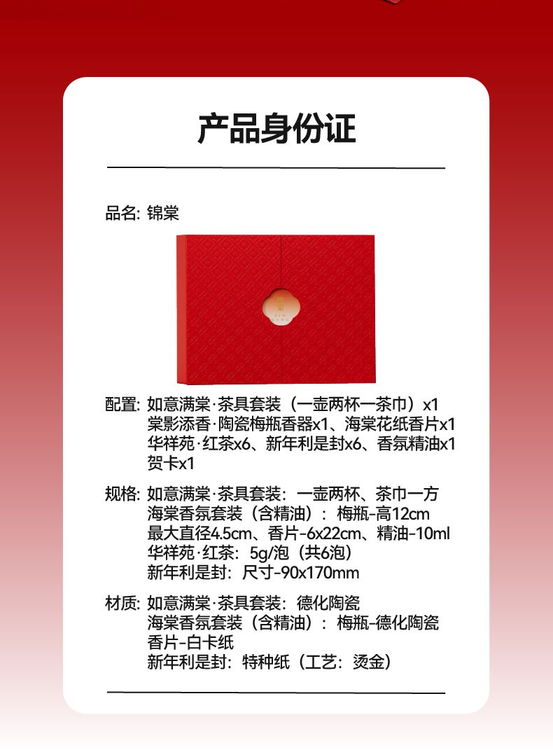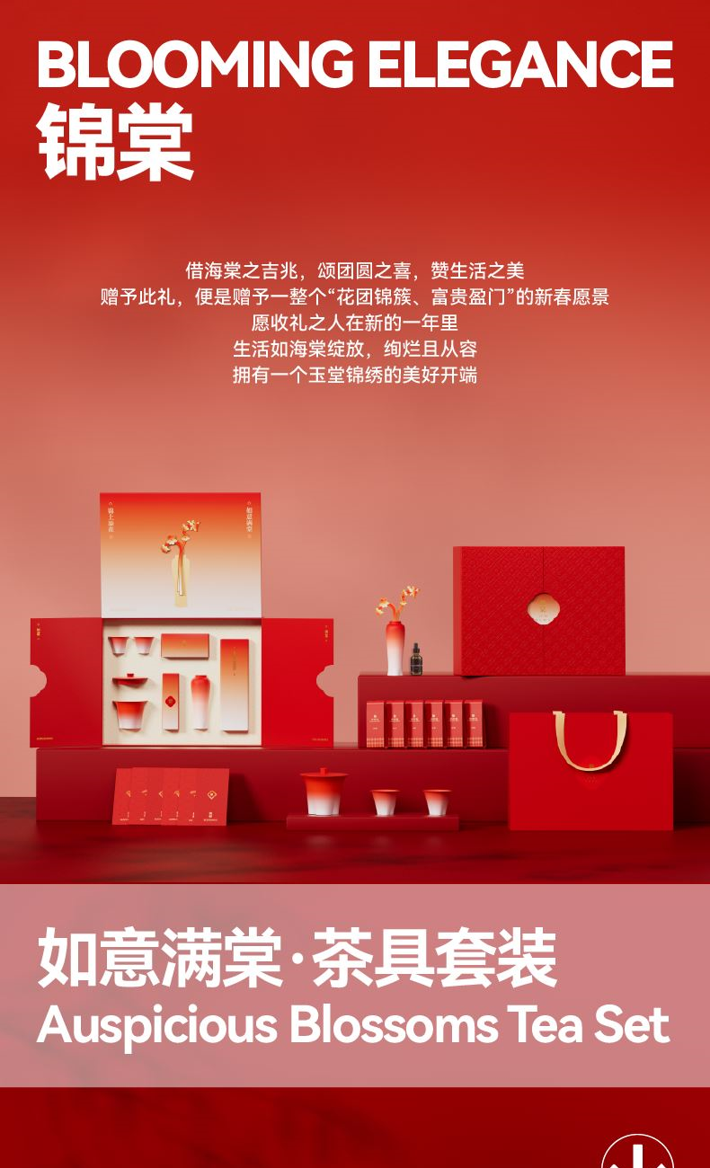 灵感撷取自东方古典文化意象——海棠。海棠,自古便是“富贵满堂”、“玉堂富贵”的吉祥符号。其花姿潇洒,花开似锦,被誉为“花中神仙”,恰如其分地映照了新春佳节对家庭团圆、生活富足、前程锦绣的集体向往。 设计以现代笔触,重新勾勒传统海棠纹样,将其贯穿于礼盒的每一处细节。这不仅是纹样的复刻,更是一种文化符号的当代转译,意在将那份根植于血脉中的、对“繁花似锦”的祝福,融入当代生活的仪式场景之中。 礼盒选品融合视觉、触觉、嗅觉与味觉等多感体验,借海棠之吉兆,颂团圆之喜,赞生活之美。赠予此礼,便是赠予一整个“花团锦簇、富贵盈门”的新春愿景,愿收礼之人在新的一年里,生活如海棠绽放,绚烂且从容,拥有一个玉堂锦绣的美好开端。 礼盒配置 精装礼盒&手提袋 x1、如意满堂·茶具套装(一壶两杯一茶巾)x1 棠影添香·陶瓷梅瓶香器x1、海棠花纸香片x1、香氛精油x1 华祥苑·红茶x6、利是封x6、贺卡x1