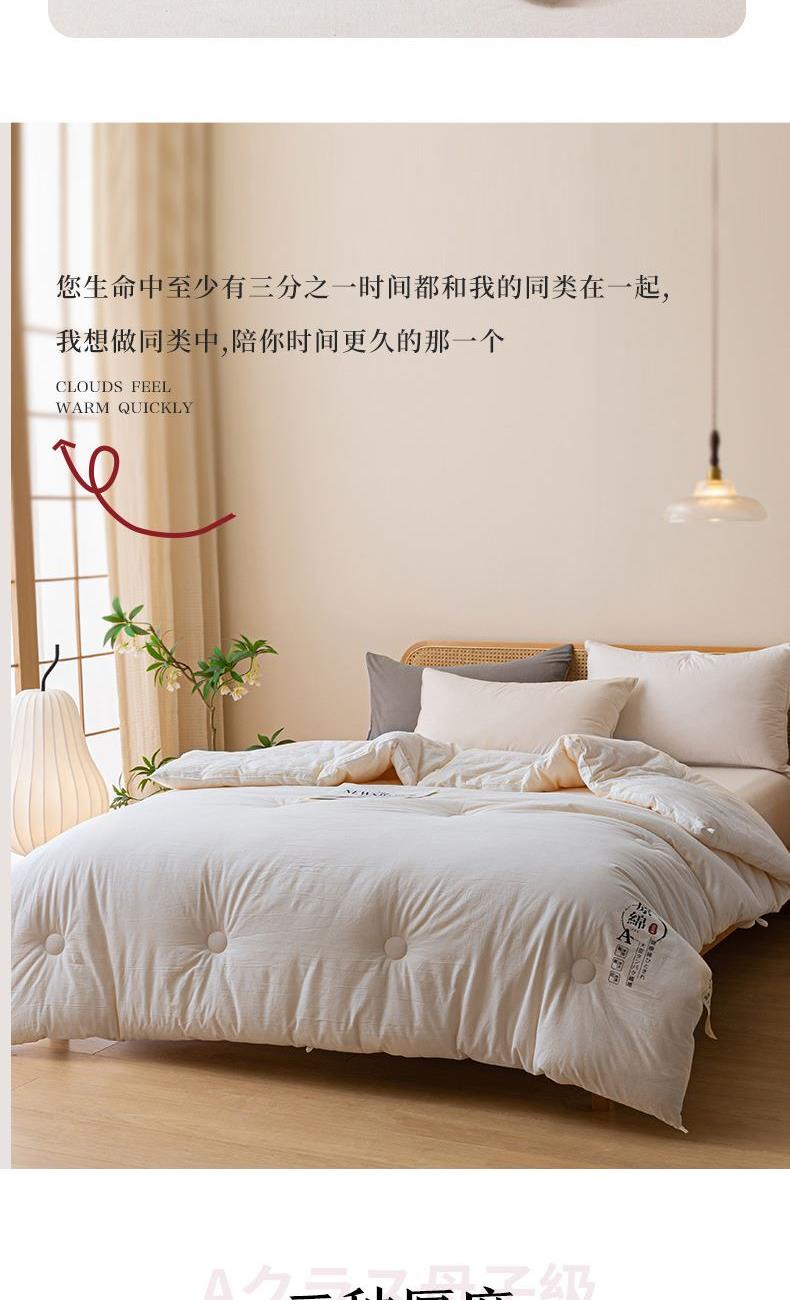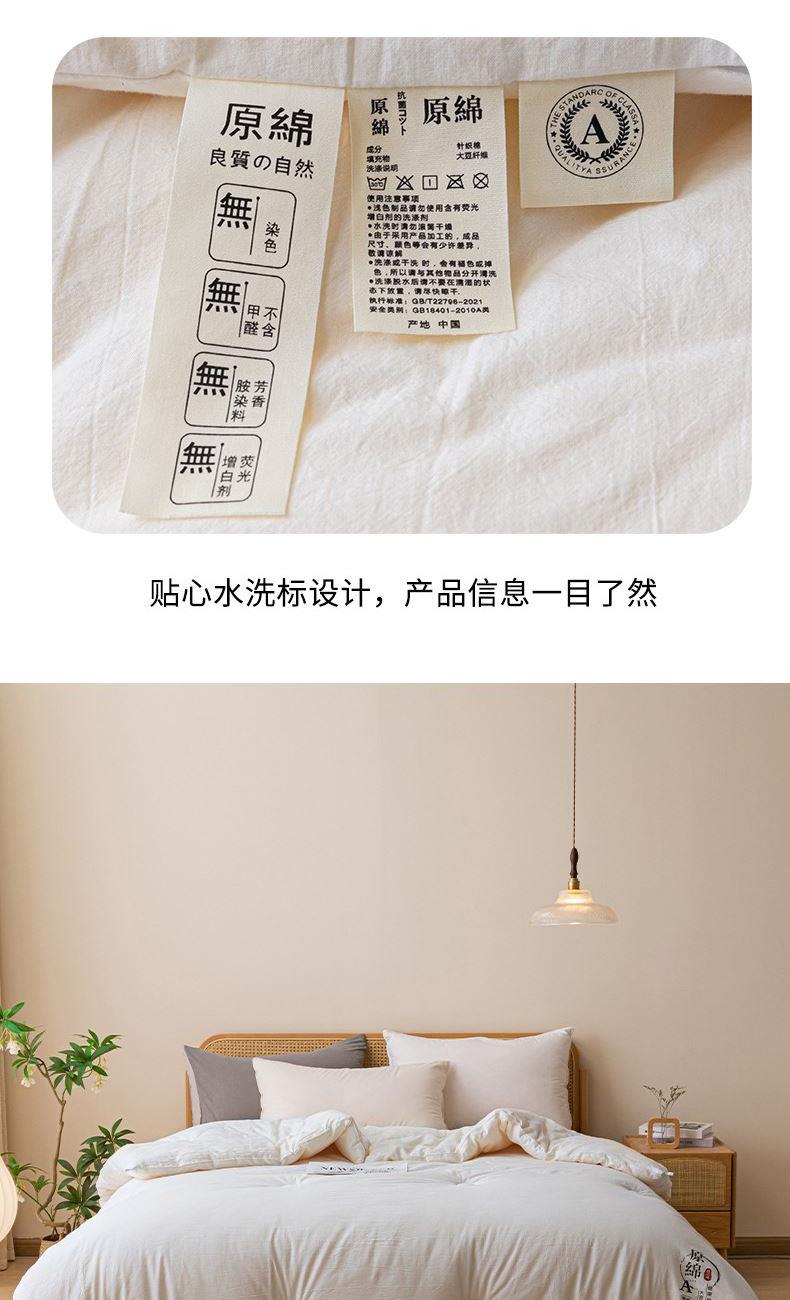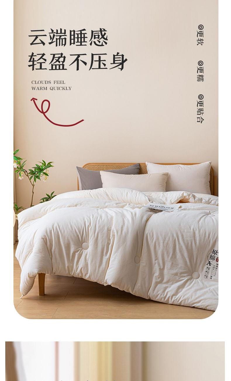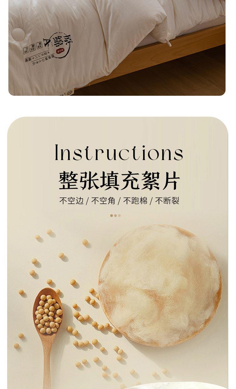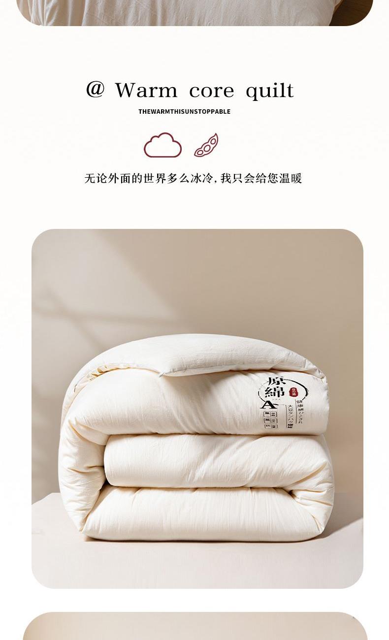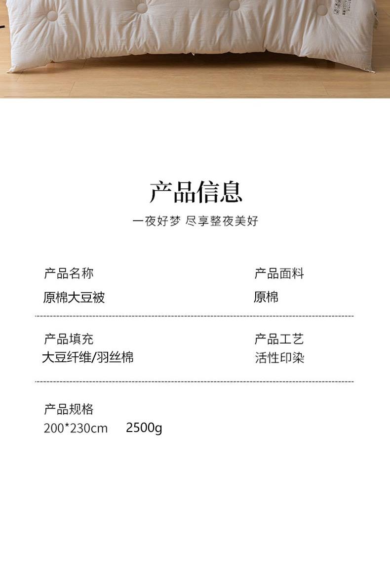 产品规格:200*230 cm*1 面料成份:原棉 填 充 物:大豆纤维/羽丝棉 克 重:2500g 产品说明:亲肤原棉面料,面料手感柔软细腻,适合贴身裸睡回归自然,亲和肌肤。 大豆纤维与羽丝棉的科学搭配,软糯棉柔,舒肤不压身。