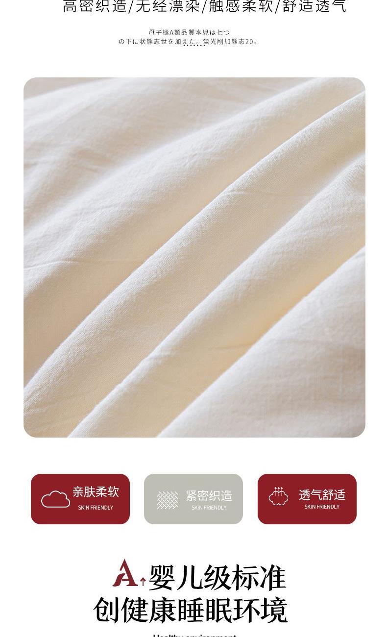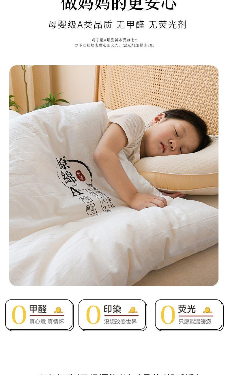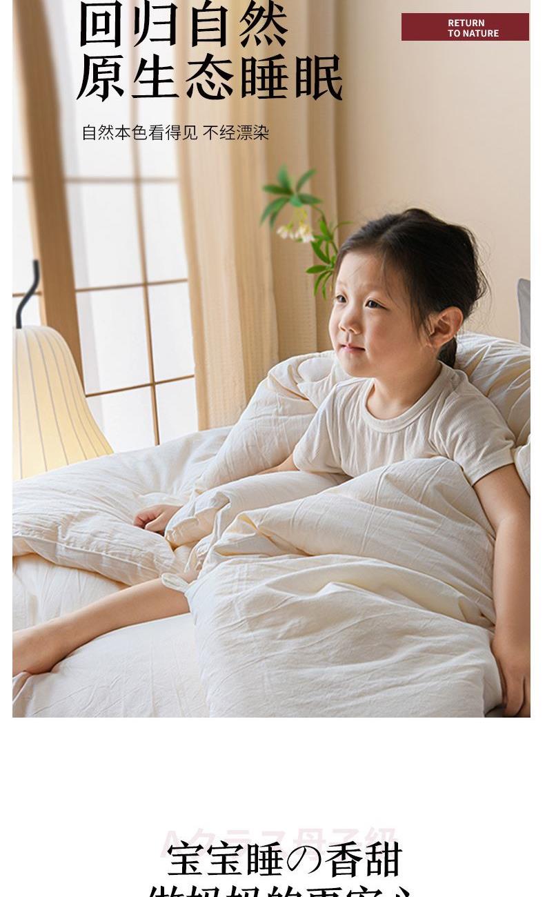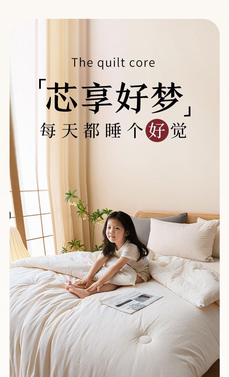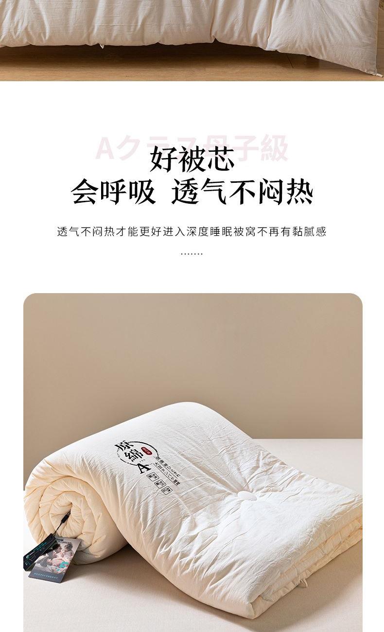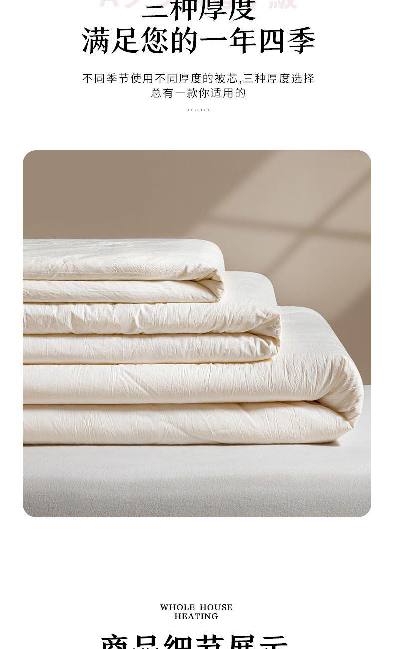 产品规格:200*230 cm*1 面料成份:原棉 填 充 物:大豆纤维/羽丝棉 克 重:2500g 产品说明:亲肤原棉面料,面料手感柔软细腻,适合贴身裸睡回归自然,亲和肌肤。 大豆纤维与羽丝棉的科学搭配,软糯棉柔,舒肤不压身。
