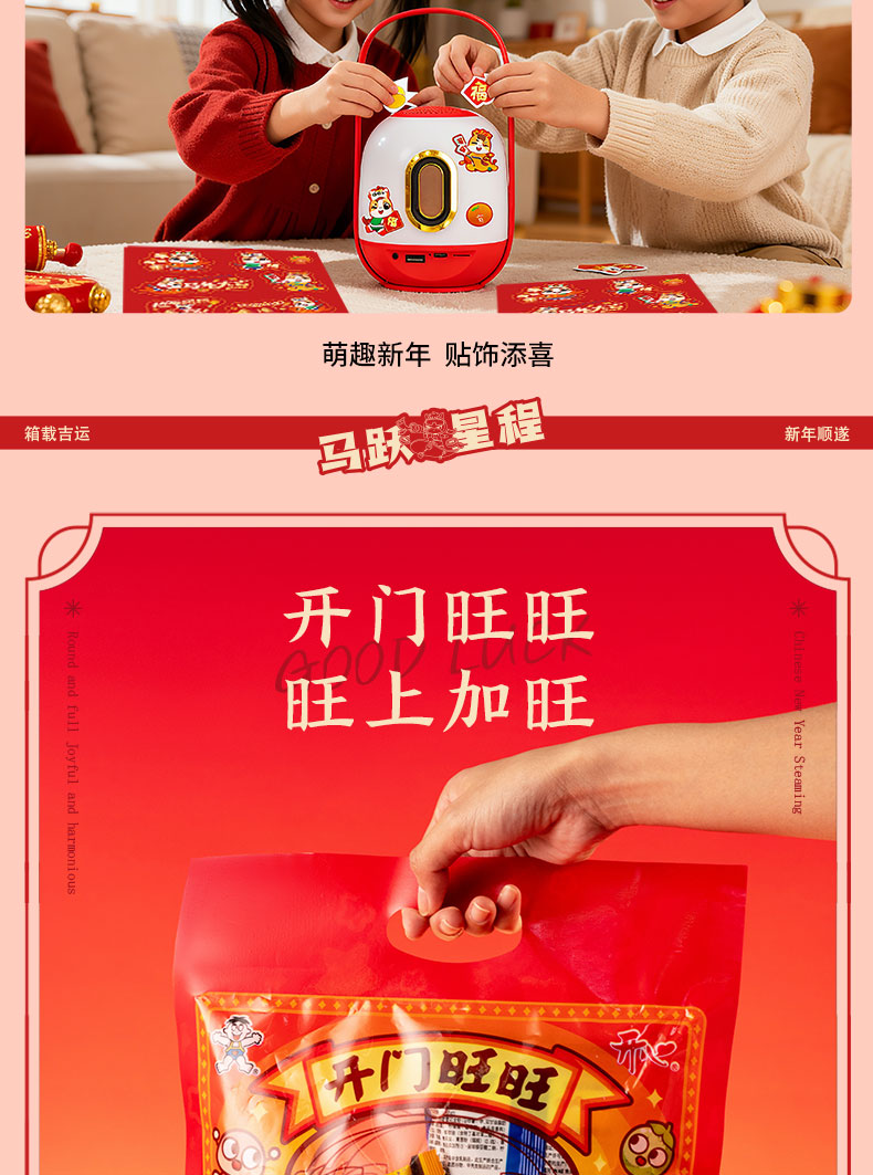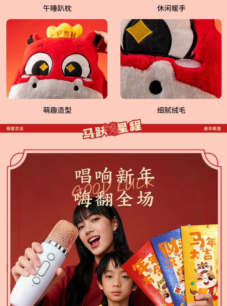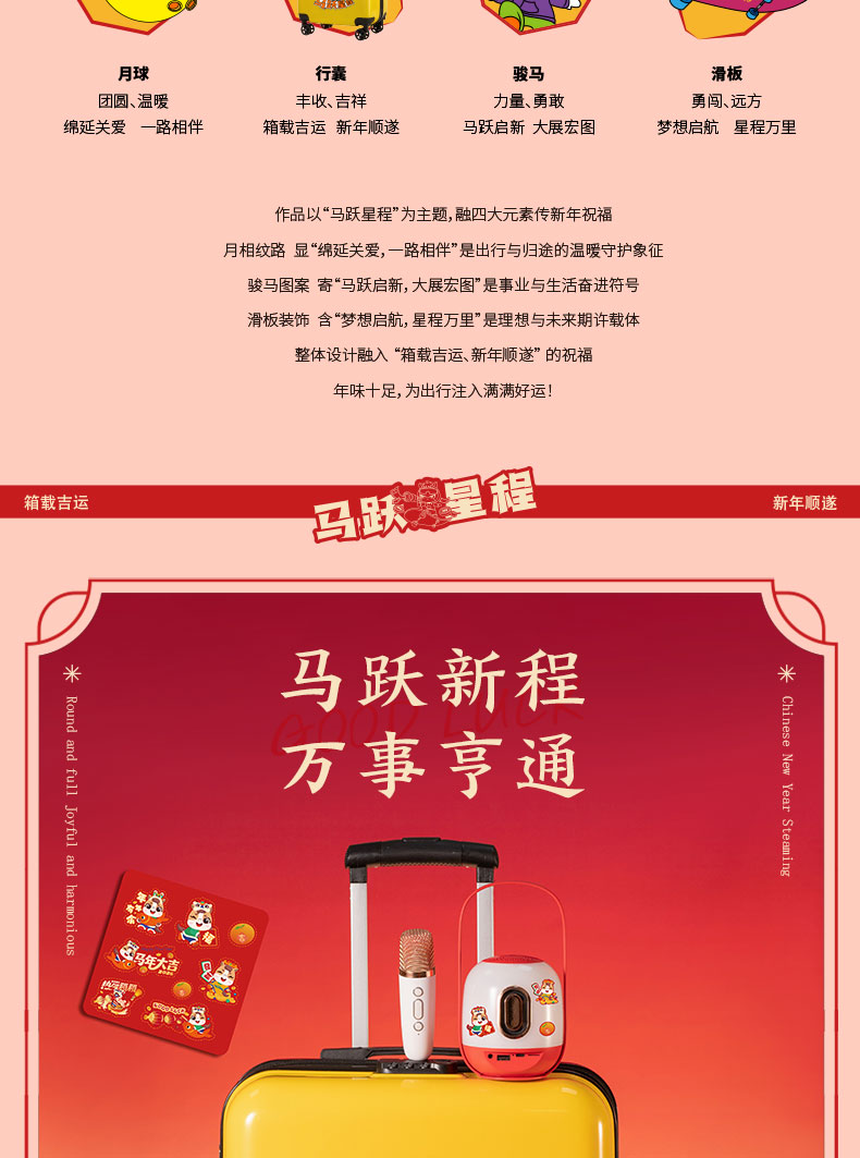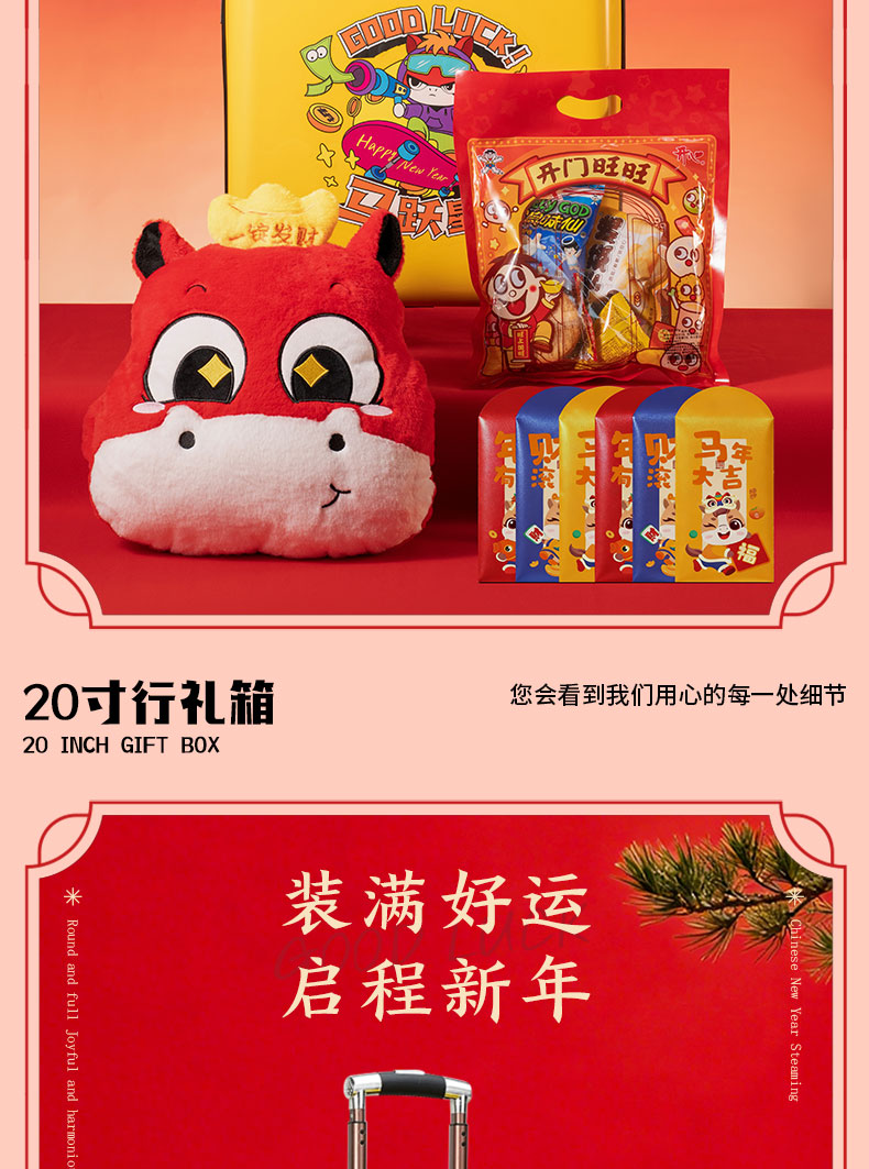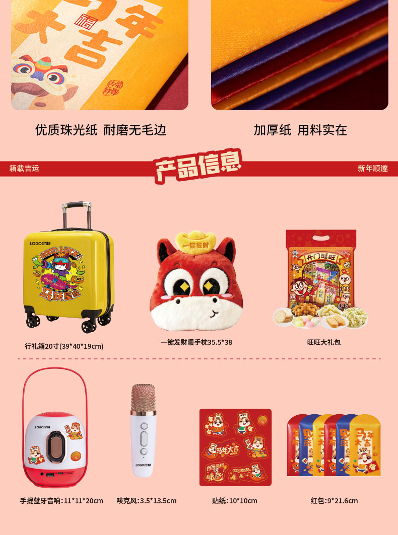 产品配置:20寸行李箱、多功能蓝牙音响加氛围灯加唛、旺旺大礼包147G、一锭发财抱枕、马年大吉红包*6个