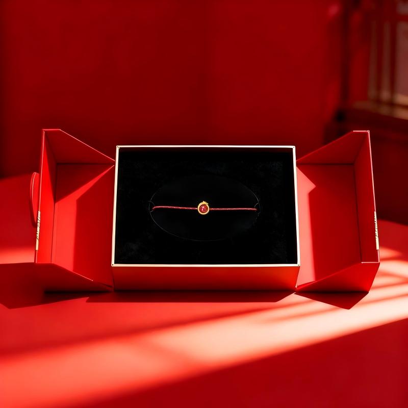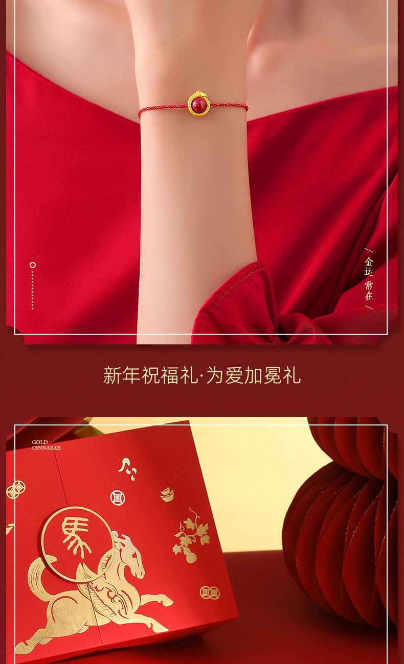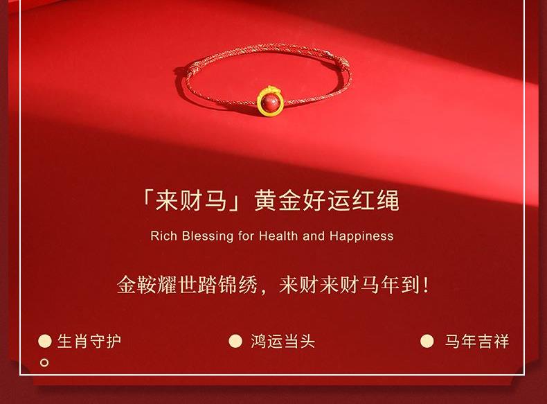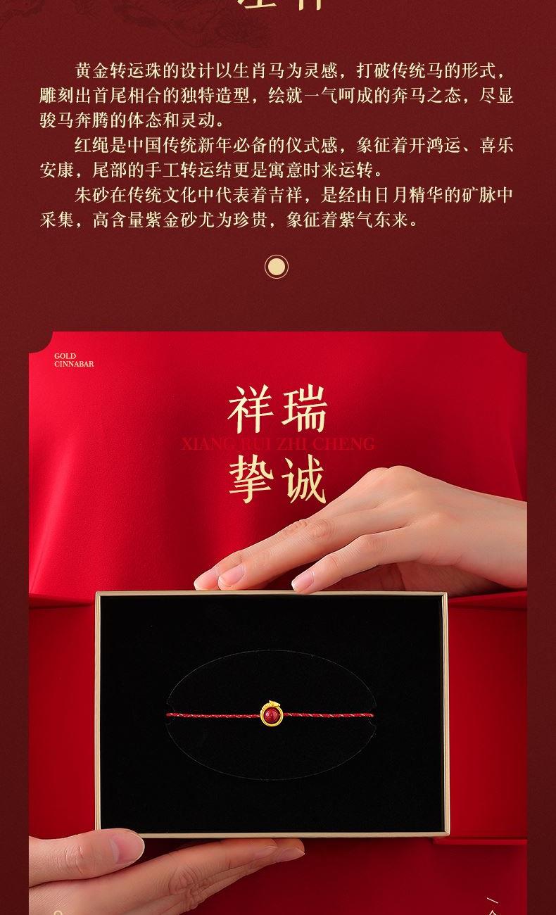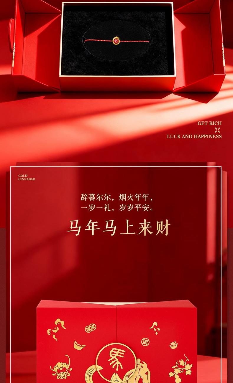 产品配置: 1转运珠红绳手串.x1个 2.质检证书x1张 3.精美包装x1个 4.手提袋x1个 5.贵金属规格:足金999 0.3g 来财马 黄金转运珠红绳,选高含量朱砂为主石 搭配定制的手工编织红金手绳,寓意鸿运当头 马上来财。礼盒延续了经典的红色对开礼物盒, 集齐饱含寓意的祥瑞图案,包揽你的一整年好运