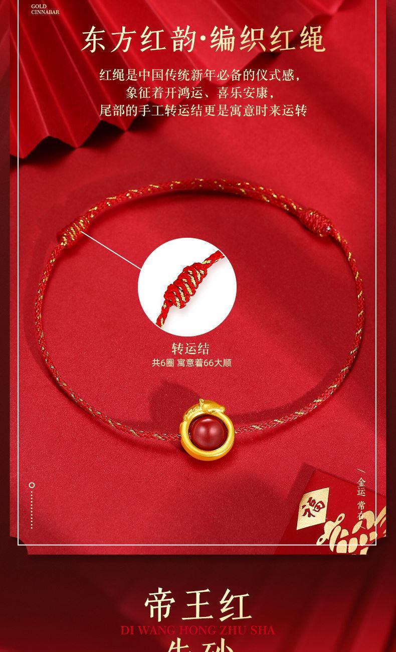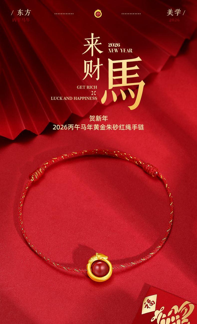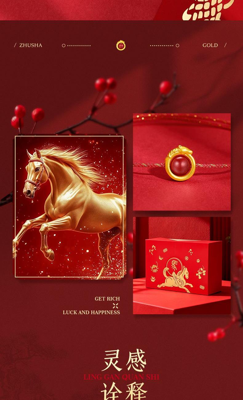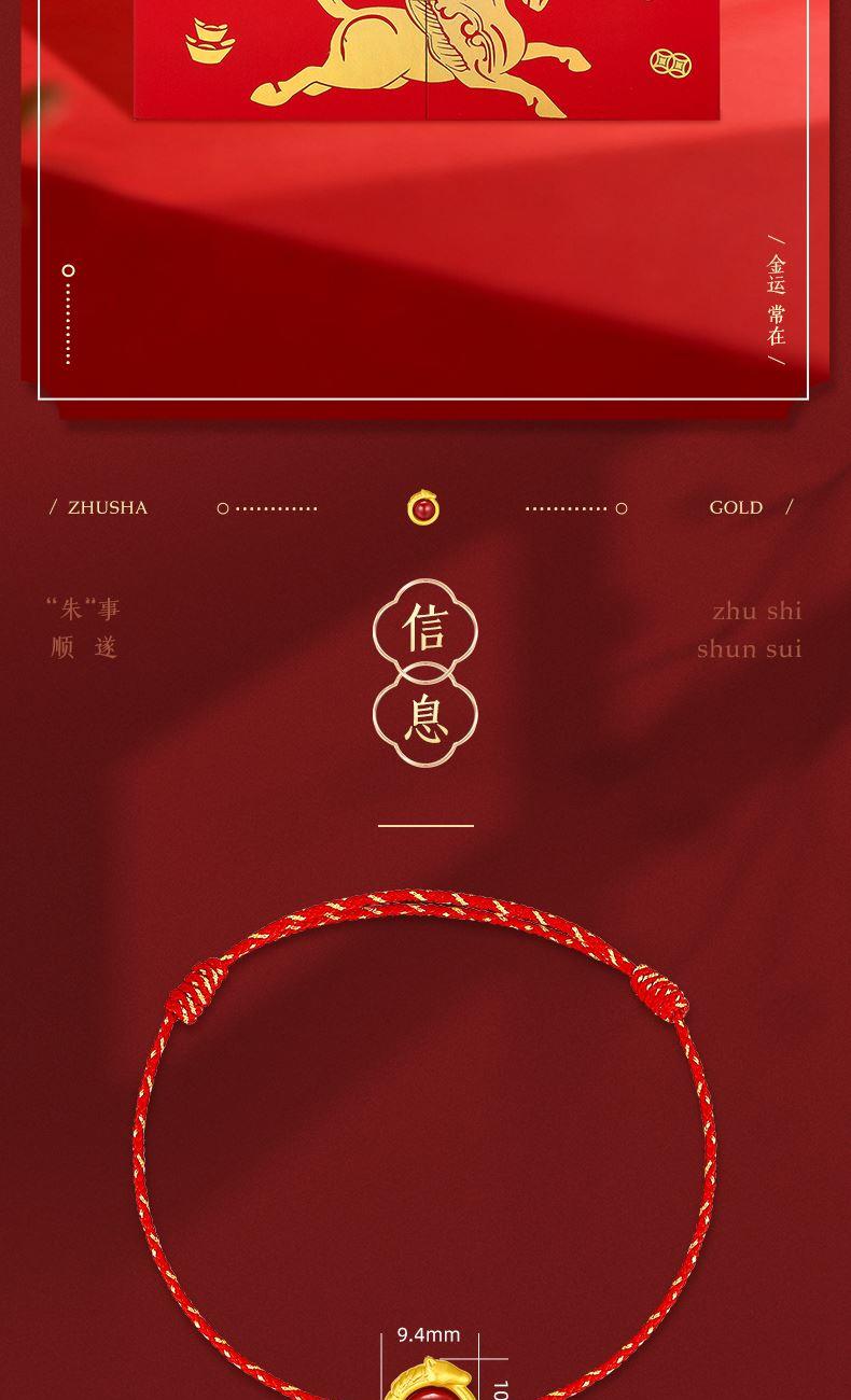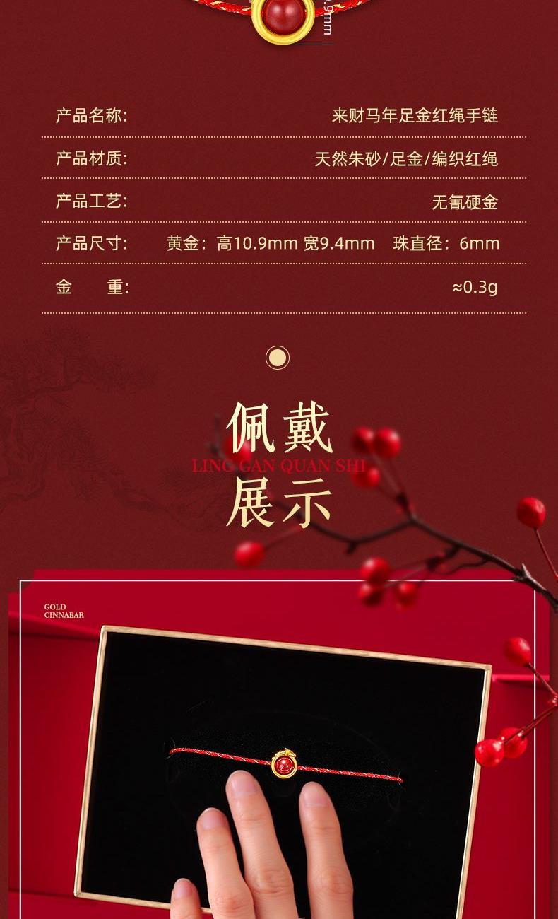 产品配置: 1转运珠红绳手串.x1个 2.质检证书x1张 3.精美包装x1个 4.手提袋x1个 5.贵金属规格:足金999 0.3g 来财马 黄金转运珠红绳,选高含量朱砂为主石 搭配定制的手工编织红金手绳,寓意鸿运当头 马上来财。礼盒延续了经典的红色对开礼物盒, 集齐饱含寓意的祥瑞图案,包揽你的一整年好运