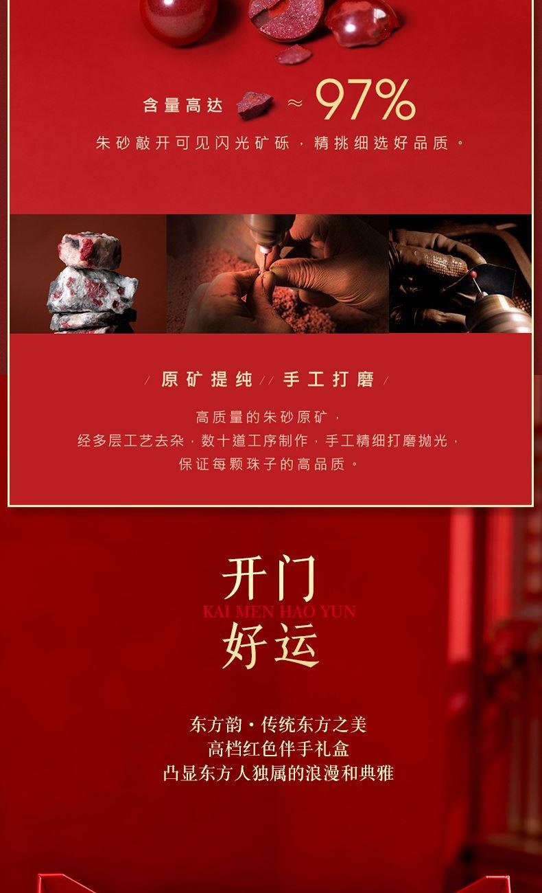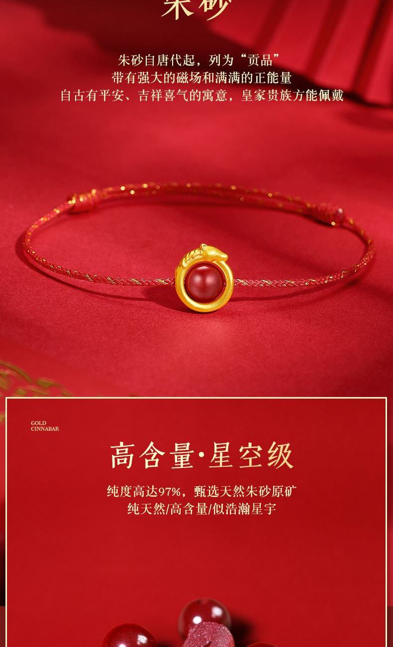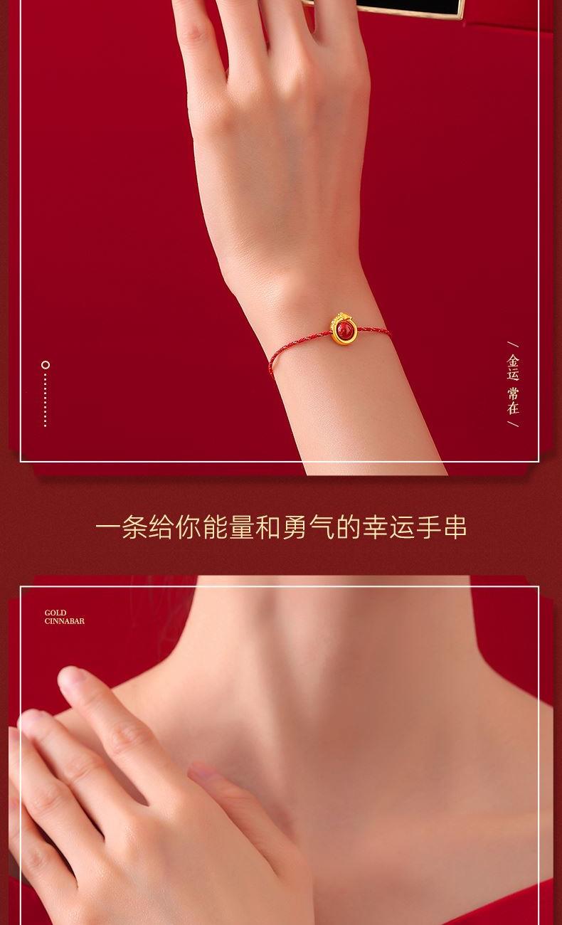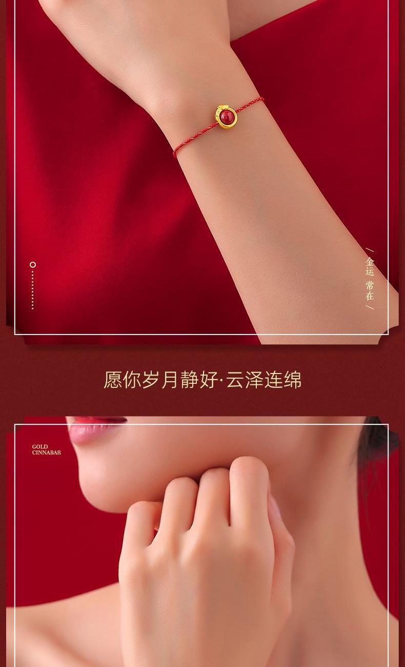 产品配置: 1转运珠红绳手串.x1个 2.质检证书x1张 3.精美包装x1个 4.手提袋x1个 5.贵金属规格:足金999 0.3g 来财马 黄金转运珠红绳,选高含量朱砂为主石 搭配定制的手工编织红金手绳,寓意鸿运当头 马上来财。礼盒延续了经典的红色对开礼物盒, 集齐饱含寓意的祥瑞图案,包揽你的一整年好运