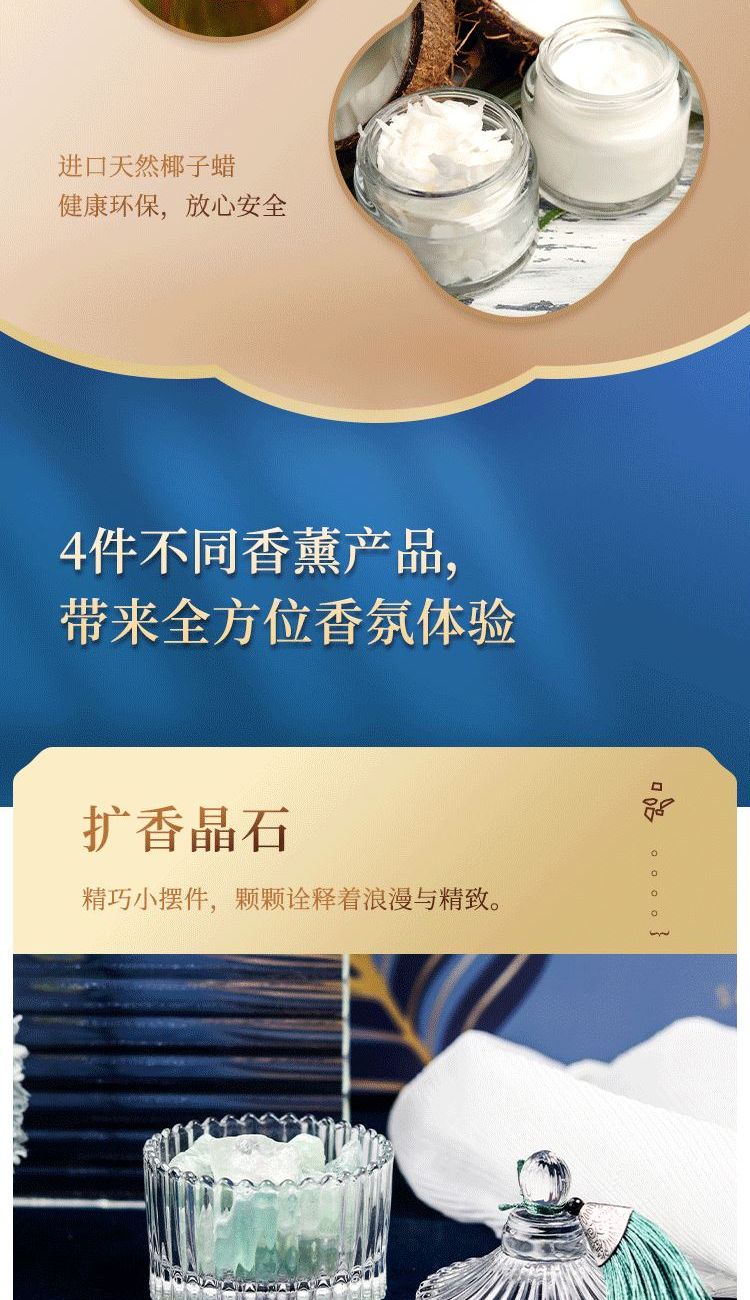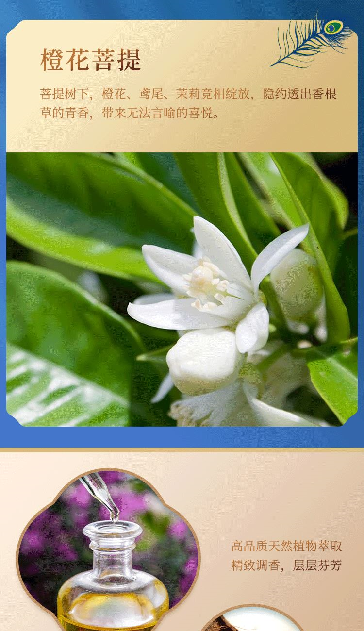 香薰蜡烛 克重: 180g 无火香薰 净含量: 100ml 香薰喷雾 净含量: 100ml 香薰精油 净含量: 10ml 扩香晶石 克重:约150g 橙花菩提 菩提树下 ,橙花、鸢尾、茉莉竞相绽放 ,隐约 透出香根草的青香 ,带来无法言喻的喜悦。