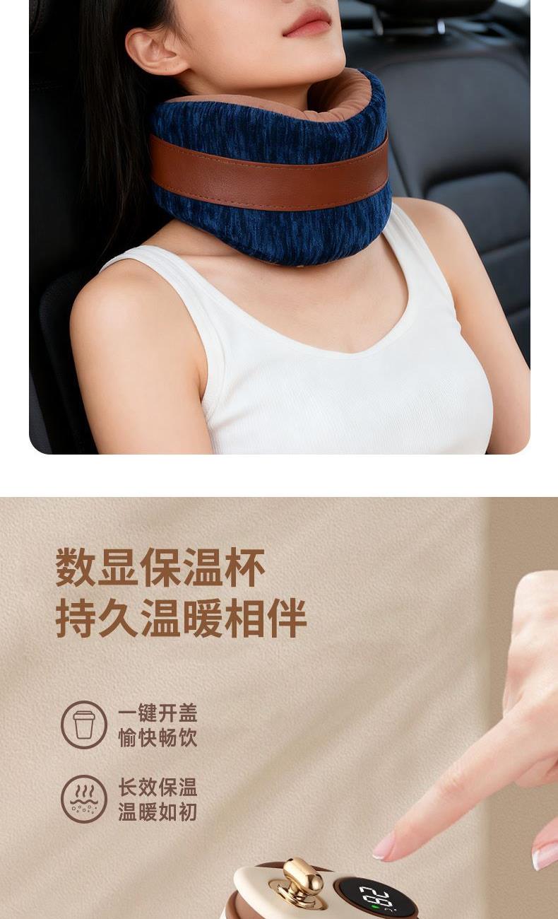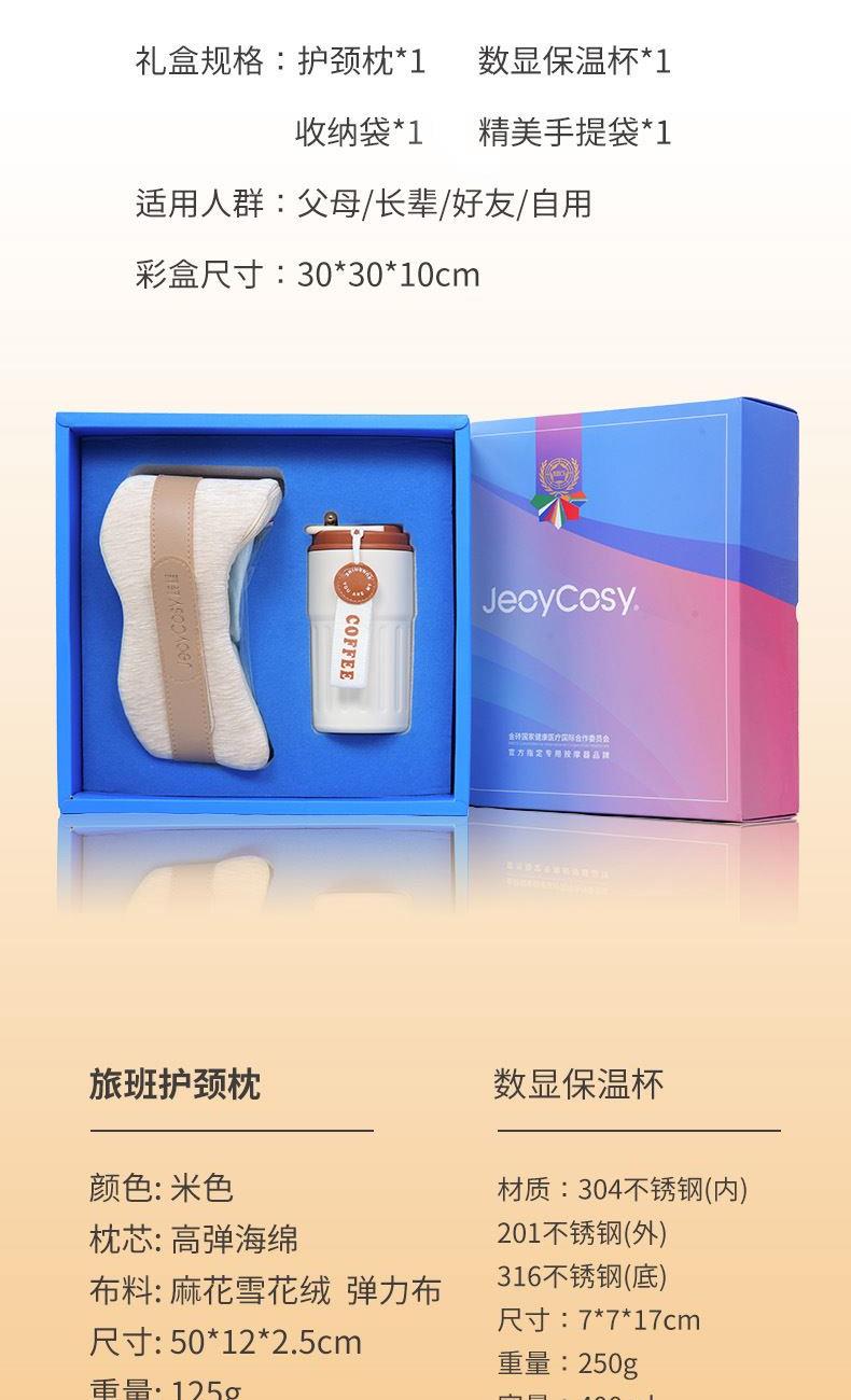 数显保温杯 材质:304不锈钢(内) 201不锈钢(外) 316不锈钢(底) 尺寸:7*7*17cm 重量:250g 容量:400ml 执行标准:GB 4806.9-2016 旅班护颈枕 型号: 5C 枕芯: 高弹海绵 布料: 麻花雪花绒 弹力布 尺寸: 50*12*2.5cm 重量: 125g 执行标准:GB/T22796-2021