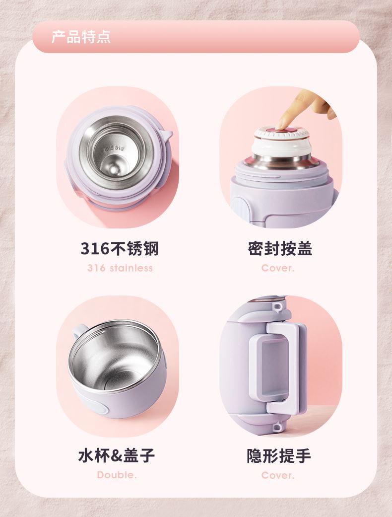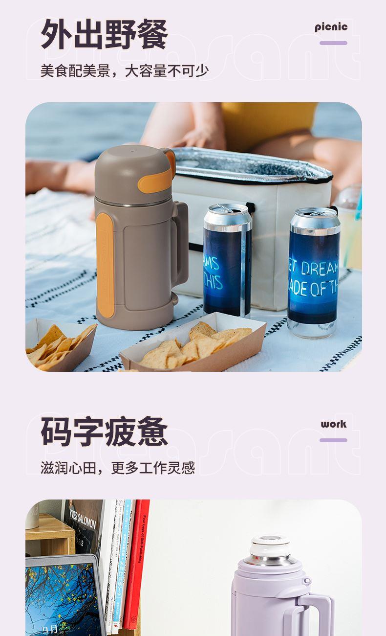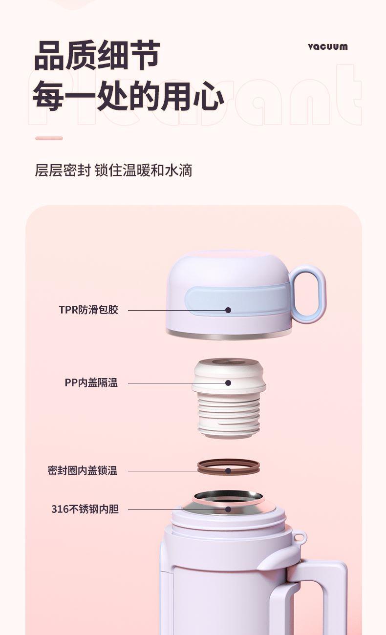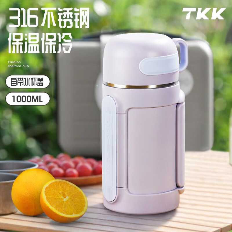商品容量:1000ml 杯身材质:316不锈钢 杯盖材质:304 商品净重:950G ★ 优选316不锈钢材质,耐高温、抗腐蚀 ★ 大容量,出门在外,愉快补水 ★ 下压开盖,流畅出水 ★ 可折叠把手,兼顾美观和实用 ★ 多种温暖色系搭配,化身秋冬暖心伙伴 ★ 侧面大面积防滑条,平放不翻滚 ★ 防摔防漏设计,360°防漏 ★ 侧边配手提挂绳,户外便捷携带