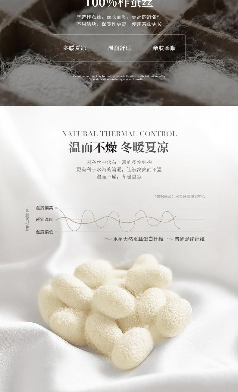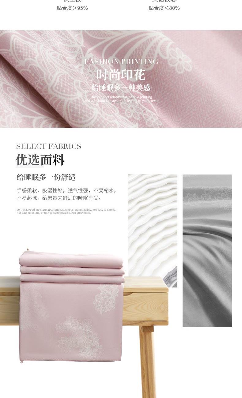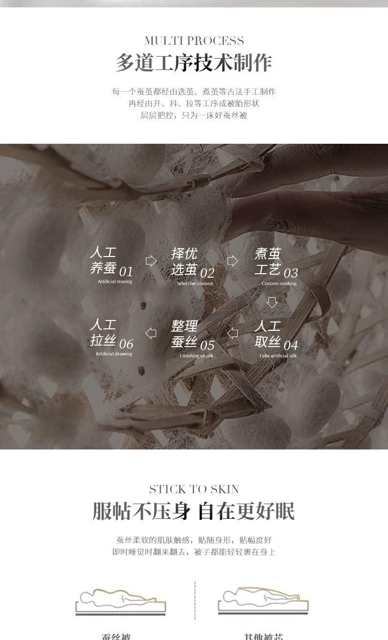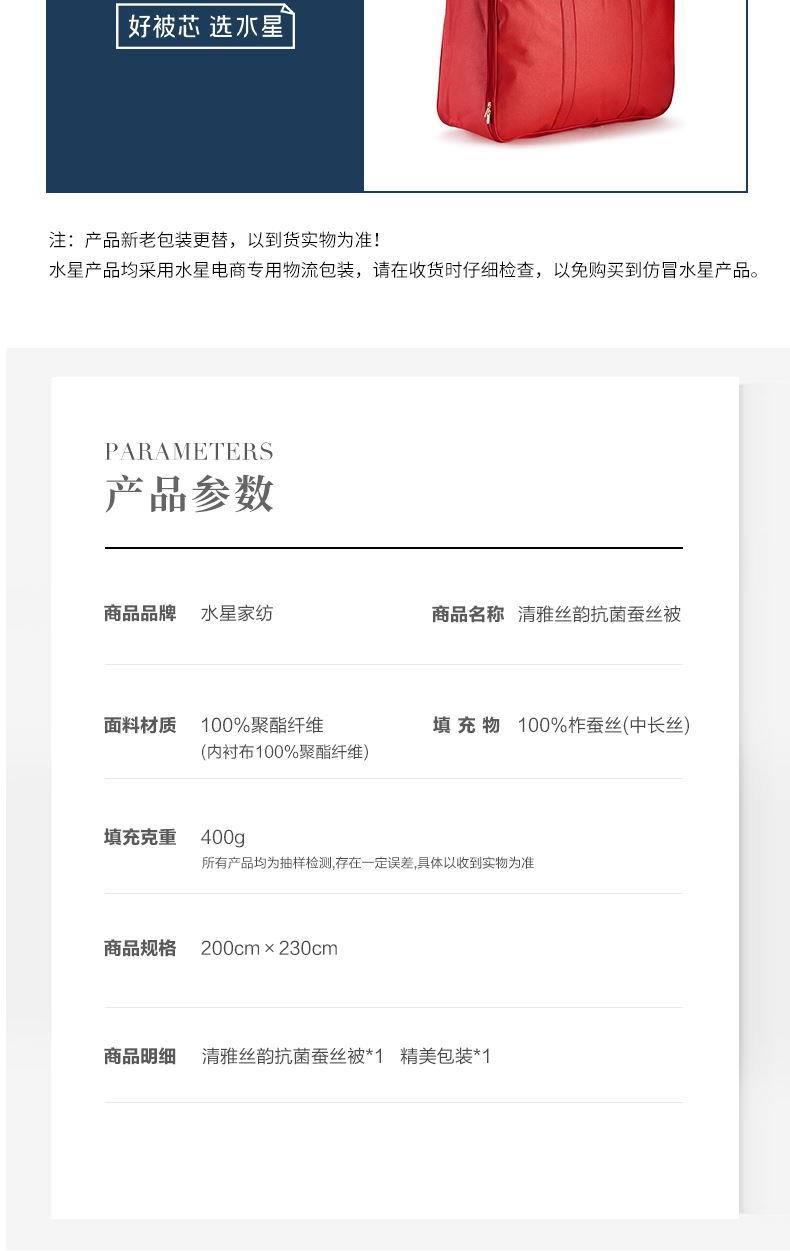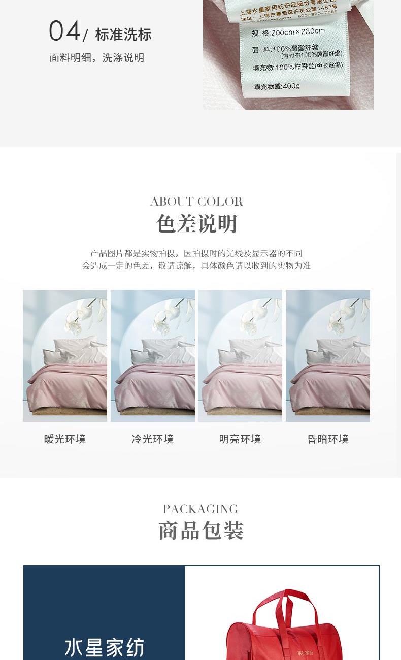 面料:聚酯纤维 规格:200*230cm 填充物:柞蚕丝 填充物重:400g 包装:无纺布手提袋