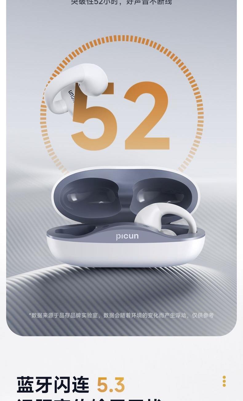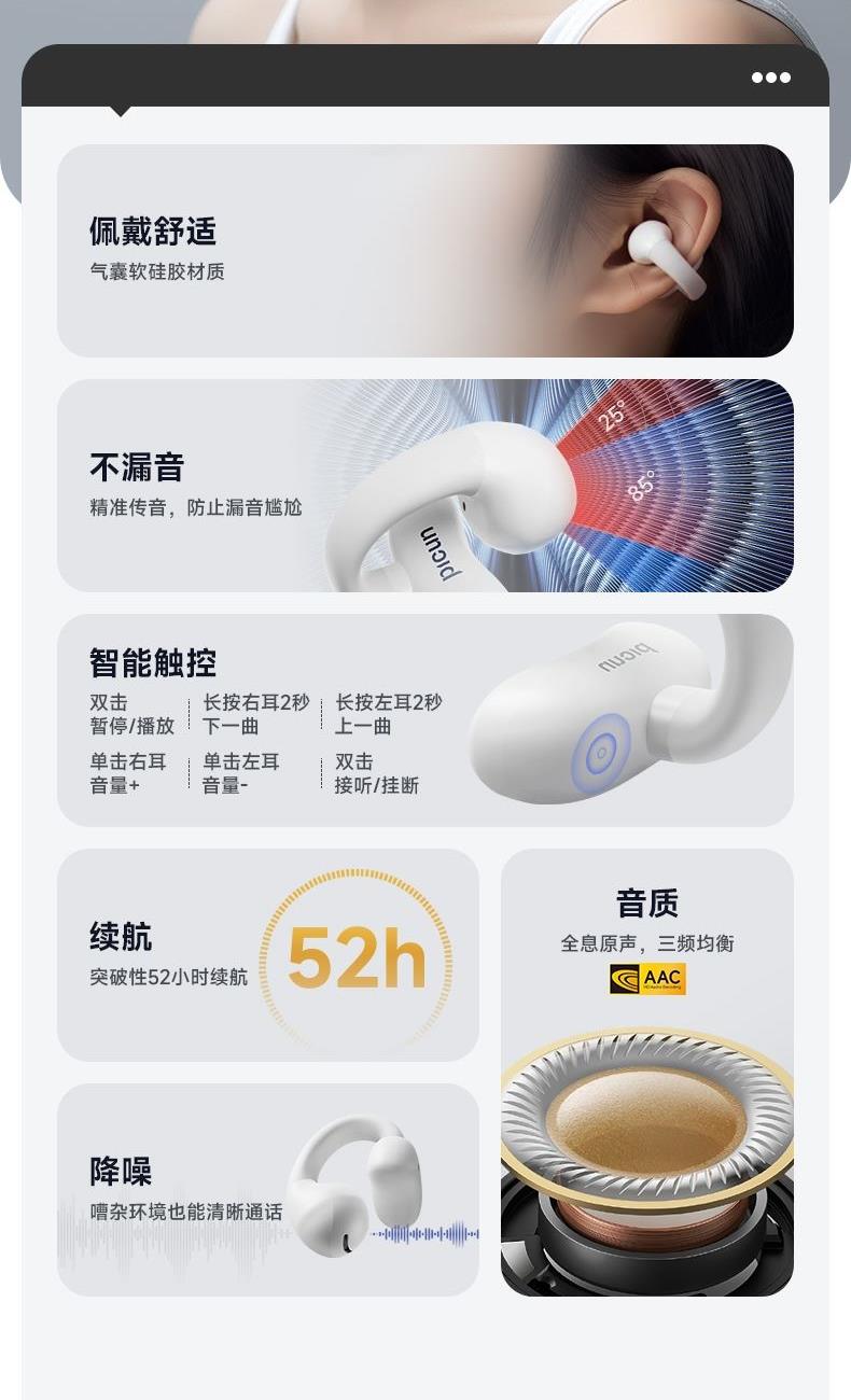 蓝牙方案 : JL7003D 蓝牙版本 : V5.4 接受距离 : 10m 频响范围 : 20HZ- 20KHZ 电池容量 40mA / 400mA 使用时间(70%音量:≈6h 喇叭尺寸 : 12mm 喇叭灵敏度: 120±3db 充电接口: TYPE-C 1、支持【picun品存】APP智能互联控制 2、360度环绕声场 3、智能触控 4、波束传音,不漏音