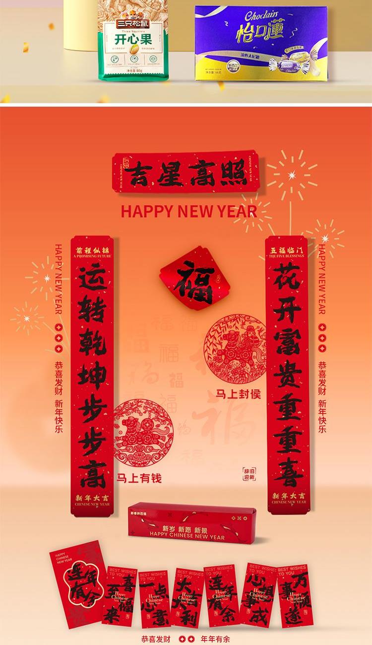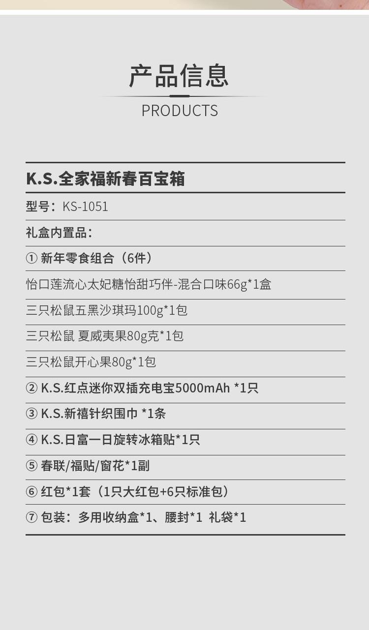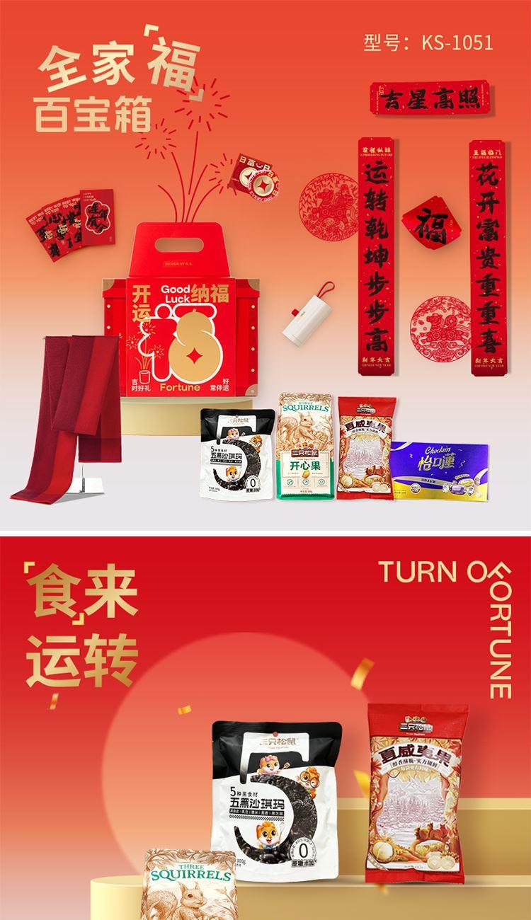 多样搭配,内容丰富。不但汇聚传统年味(春联、红包、窗花),而且精选零食四件装、生活好物(围巾、充电宝、冰箱贴),兼顾情怀与实用。