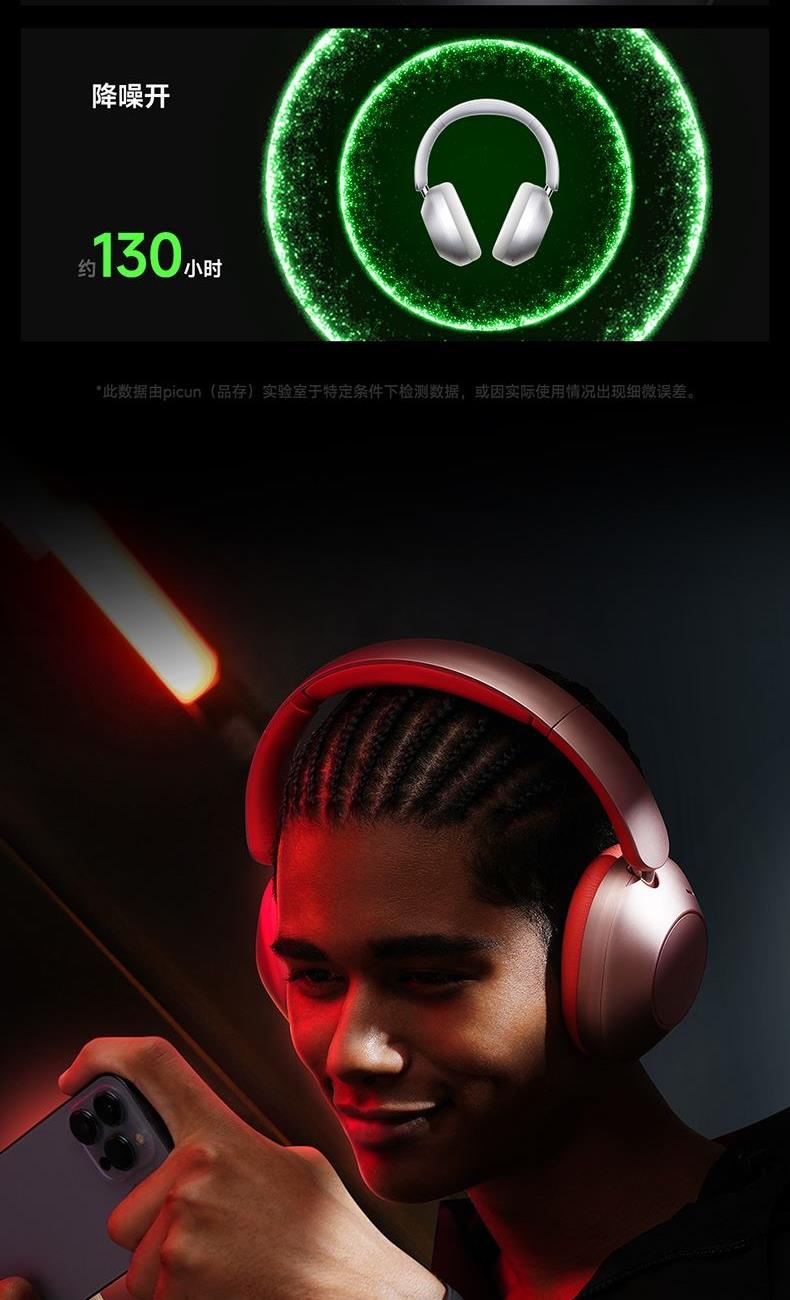 颜色:粉色、天蓝色、深空灰、银色、 连接模式:插音频线、蓝牙 蓝牙方案:JL7018 蓝牙版本:V5.4 电池容量:1200mAh 使用时间(70%音量):120小时, 开启降噪100小时 接受距离:10m 降噪深度:-35dB 频响范围:20HZ-20KHZ 喇叭尺寸:40mm 喇叭灵敏度:105±3dB(1khz) 充电接口:Type-c 1、支持【picun品存】APP智能互联控制 2、4麦阵列先进混馈降噪技术, 降噪深度达38DB 3、千元HIFI无损音质 大师级调教+自定义音效+空间音频 4、1200毫安大容量电池,zui高可支持120小时续航 5、支持头部追踪定位 6、全景声空间音频