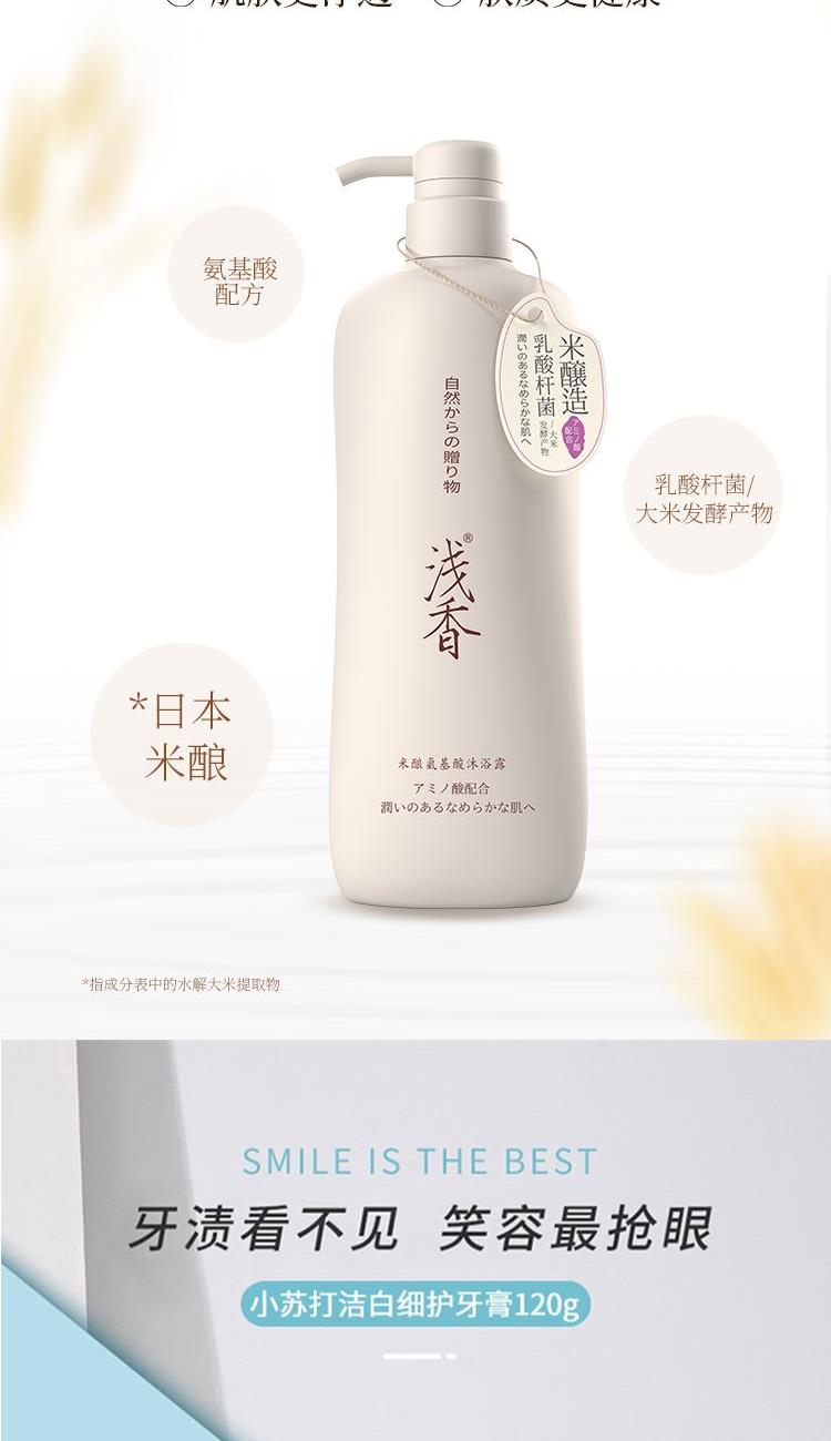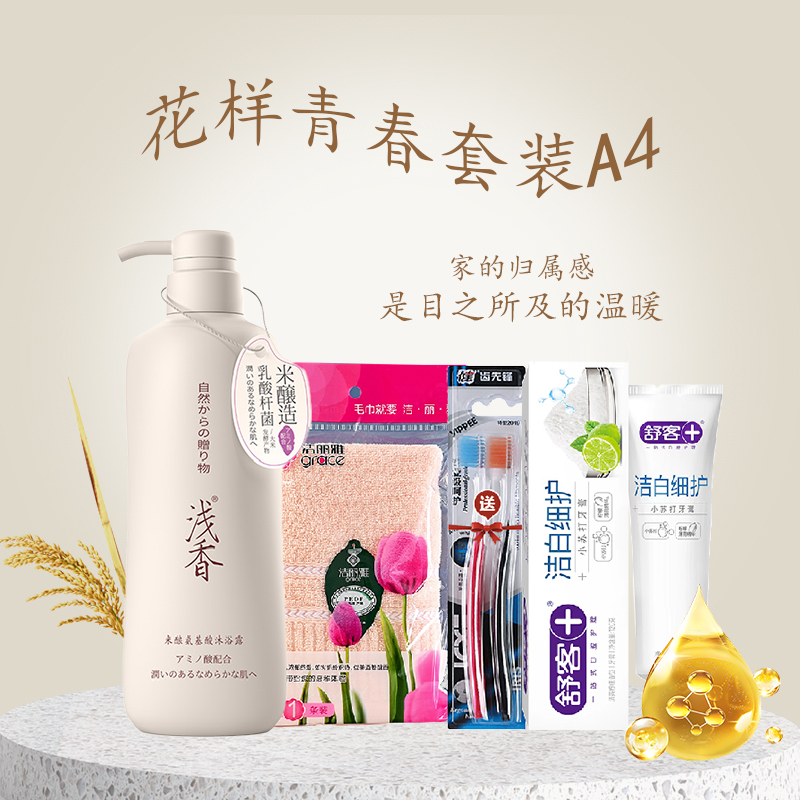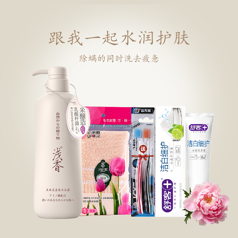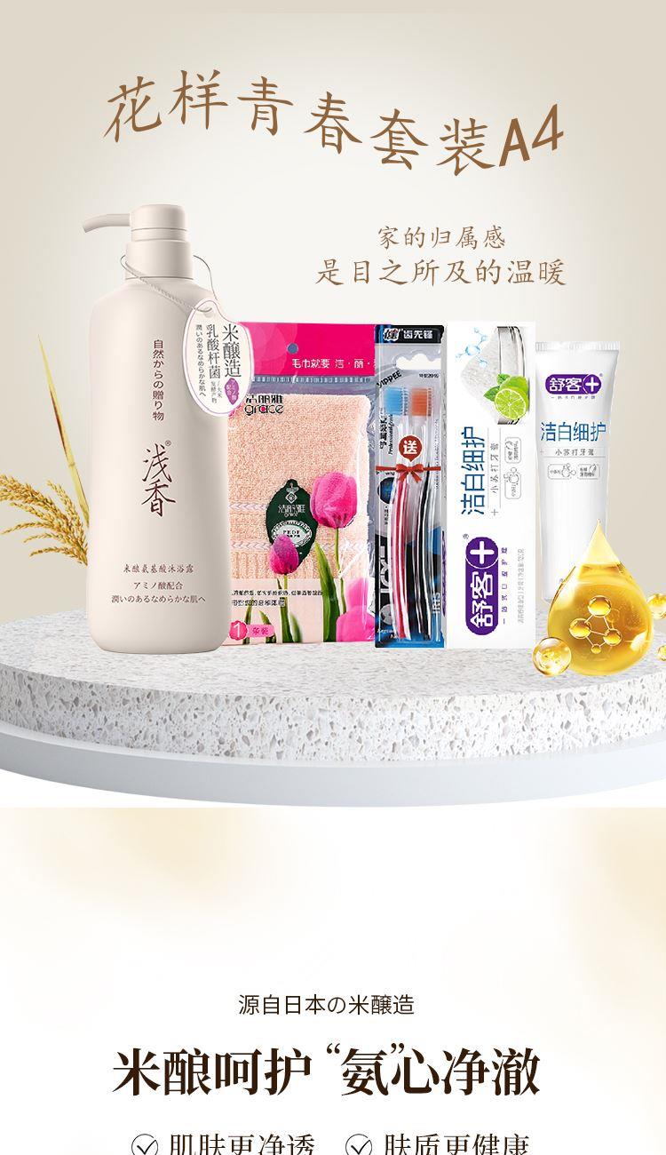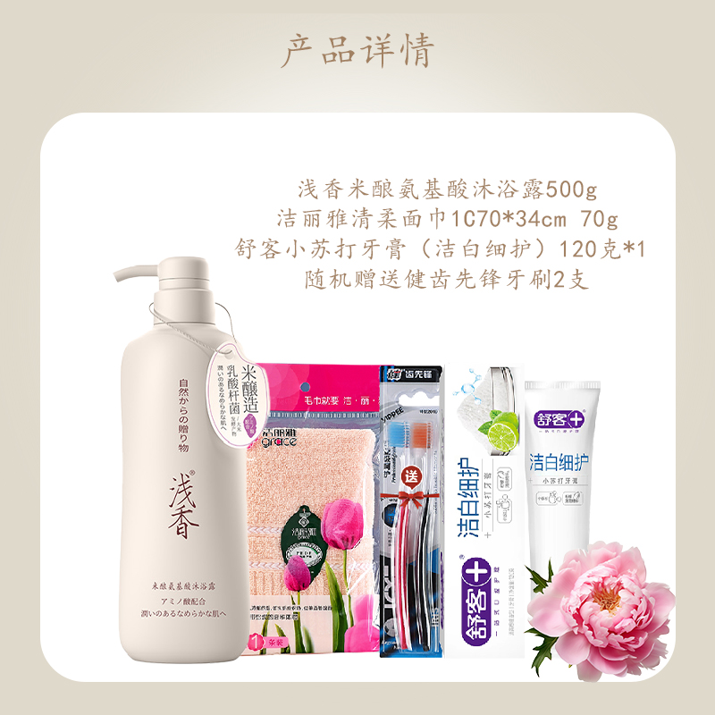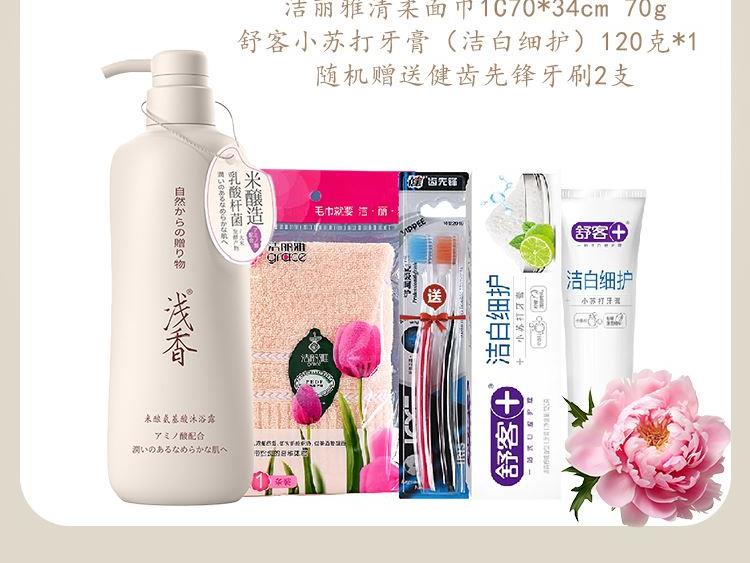 浅香米酿氨基酸沐浴露500g 舒客小苏打牙膏(洁白细护)120克*1 随机赠送健齿先锋牙刷2支 洁丽雅清柔面巾1C70*34cm 70g 精美礼袋*1