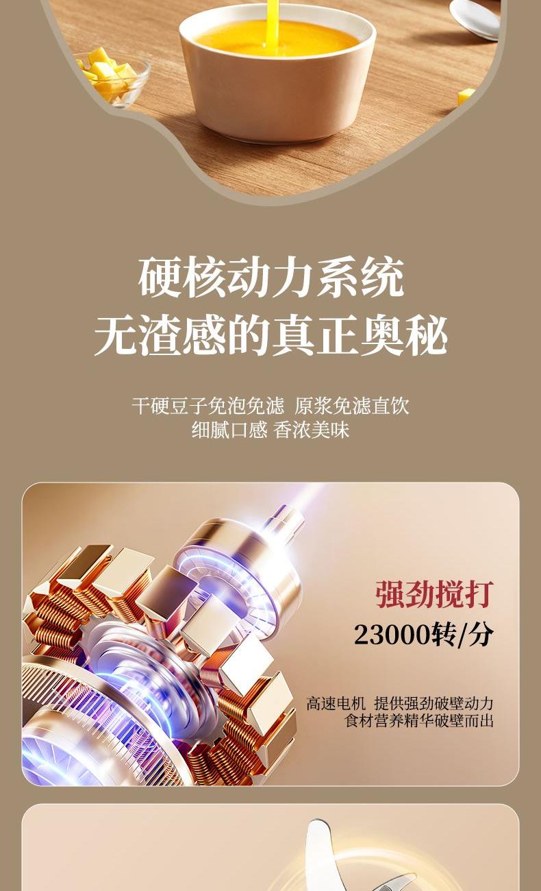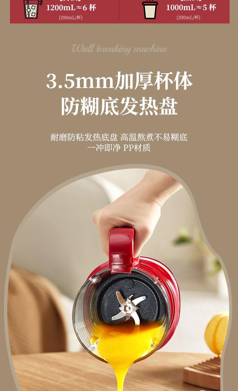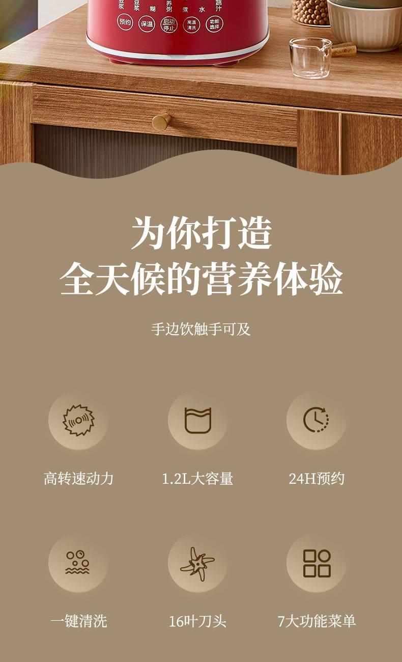 产品参数: 产品容量:1.2L 额定电压:220v~ 刀片:16页刀 额定频率:50Hz 彩盒尺寸:213x212x340mm 加热功率:800W 搅拌功率:200W 毛净重:2.15/1.68kg 产品尺寸:180*139*290(mm) 产品卖点: 1. 1.2 L大容量,可供1-4人使用。. 16叶精钢刀组,细腻无渣。 2. 24H小时超长智能预约 . 大预设智能菜谱,营养美味不重样。 3. 干豆直打,免泡免滤,便捷香浓无渣。 4. 5430电机,23000转/分,动力强劲。 5. 3.5mm加厚杯体,防糊底发热盘,食品级PP材质。. 一键清洗,快速便捷。 6.开盖保护,避免机器误操作,安全放心使用