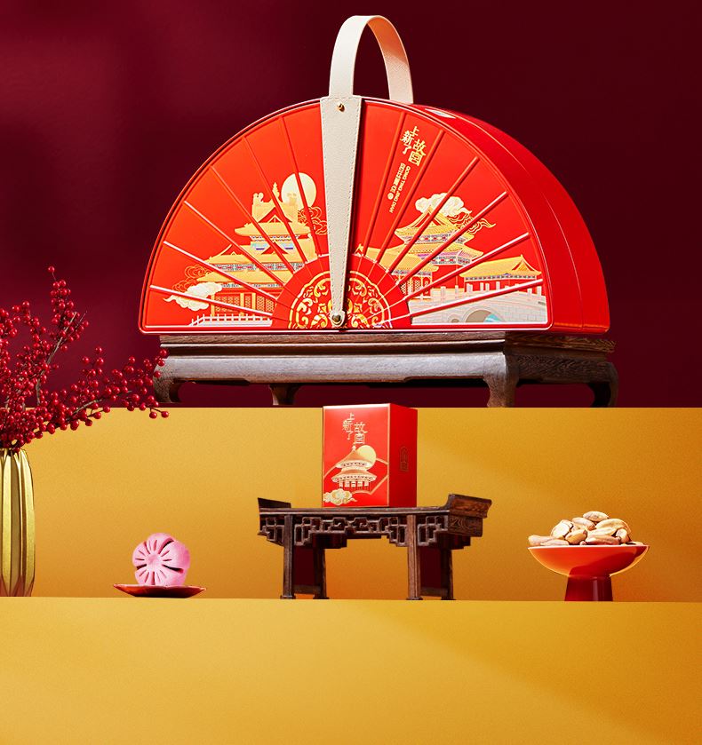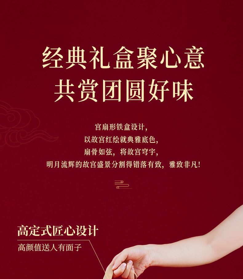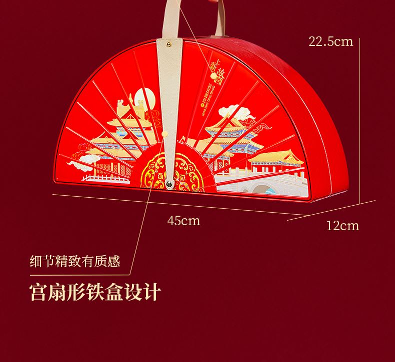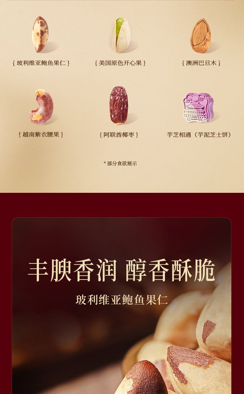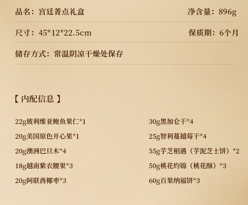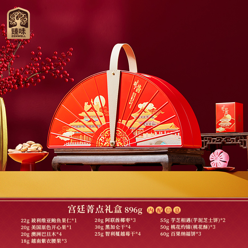 22g玻利维亚鲍鱼果仁*1 20g美国原色开心果*1 20g澳洲巴旦木*4 18g越南紫衣腰果*3 20g阿联酋椰枣*3 30g黑加仑干*4 25g智利蔓越莓干*4 55g芋芝相遇(芋泥芝士饼)*2 50g桃花灼锦(桃花酥)*3 60g百果纳福饼*3 宫扇形铁盒设计,以故宫红绘就典雅底色,扇骨如弦,将故宫穹宇,明月流辉的故宫盛景分割得错落有致,雅致非凡; 净含量:896g,内含4种坚果, 3种果干,3款糕点,纳舌尖珍馐与宫廷雅韵于方寸之间,适合馈赠与文化珍藏。
