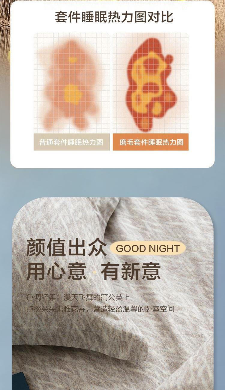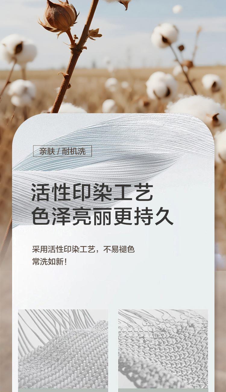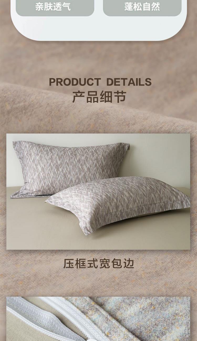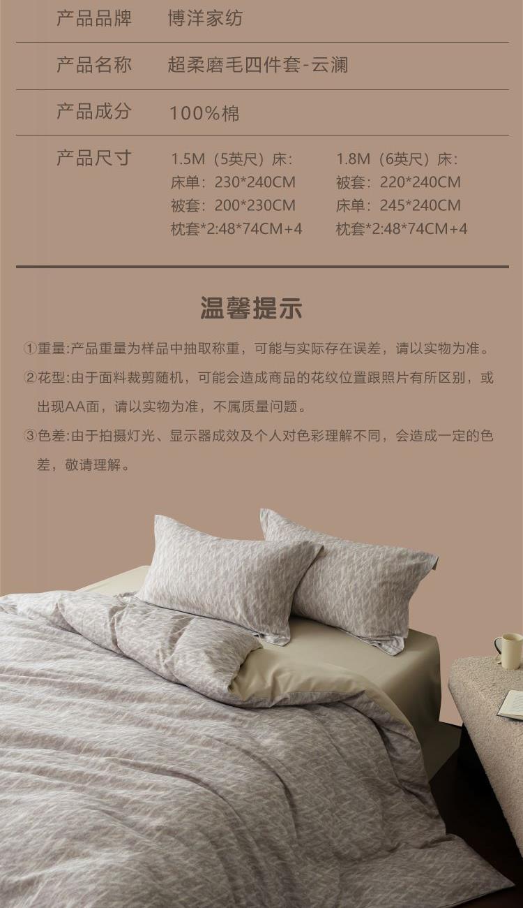产品规格:1.8m(6英尺)床: 被套:220*240cm 床单:245*240cm 枕套*2:48*74cm+4 产品材质:棉 1、采用精梳棉面料,用磨毛工艺,使面料更柔软轻盈,触感温润,贴合肌肤透气性好。 2、自带滤镜,低饱和度温柔显贵,极简设计,流畅走线勾勒轻奢气场。 3、精湛印染工艺,色牢度高,机洗方便,不易起球。解放双手,久洗如新。
