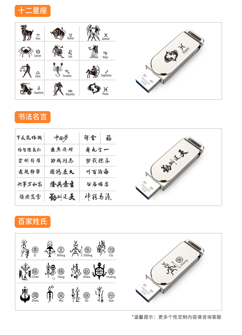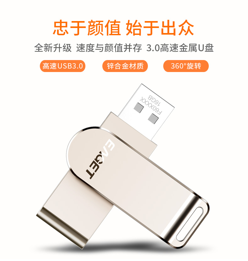 USB3.0接口 高速全金属U盘 360度旋转车载优盘 网红音乐盘 办公优盘 简约小巧 产品尺寸:57*17*10mm 包装尺寸:11.3*9cm 单品重量:9g