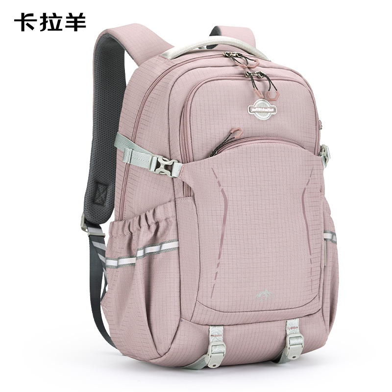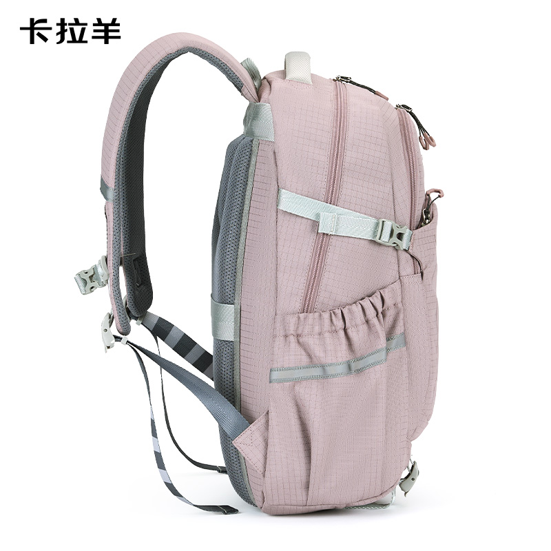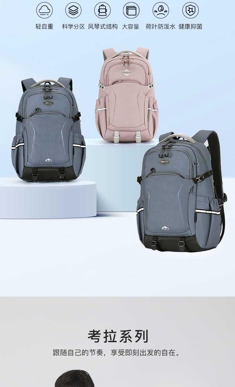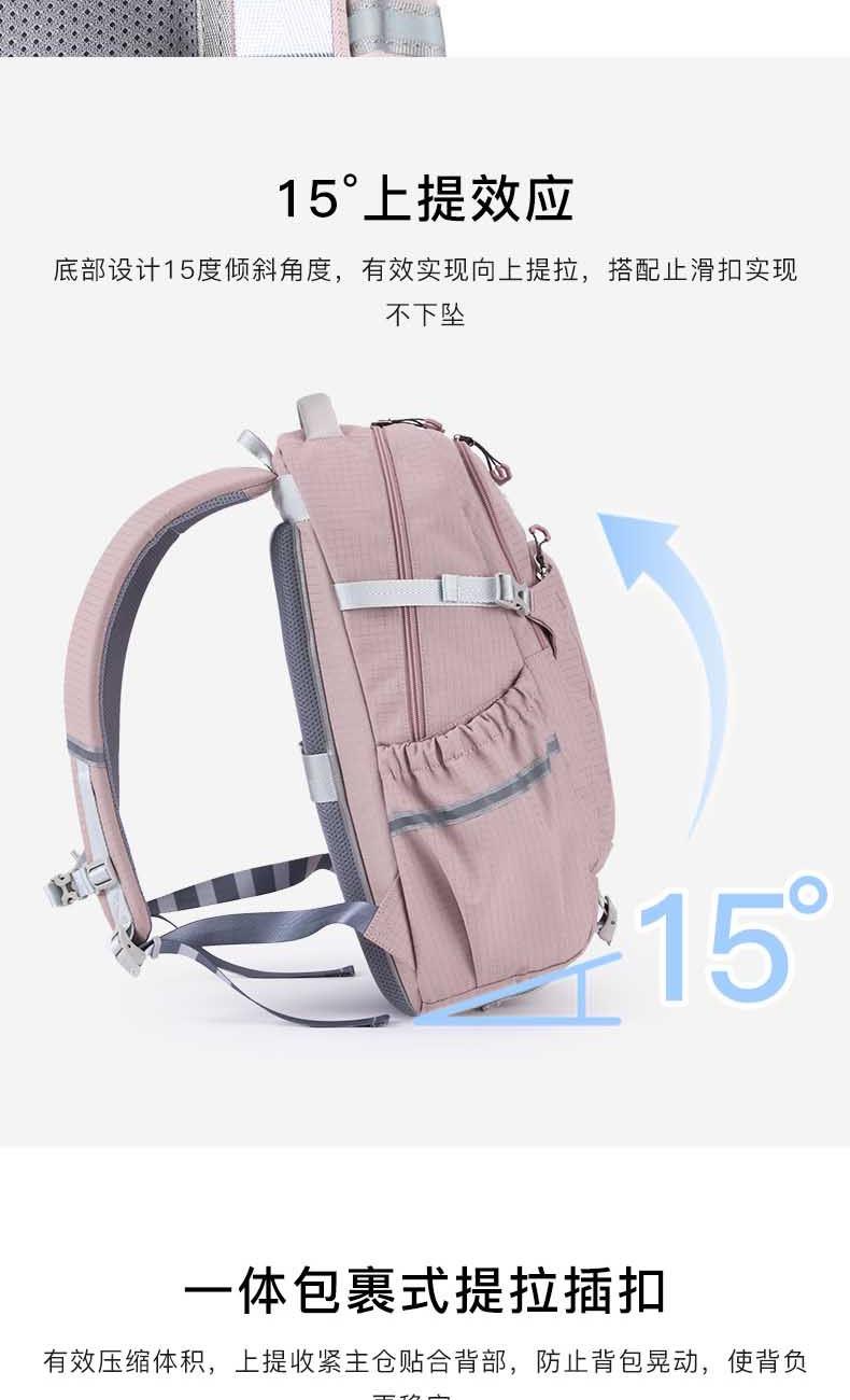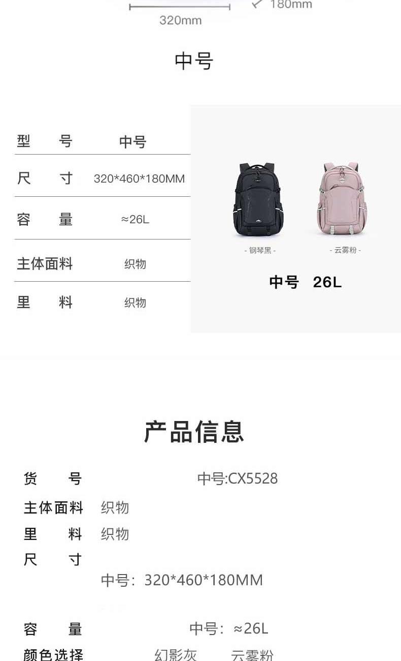 货号:CX5528 主体面料:织物;里料:织物 颜色:云雾粉 定位:165CM以上/ 休闲双肩包 净重:0.74kg 26L