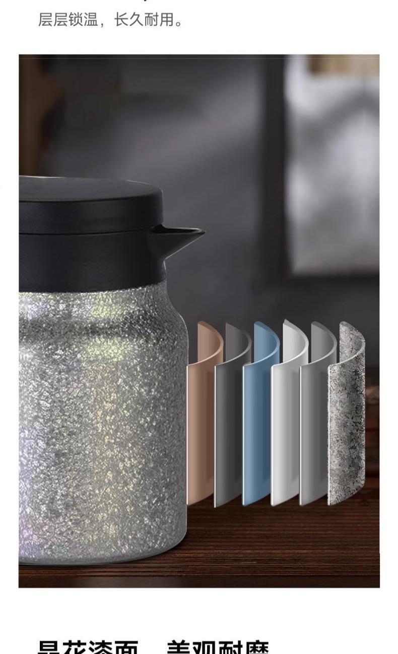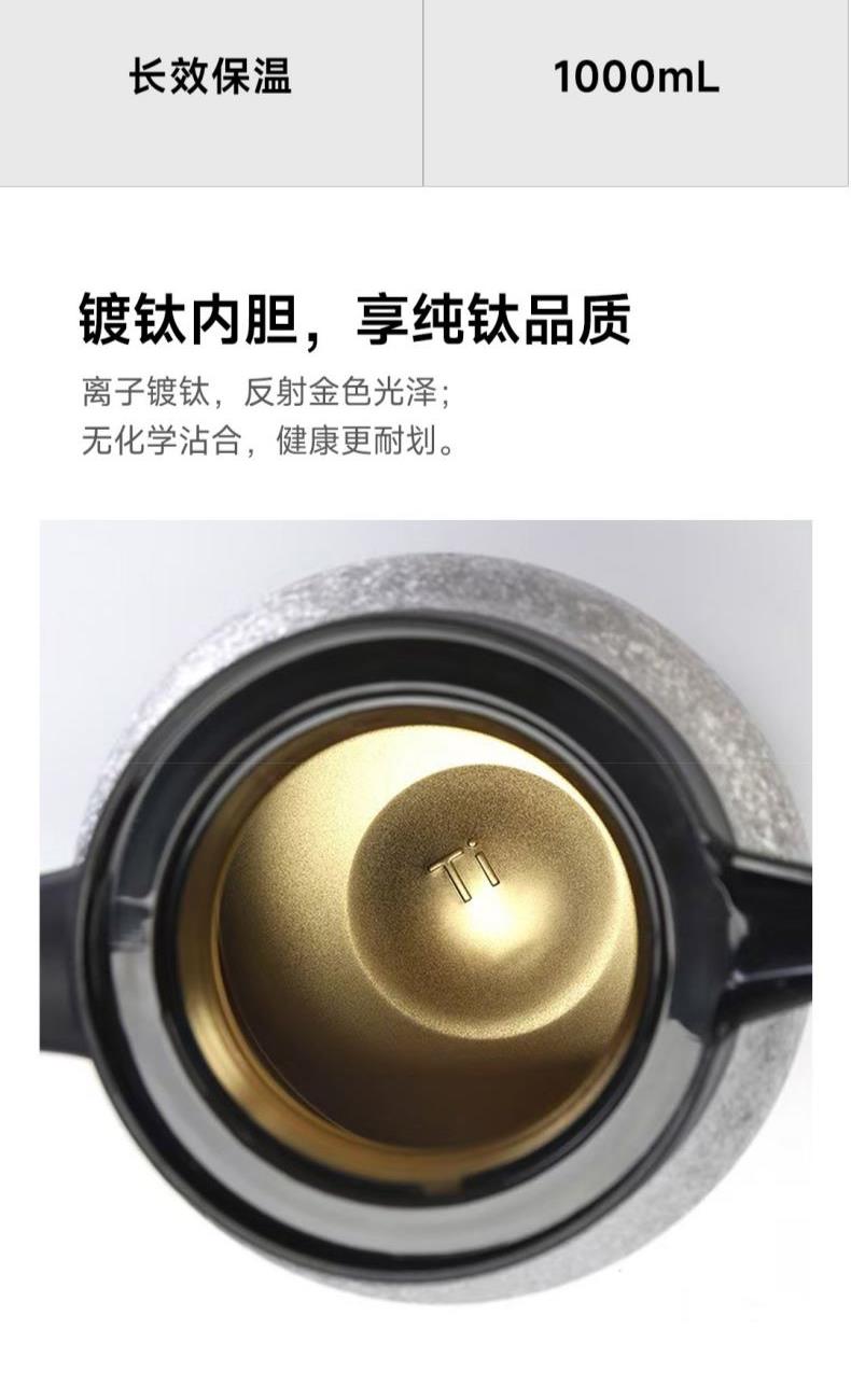 颜色:雪花银 容量:1000mL 材质:内胆、茶滤、壶盖内塞:304+TI(镀钛),壶盖:食品级PP、硅胶 功能:按键出水 产品尺寸:φ11.5*16.7cm 彩盒包装,14*14*18.5cm 1.1000ml,离子镀钛内胆 2.内置茶滤,茶水分离,焖泡方便 3.多层工艺,持久易用