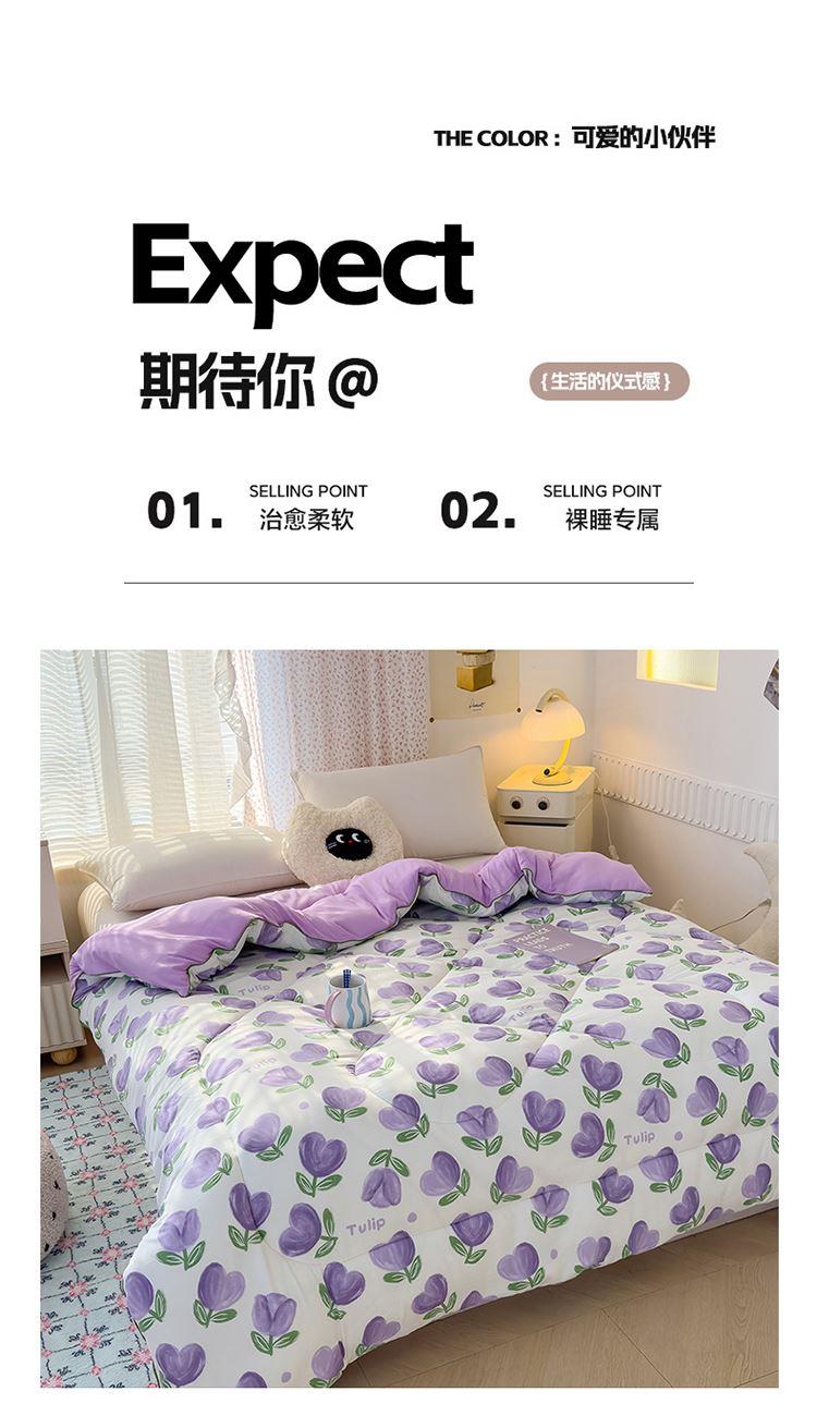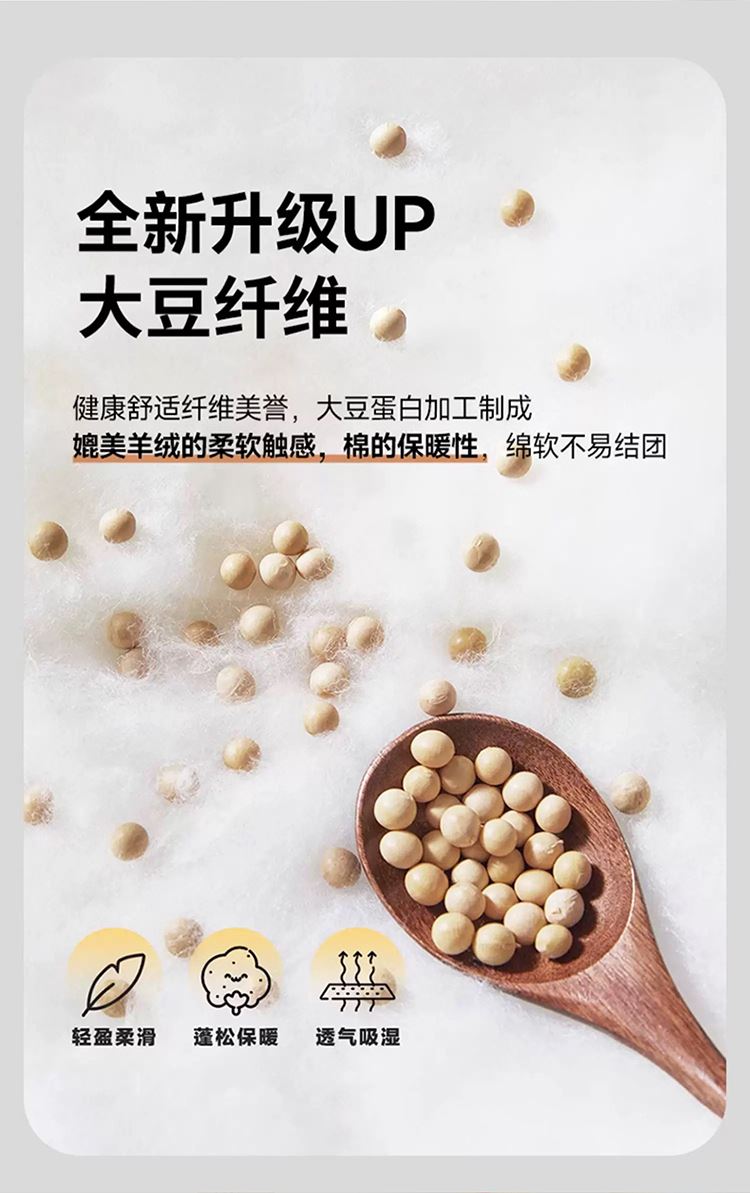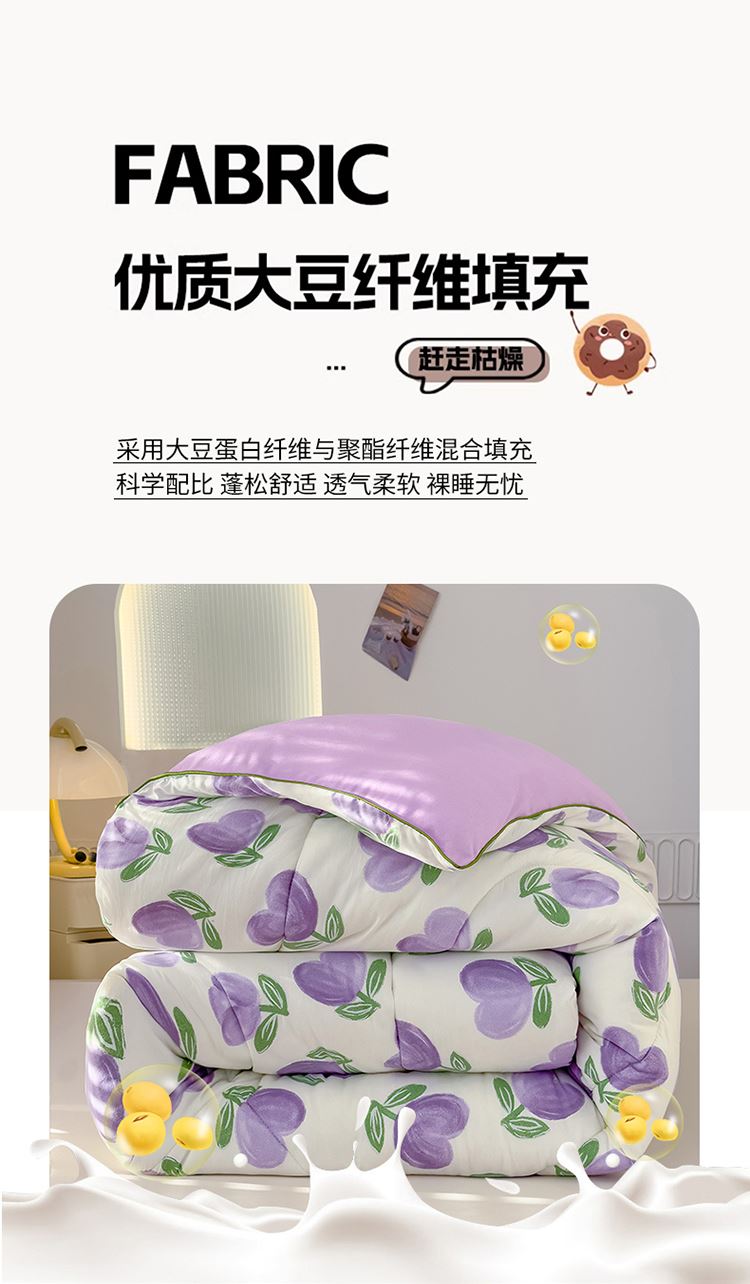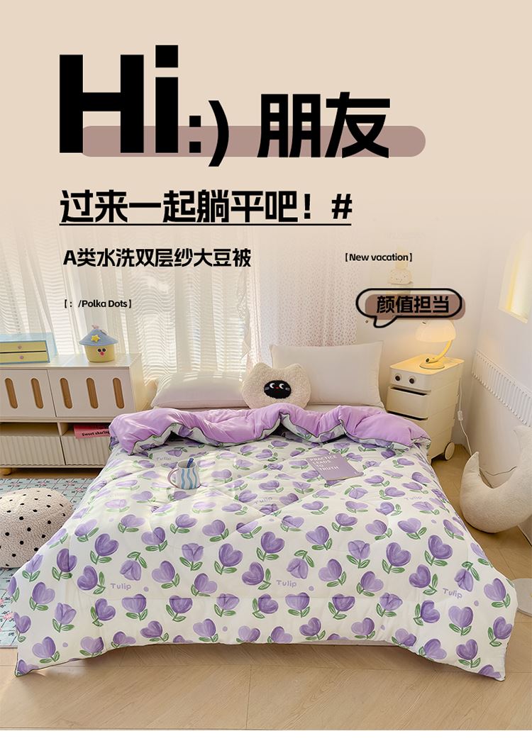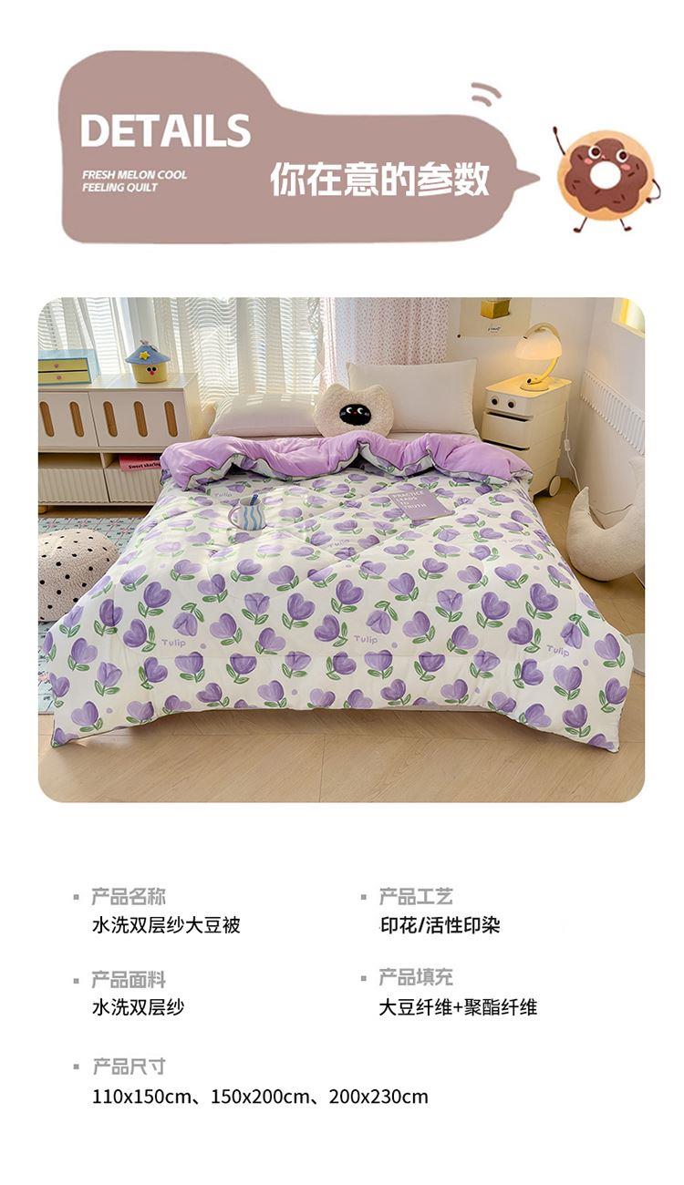 1:水洗双层纱面料 令人心动的软糯触感舒适柔软细腻 呵护肌肤 陪伴整晚安睡 2:采用大豆蛋白纤维与聚酯纤维混合填充科学配比 蓬松舒适 透气柔软 裸睡无忧 3:A版萌趣印花图案,B版纯色设计可爱有趣伴您一整个冬季 尺寸:200*230cm*1 重量:2kg 包装:彩盒