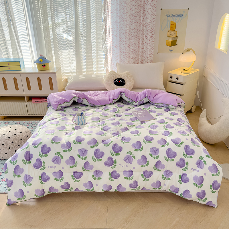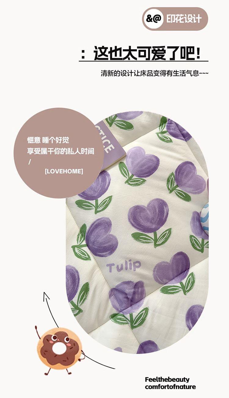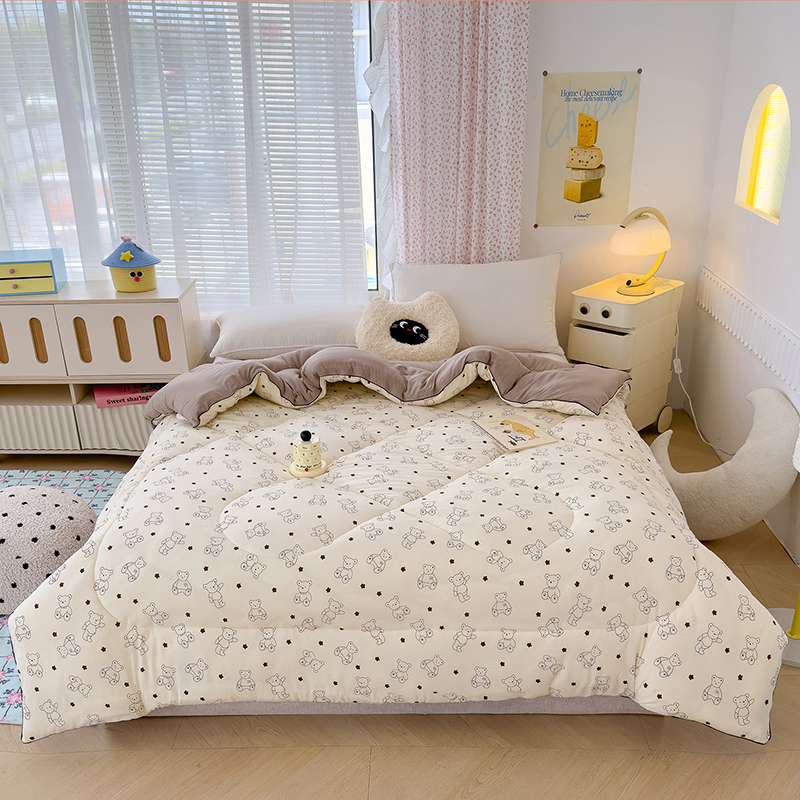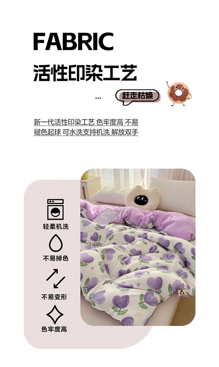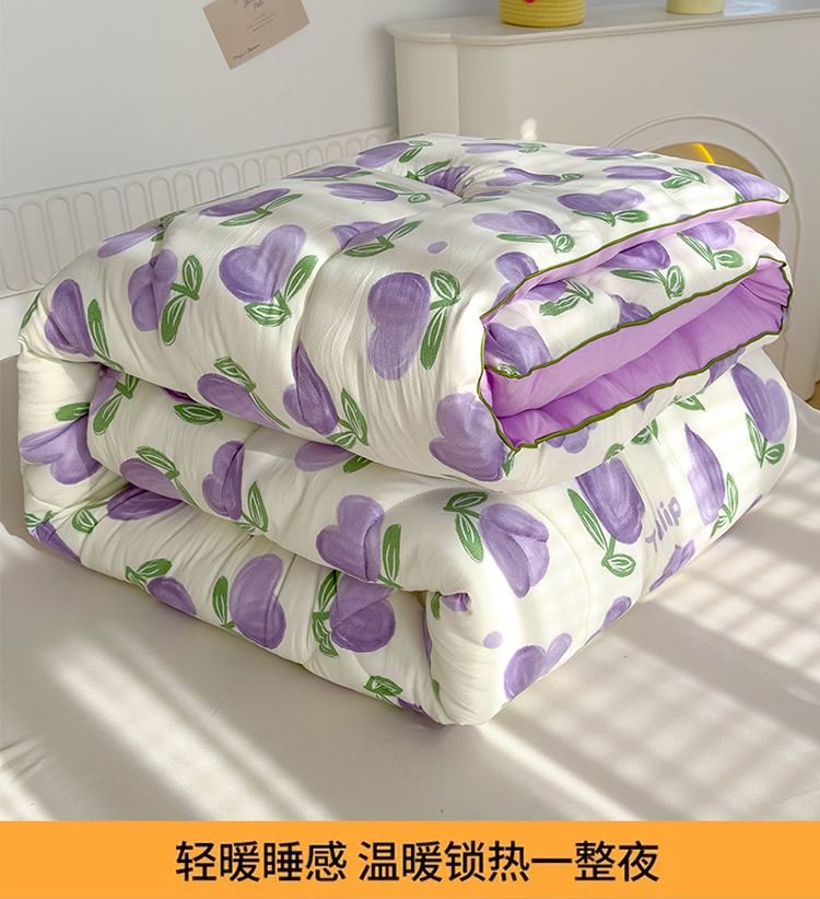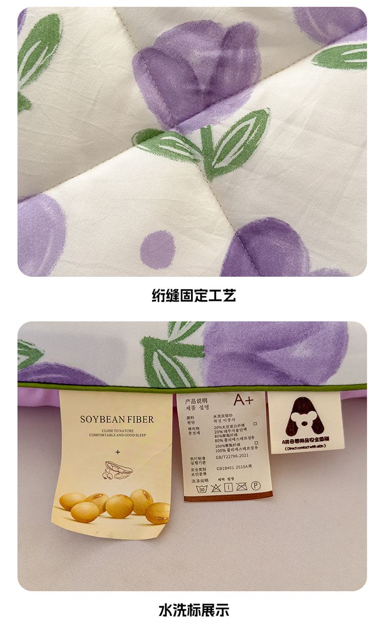 1:水洗双层纱面料 令人心动的软糯触感舒适柔软细腻 呵护肌肤 陪伴整晚安睡 2:采用大豆蛋白纤维与聚酯纤维混合填充科学配比 蓬松舒适 透气柔软 裸睡无忧 3:A版萌趣印花图案,B版纯色设计可爱有趣伴您一整个冬季 尺寸:200*230cm*1 重量:2kg 包装:彩盒
