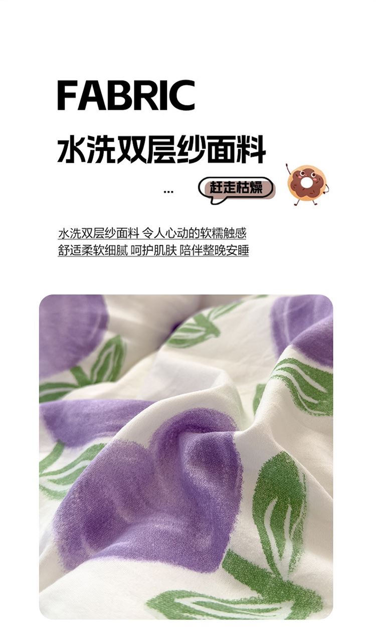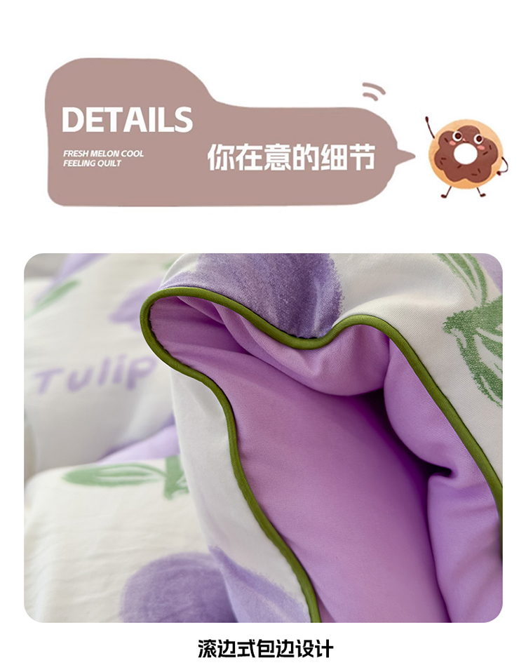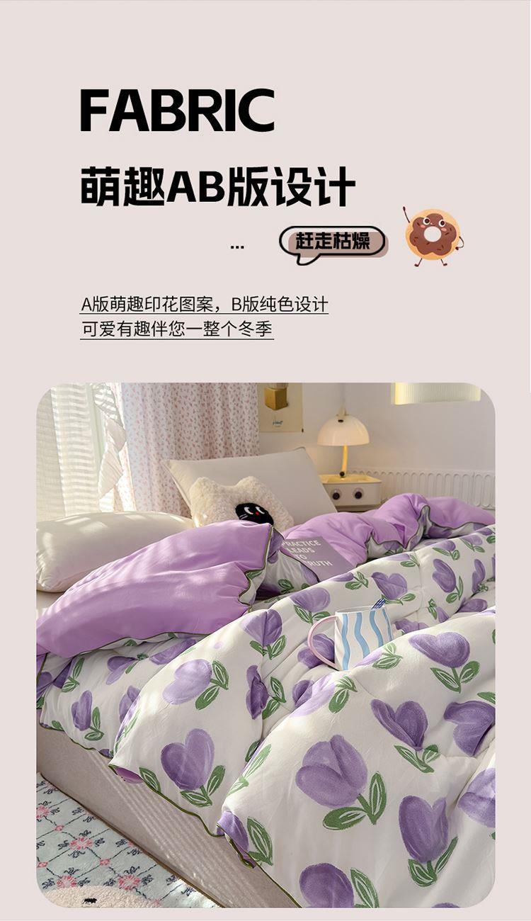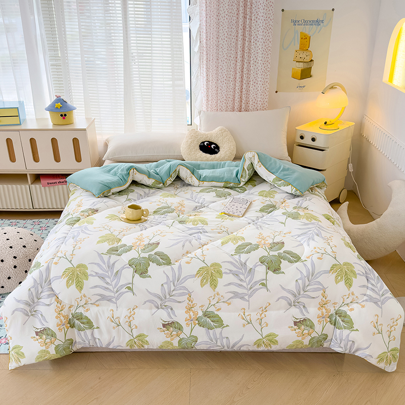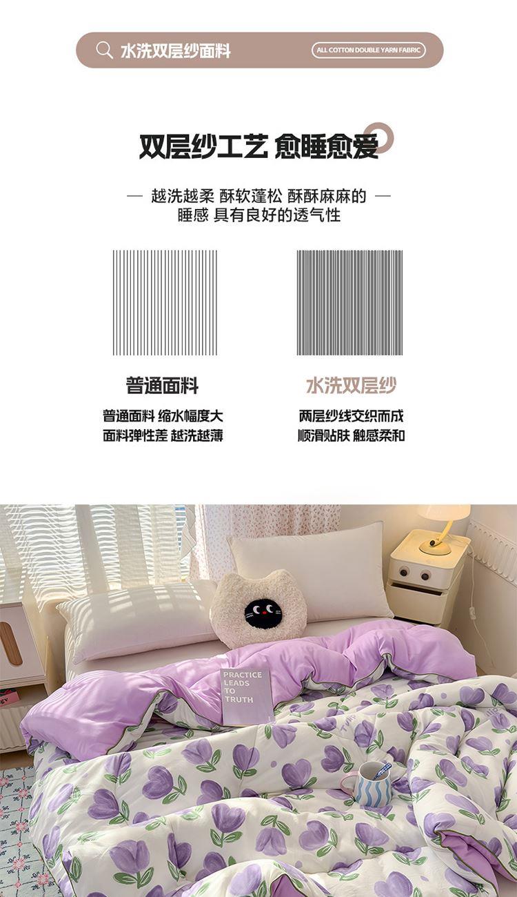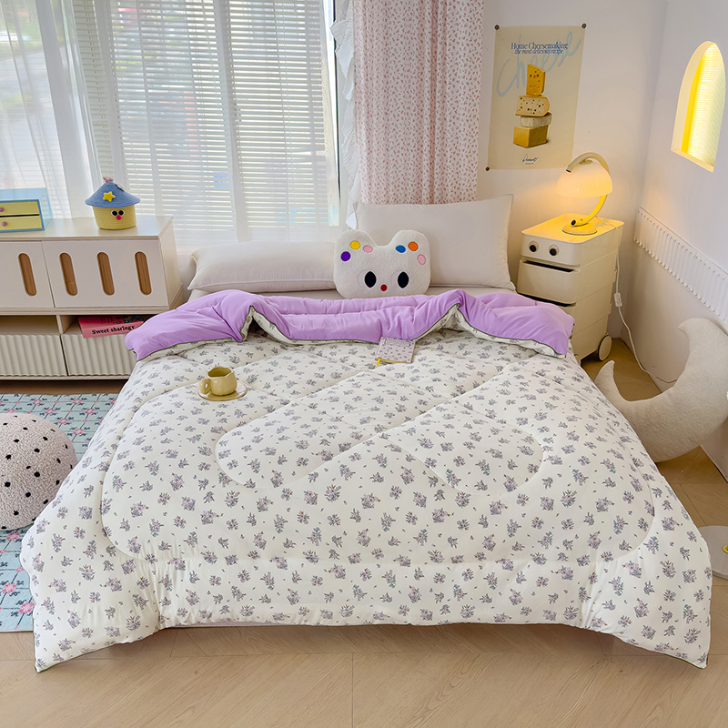 1:水洗双层纱面料 令人心动的软糯触感舒适柔软细腻 呵护肌肤 陪伴整晚安睡 2:采用大豆蛋白纤维与聚酯纤维混合填充科学配比 蓬松舒适 透气柔软 裸睡无忧 3:A版萌趣印花图案,B版纯色设计可爱有趣伴您一整个冬季 尺寸:200*230cm*1 重量:2kg 包装:彩盒