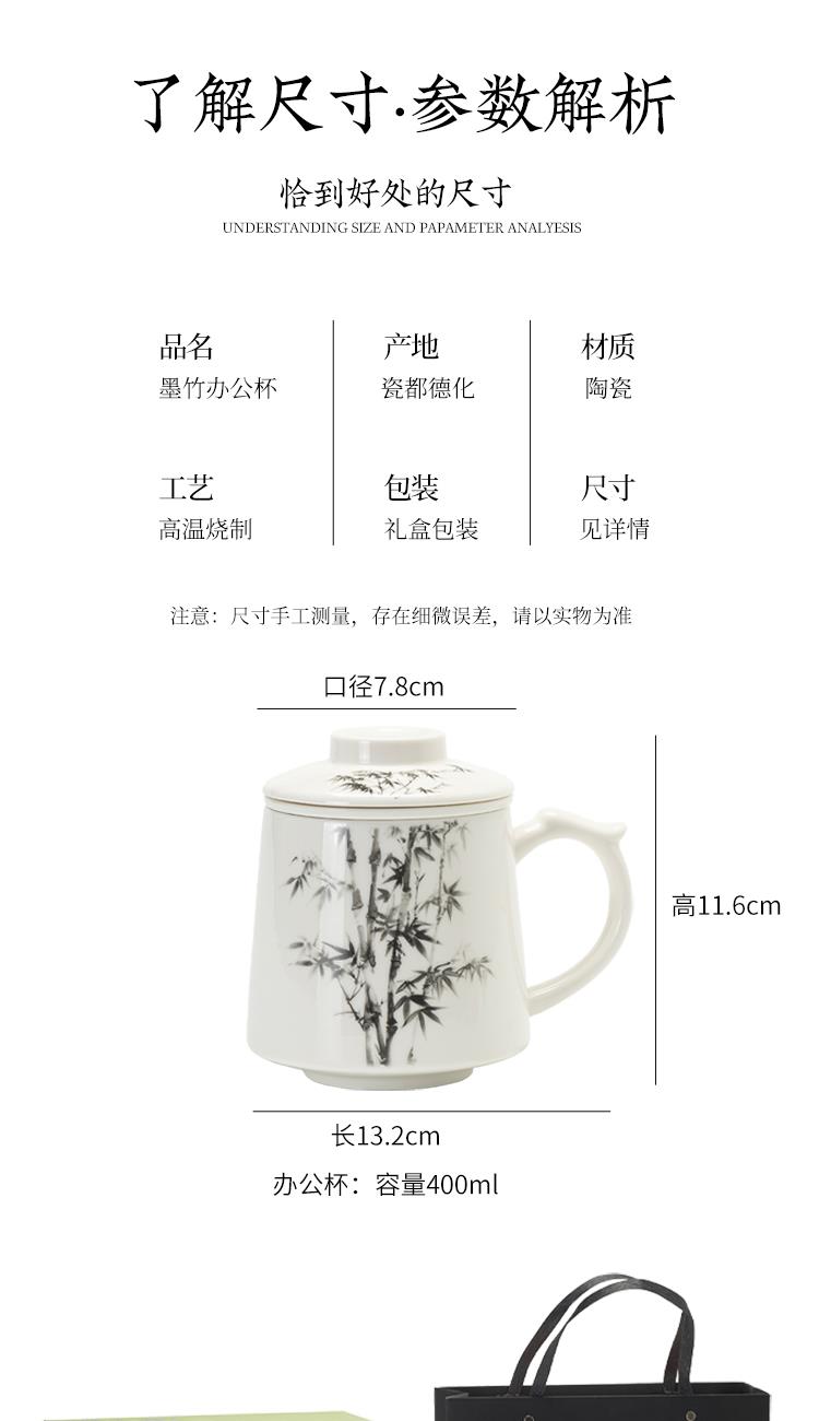配置:办公杯三件套*1 礼盒*1 手提袋*1 材质:羊脂玉瓷 礼盒尺寸:27.8cm*17.5cm*10cm 产品尺寸:办公杯:宽13.2cm/高11.6cm,容量:400ml