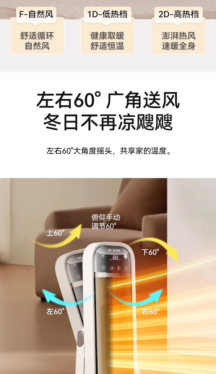 ◁ 60°大广角摇头,满足大空间多人取暖需求