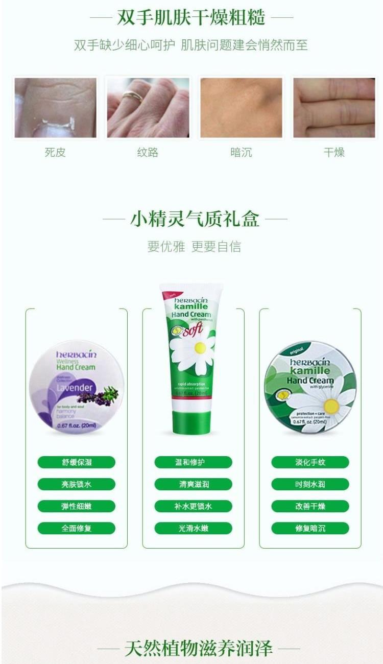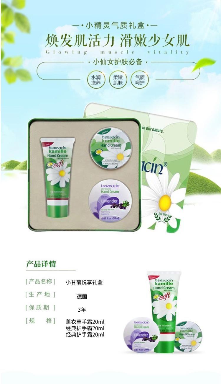 原产地:德国 规格:经典护手霜20ml、清爽护手霜20ml、薰衣草护手霜20ml 功效:滋润手足、抚平粗糙、轻盈舒缓、补水防护、打造细化水嫩肌肤 保质期:4年 适合肤质:所有肌肤 礼盒尺寸:13.5*13.5*3.5cm 条形码:4013718983745
