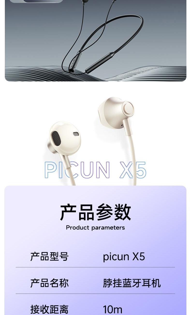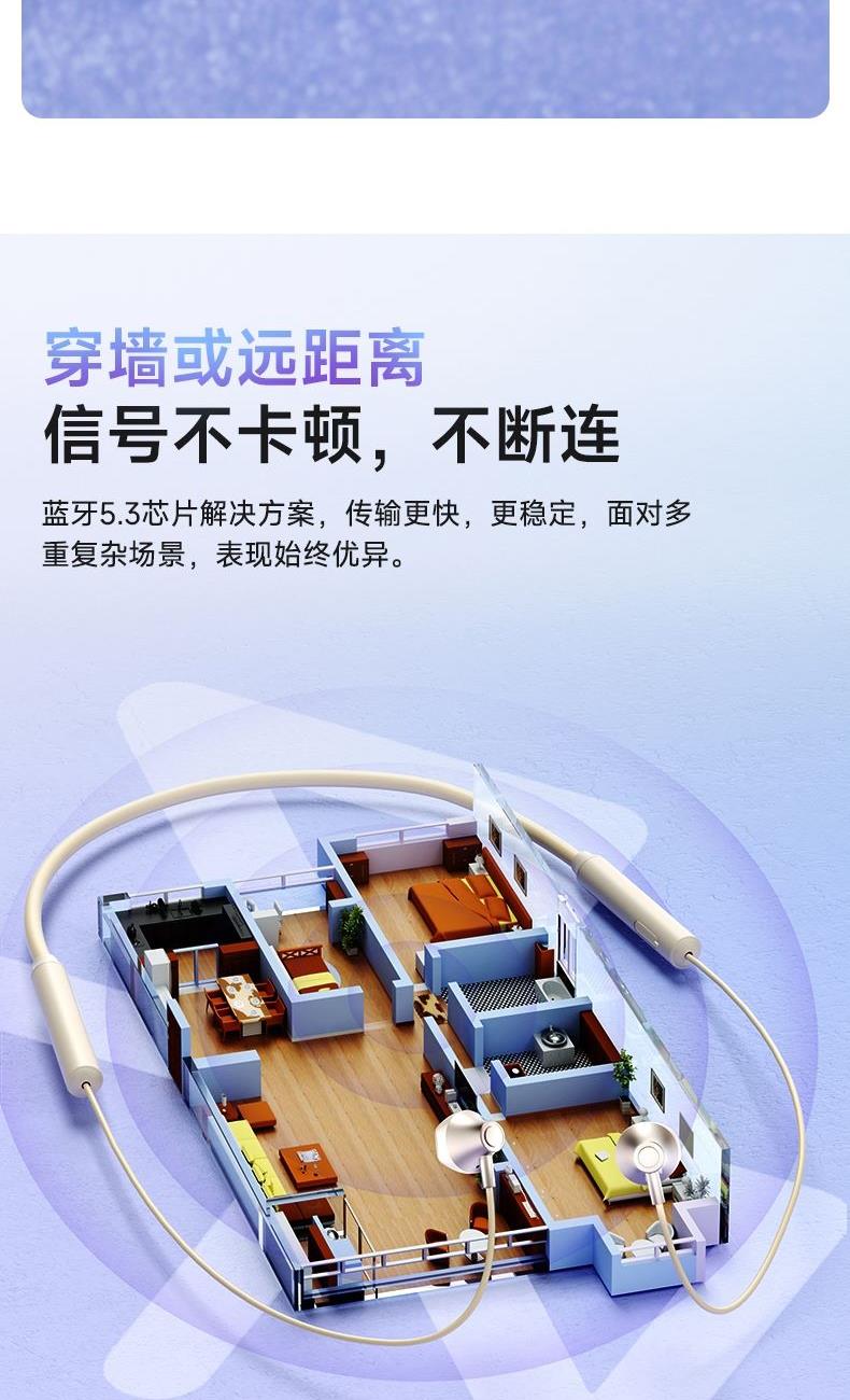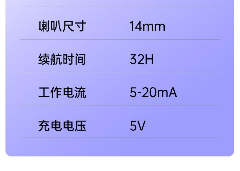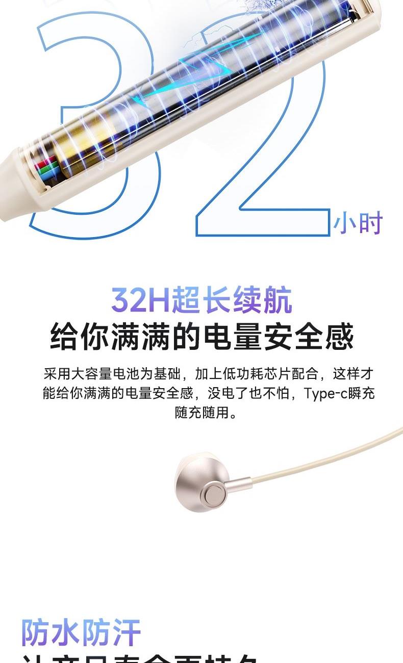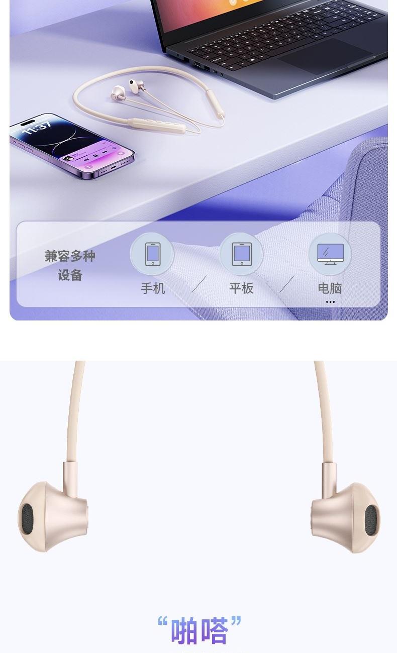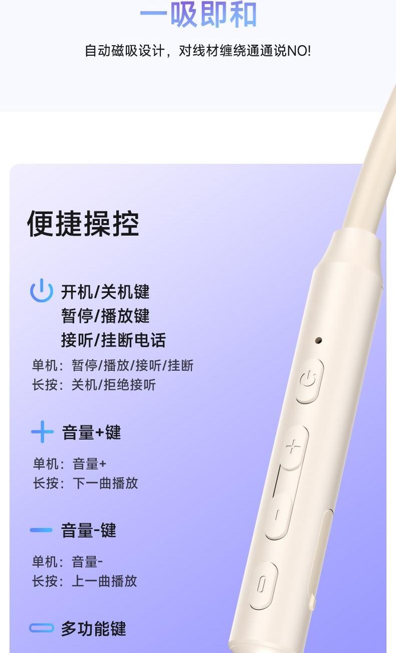 颜色:黑色、卡其白 产品类型:挂脖式耳机 声道系统:双声道 控制方式:按键 蓝牙方案:AC7003F4 蓝牙版本:V5.3 支持蓝牙协议:A2DP、AVRCP、HSP、HFP 蓝牙有效距离:10m 电池容量:110mAh 使用时间(70%音量):≈12h 1、磁吸收纳 2、久戴不痛 3、防水防汗,IPX54防水