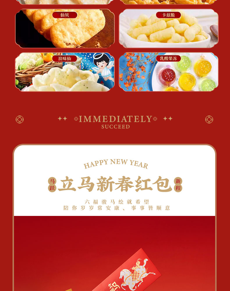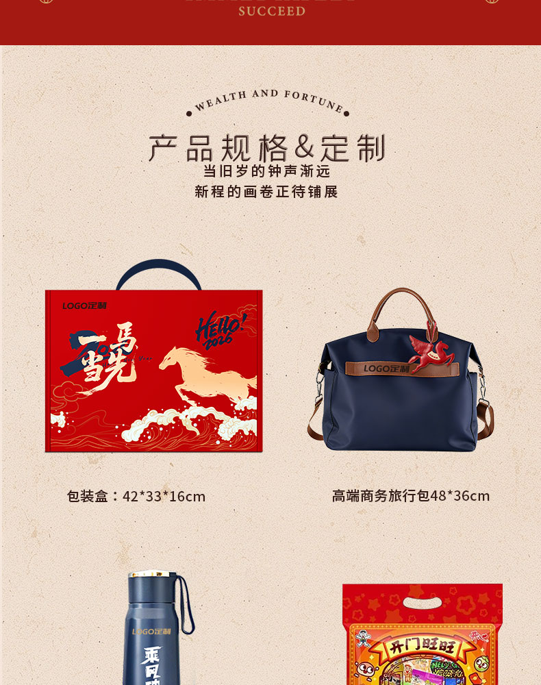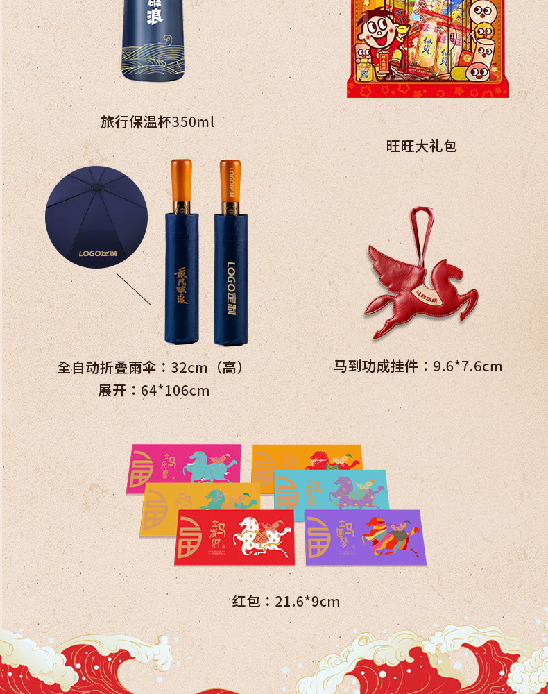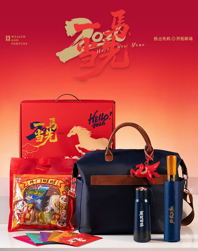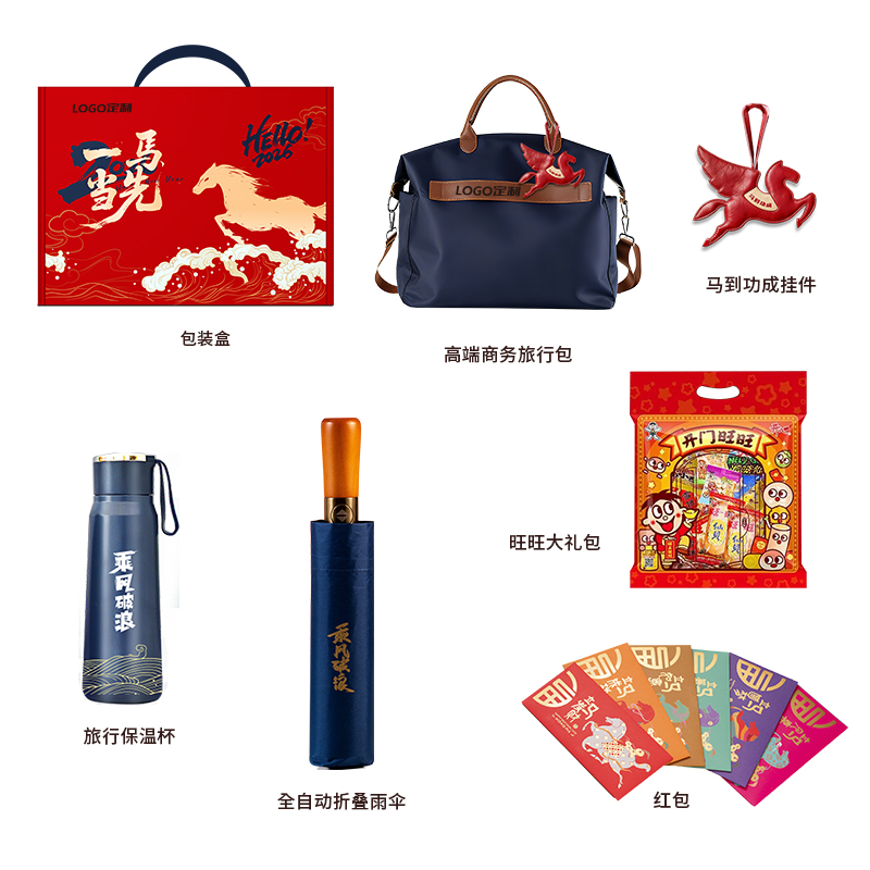 • 商务旅行包装下出行所需 • 专属飞马钥匙扣挂于包上,每一次出发都有好运随行; • 乘风破浪保温杯,旅途中总有暖意相伴;遮风挡雨雨伞,为前行之路撑起安稳; • 借“旺”的好彩头,为孩子、为全家加持一整年的好运,愿新岁事事顺、样样旺; • 6个红包藏满新年期许