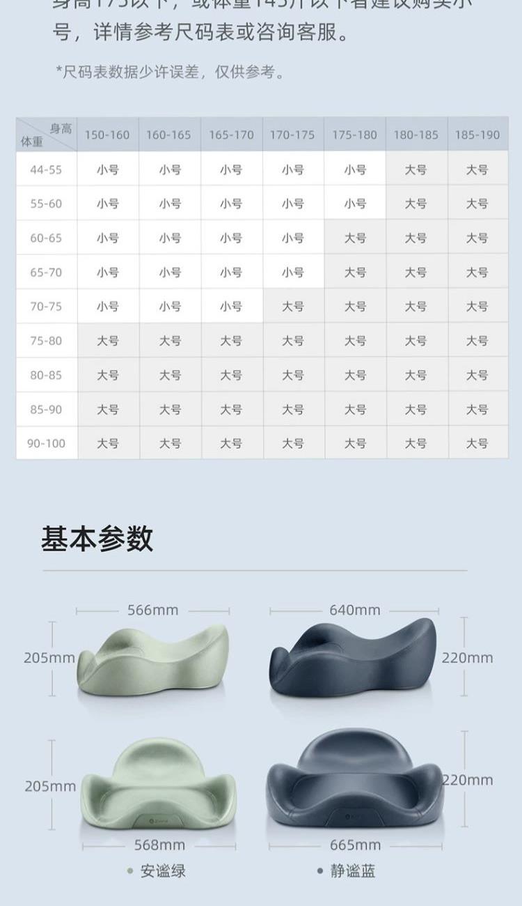 产品型号:ZMSE001-ALGN-S 产品颜色:安谧绿 产品尺寸:568*566*205mm 外箱尺寸:680*655*240mm 产品规格:1PC 尺寸建议:身高175以下,或体重145斤以下人群 执行标准:GB/T 22843-2009