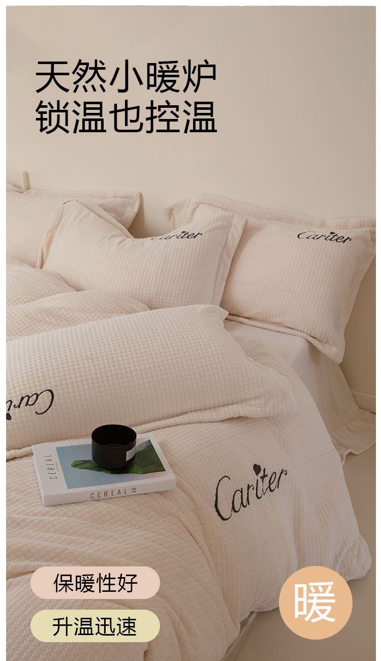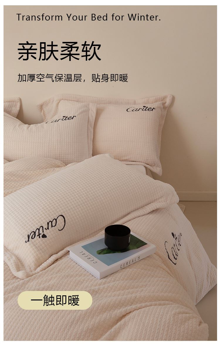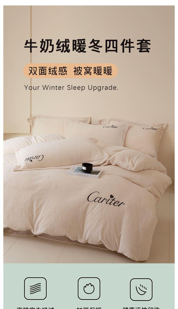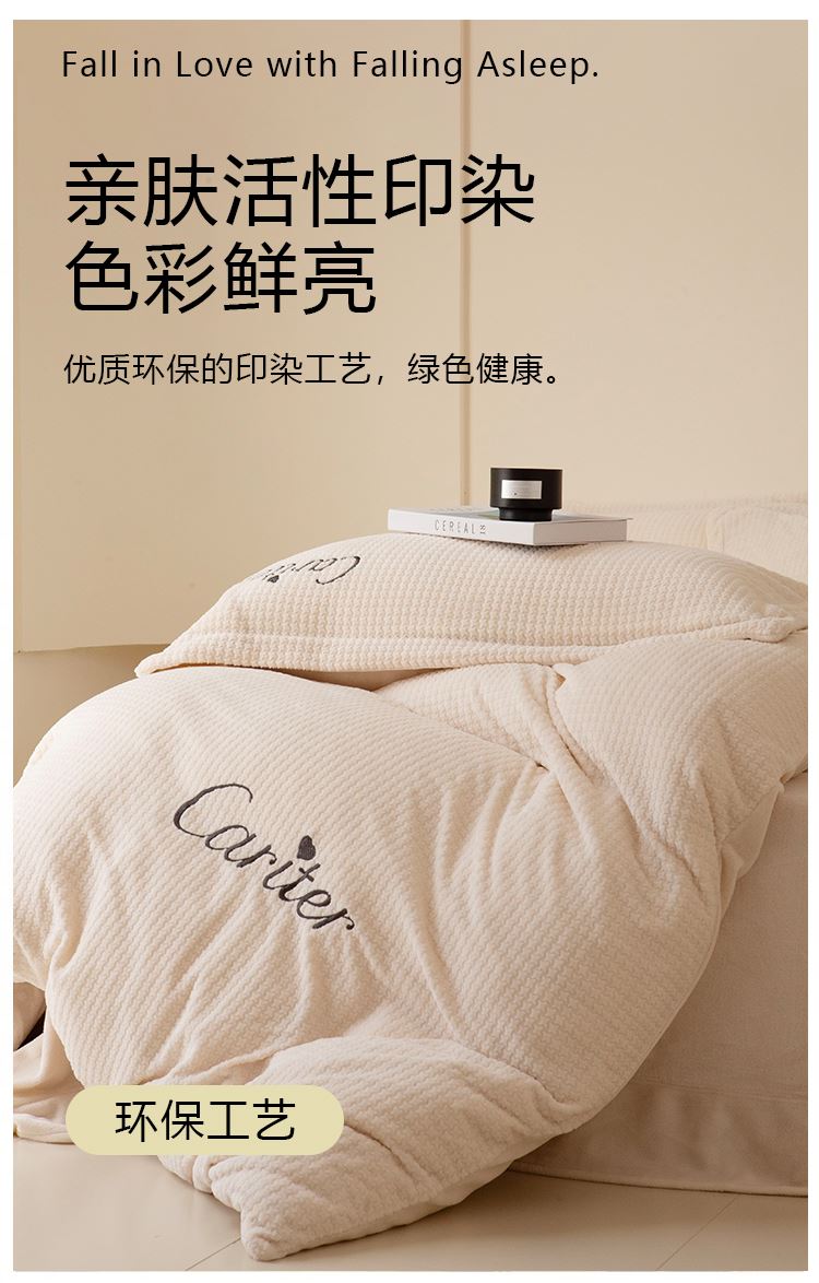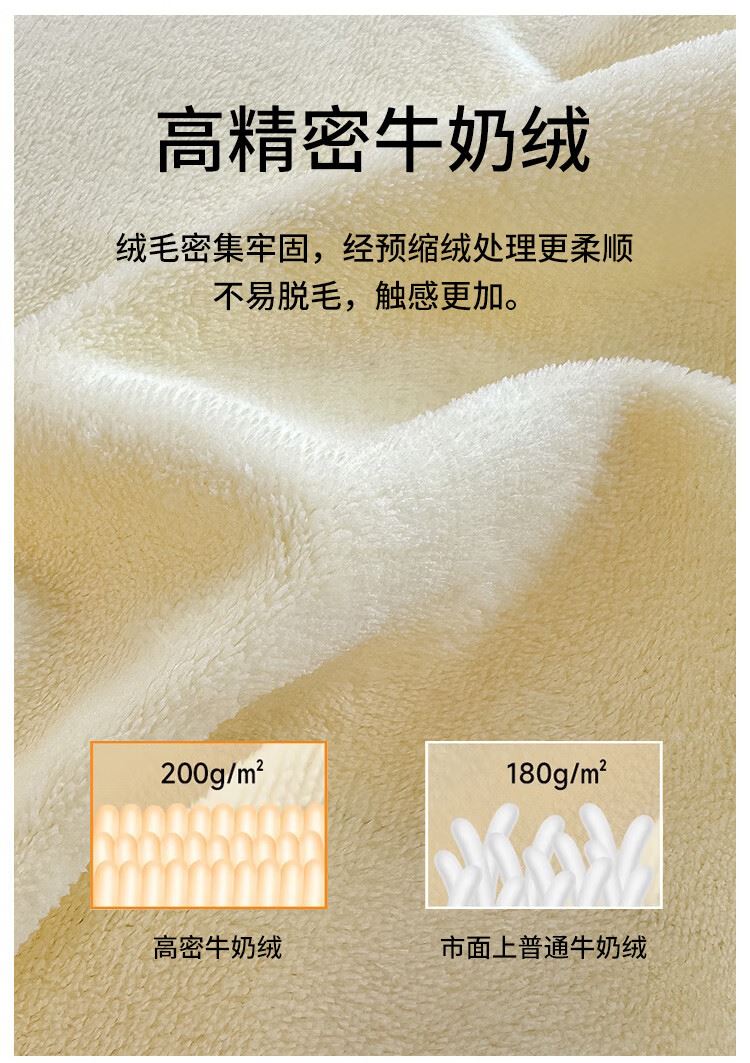 被套:200*230cm 床单:250*250cm 枕套:48*74cm*2 面料:牛奶绒 执行标准:GB/T22796-2021 安全类别:GB18401-2010 B类 1.采用亲肤牛奶绒面料,表层绒毛细密软糯,触感舒适;牛奶绒面料纤维较小密度高,表面平滑细密,更保暖。2.内置导电纱,防静电处理,使用更安心。3.简约设计,使得毯子更显档次,更显时尚。精致的包边工艺,做工精细,针脚细密,不易脱线,牢固耐用。