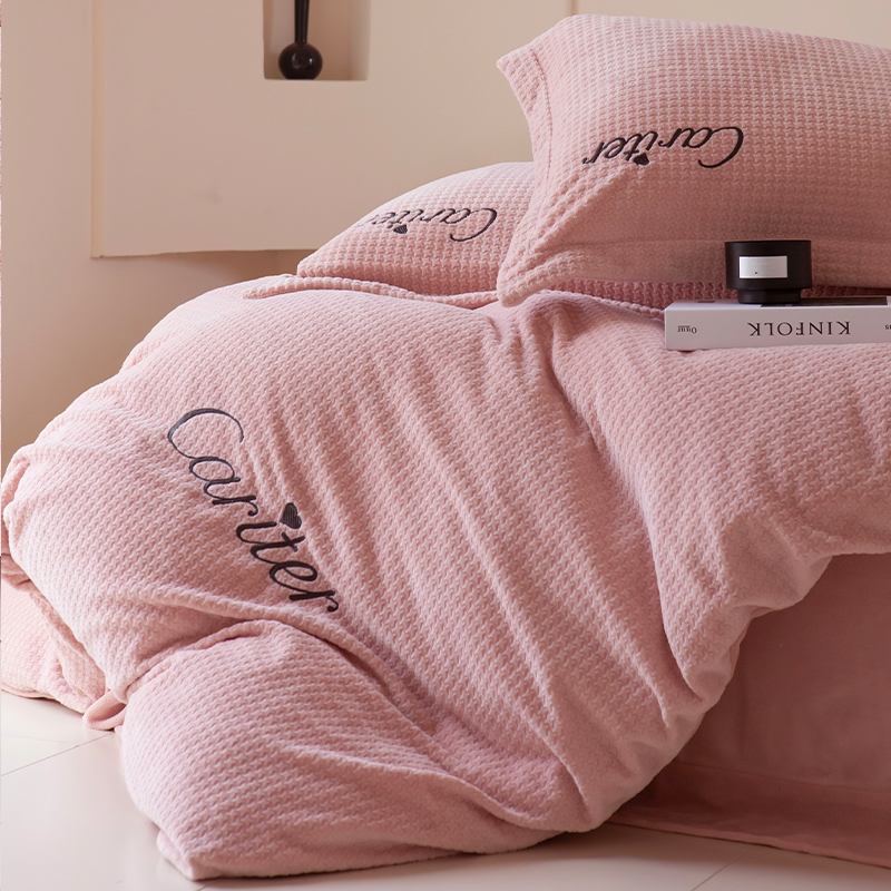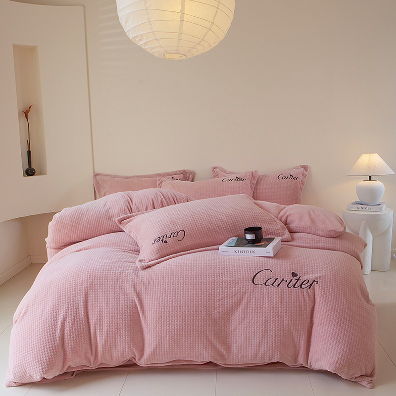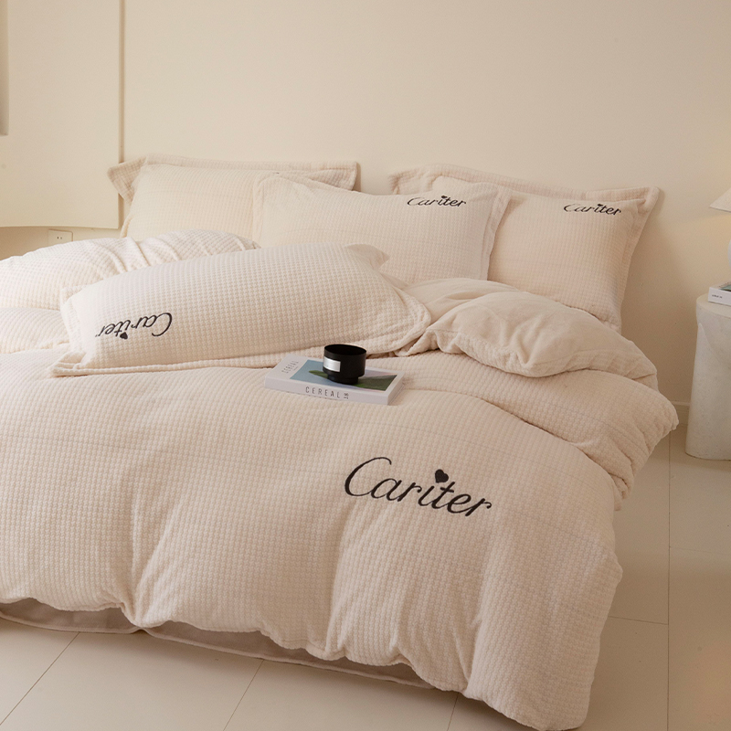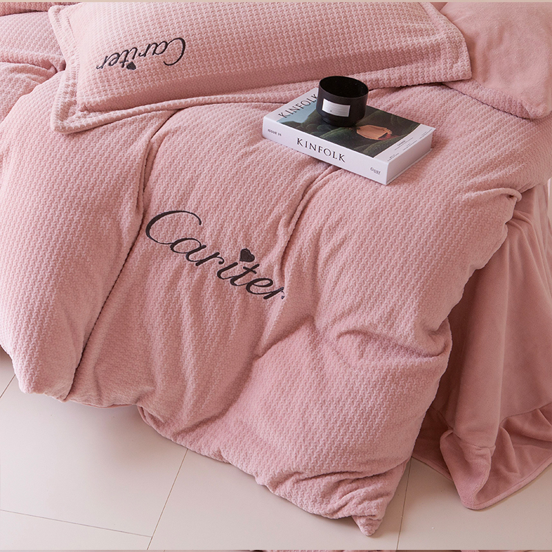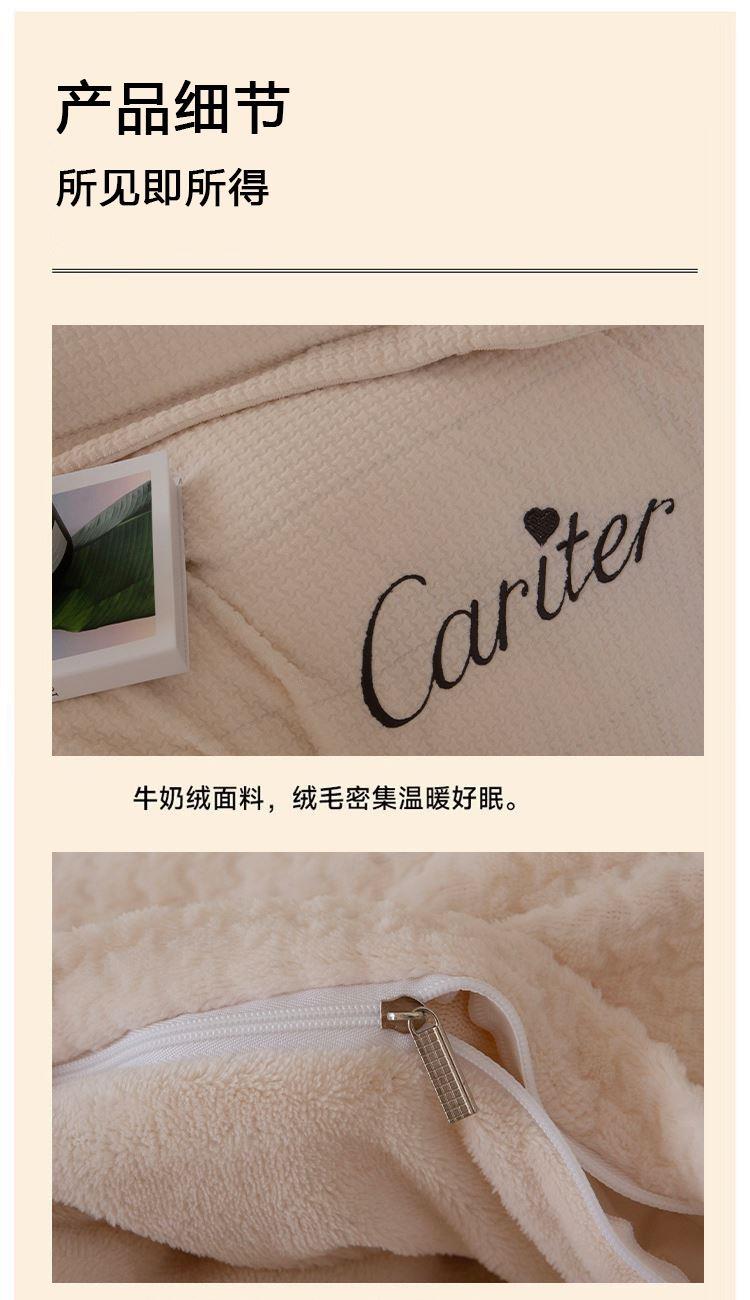 被套:200*230cm 床单:250*250cm 枕套:48*74cm*2 面料:牛奶绒 执行标准:GB/T22796-2021 安全类别:GB18401-2010 B类 1.采用亲肤牛奶绒面料,表层绒毛细密软糯,触感舒适;牛奶绒面料纤维较小密度高,表面平滑细密,更保暖。2.内置导电纱,防静电处理,使用更安心。3.简约设计,使得毯子更显档次,更显时尚。精致的包边工艺,做工精细,针脚细密,不易脱线,牢固耐用。