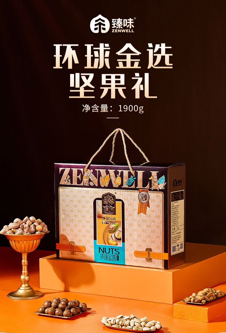 臻味100g美国原色开心果*1 臻味100g越南紫衣腰果*1 臻味100g澳洲巴旦木*1 臻味100g智利原色核桃*1 臻味100g澳洲夏威夷果*1 臻味200g泰国芒果干*1 臻味200g智利无核西梅干*1 臻味300g菲律宾黄蕉干*1 臻味200g阿联酋椰枣*1 臻味150g土耳其金提干*1 臻味350g泰国龙眼干*1 环球金选,采用烫金工艺材质,整体气质时尚沉稳;内配5种坚果,6种果干