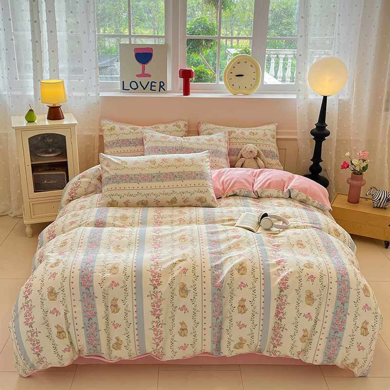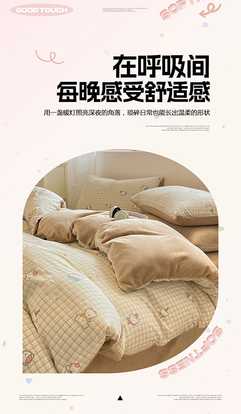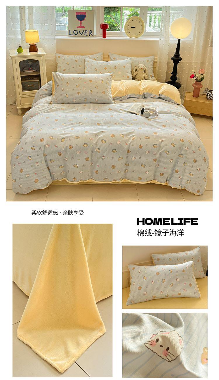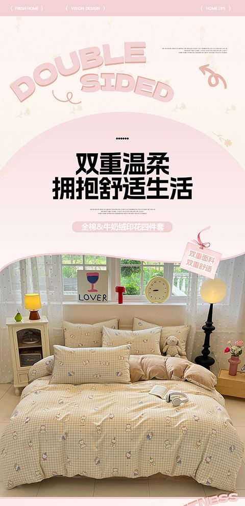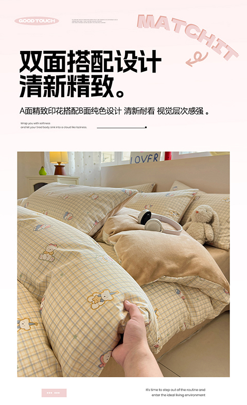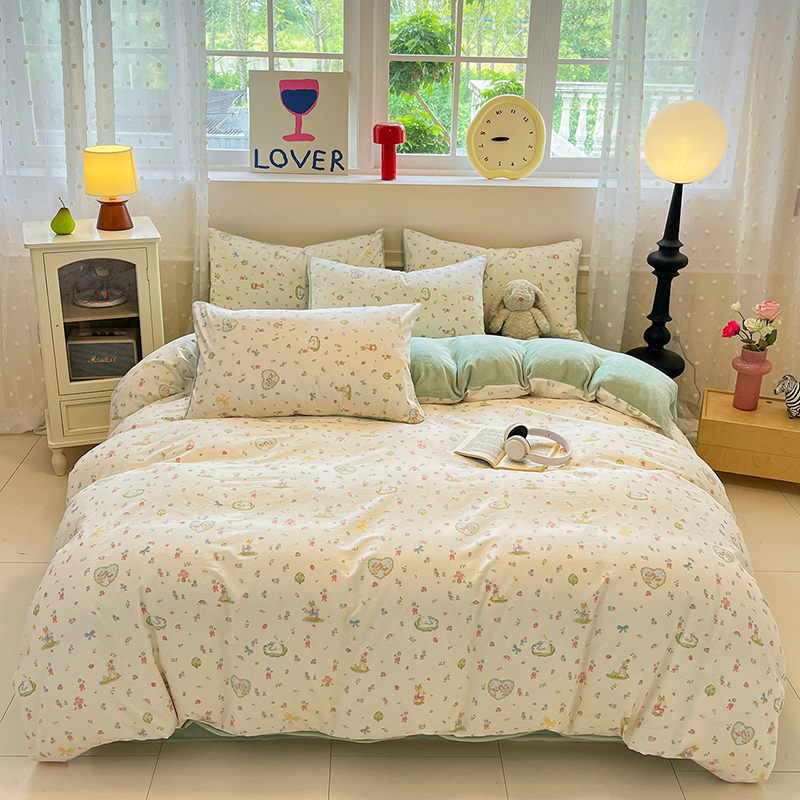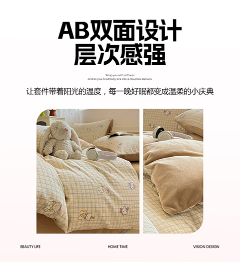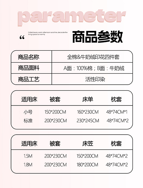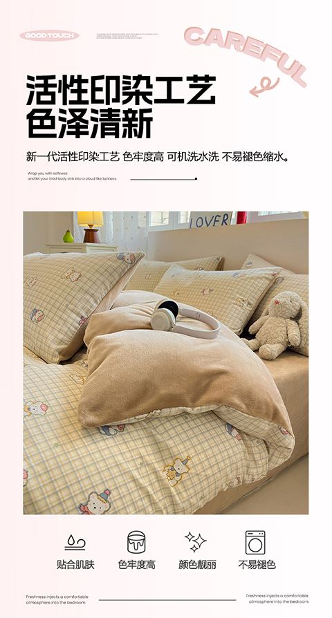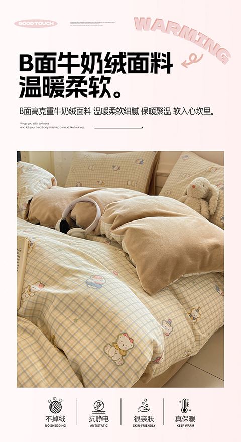 1:A面甄选高支高密全棉面料 柔软细腻透气 享受每一寸舒适感 2:B面高克重牛奶绒面料 温暖柔软细腻 保暖聚温 软入心坎里 3:双面搭配设计清新精致。 A面精致印花搭配B面纯色设计 清新耐看 视觉层次感强 。 尺寸:被套:200*230cm*1 床单:230*245cm*1 枕套:48*74cm*2 包装:礼盒/礼袋 重量:约3kg