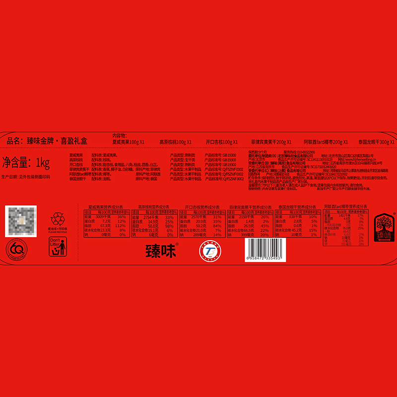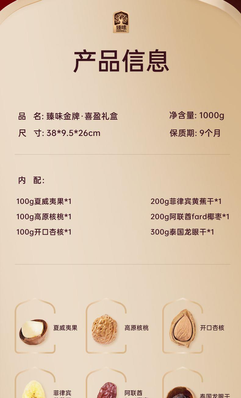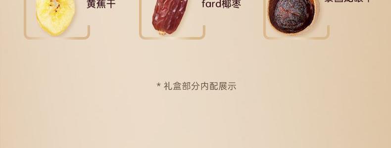 100g夏威夷果*1 100g高原核桃*1 100g开口杏核*1 200g菲律宾黄蕉干*1 200g阿联酋fard椰枣*1 300g泰国龙眼干*1 热烈且极具新春氛围感的灯笼流苏携着美好祝福在空中轻轻摇曳,寓意着新的一年福泽盈怀、祥和如意;