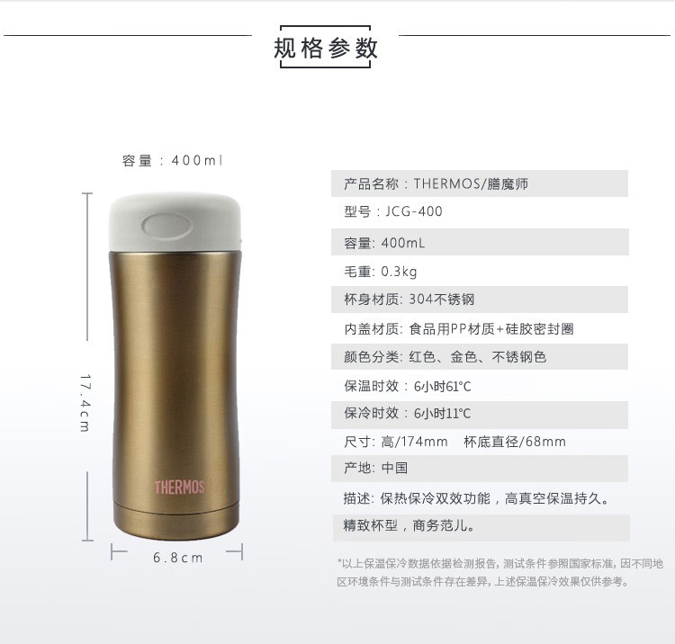 颜 色: R红色 SBK不锈钢 CAC银粉色 CGY灰色 GL金色 容 量:400ml 保温效力:63C以上(6小时) 保冷效力:10C以下(6小时) 外管材质:304不锈钢 内管材质:304不锈钢 密封圈:食品级硅胶