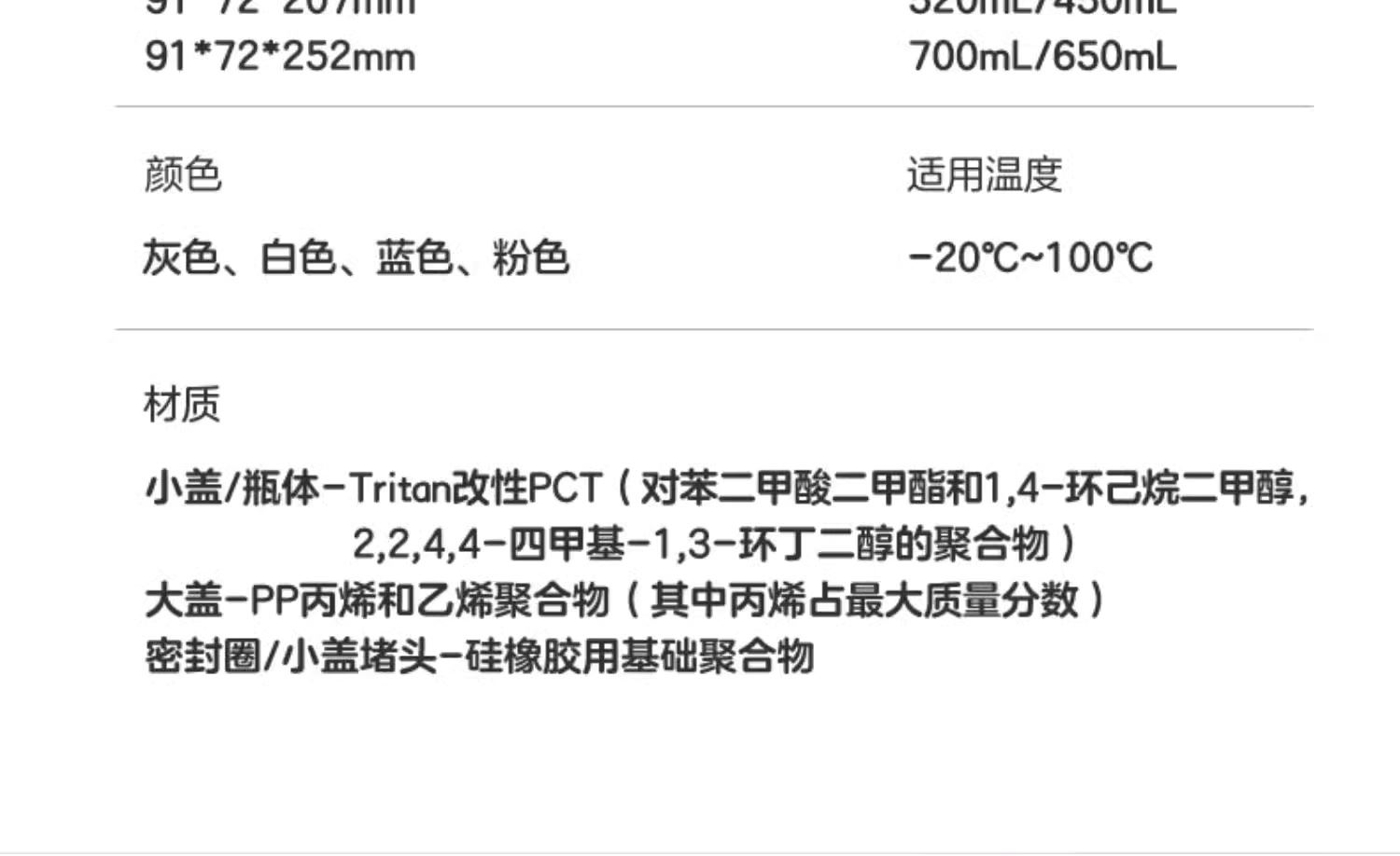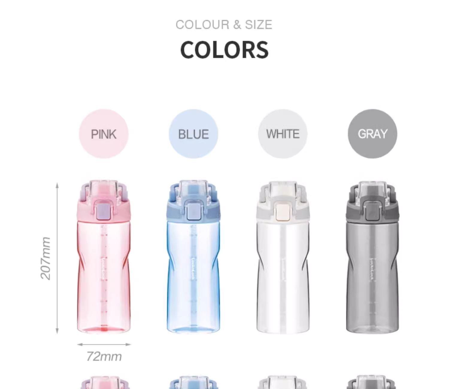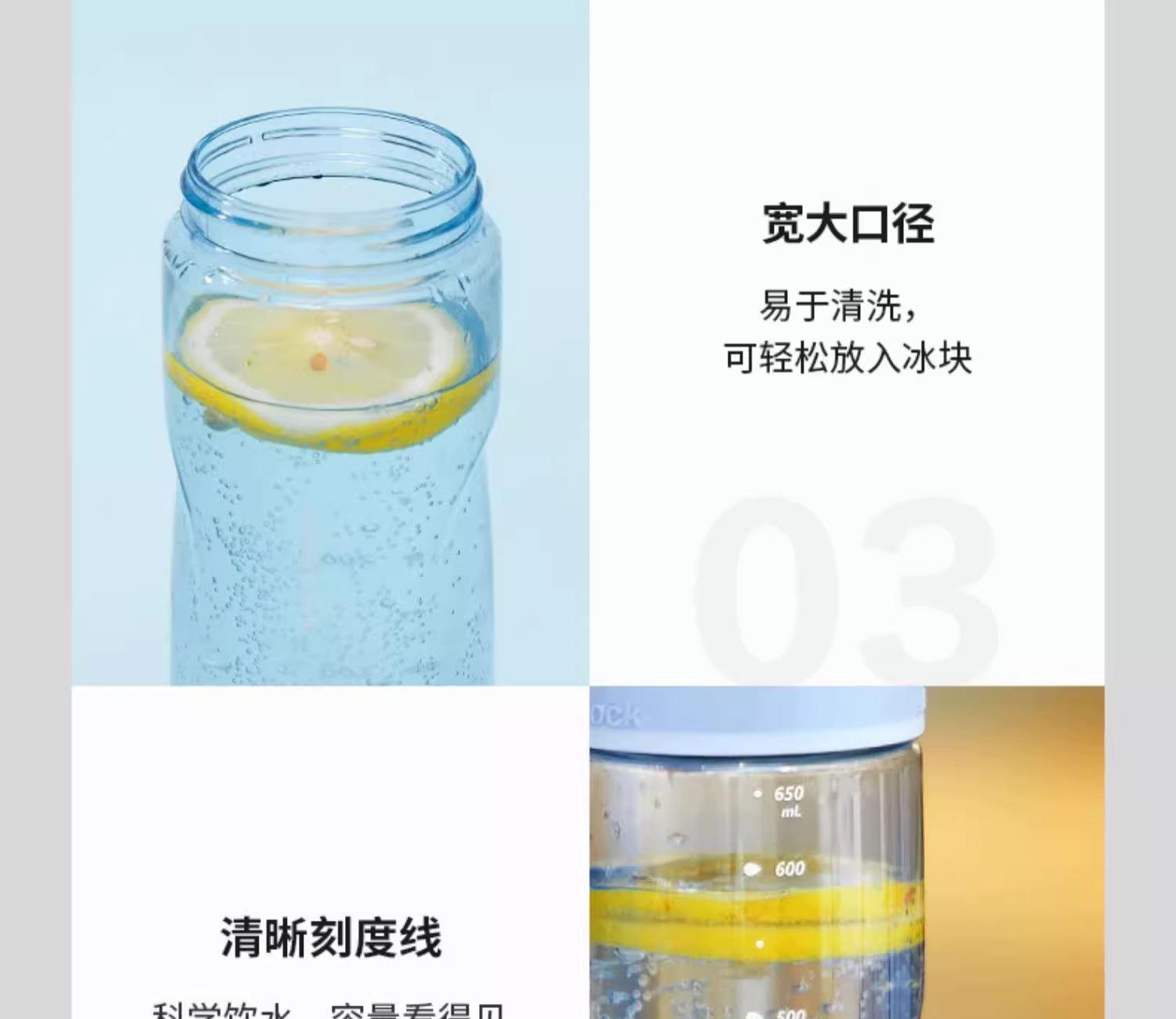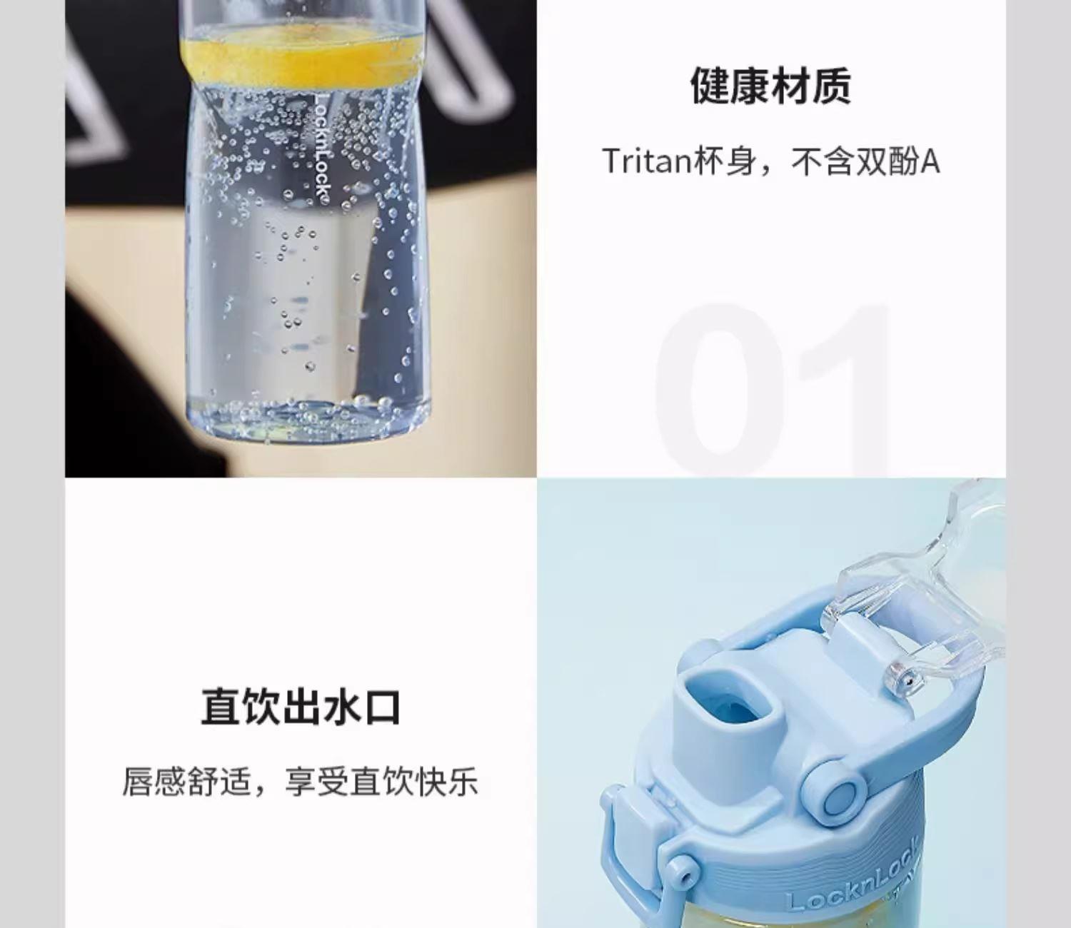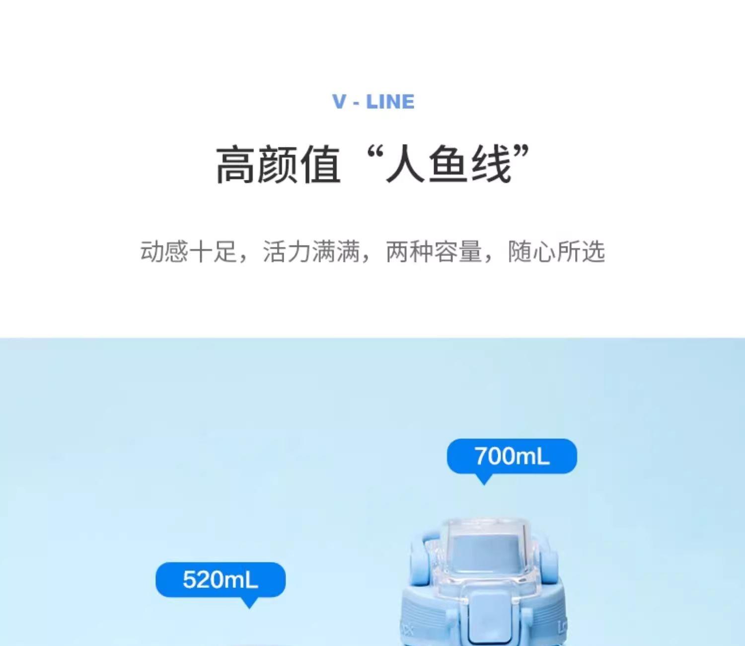 产品特点: 便携提手,隐藏式提手,开合设计,方便美观 一键开盖,锁扣设计美观时尚,单手操作简单方便 自带刻度,刻度标记,随心畅饮,安全材质 密封防漏,大容量700ml防漏便携,密封防漏,随身携带 Tritan杯身不含双酚A 适用温度:-20℃-100℃(建议水温不超过60°) 容量:700ml