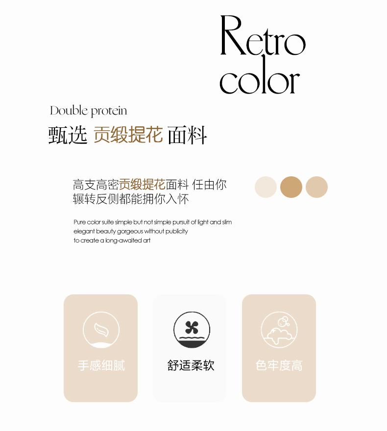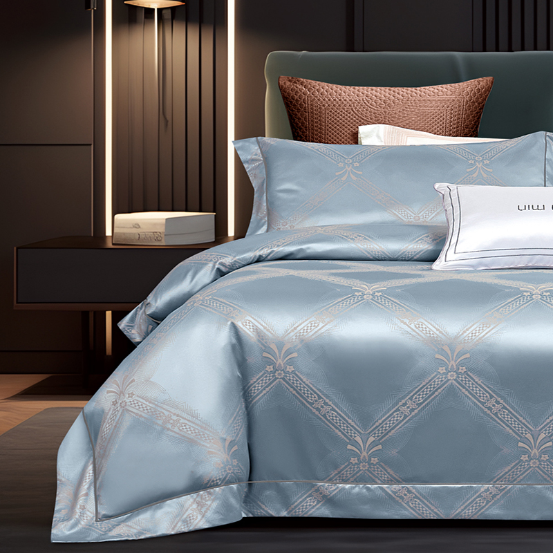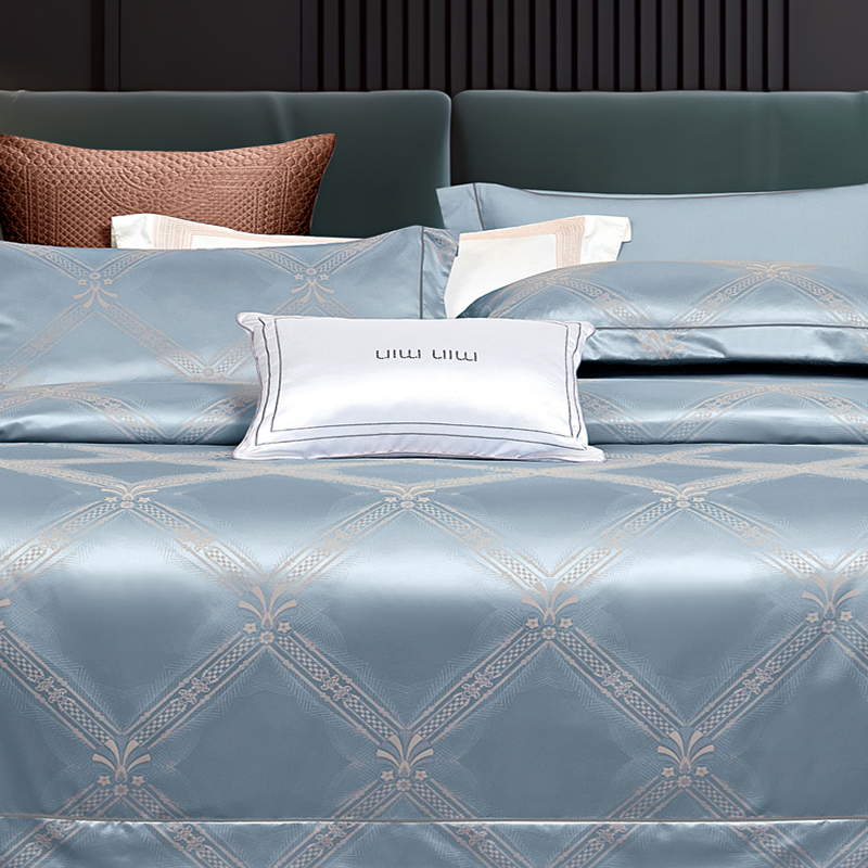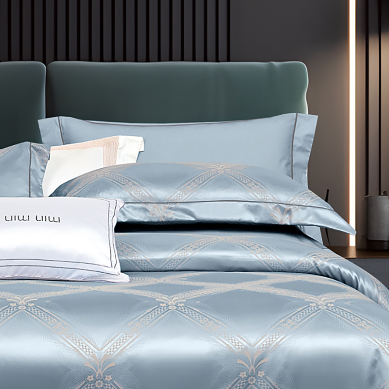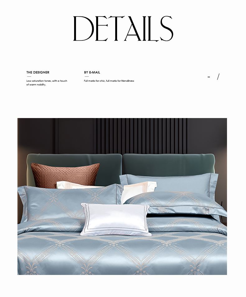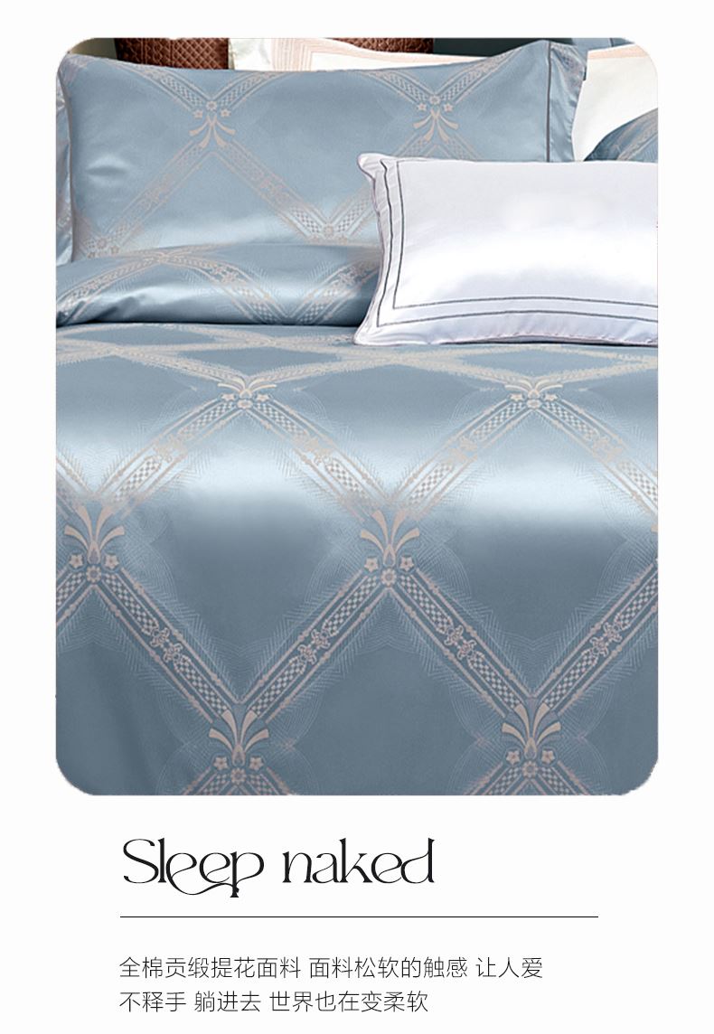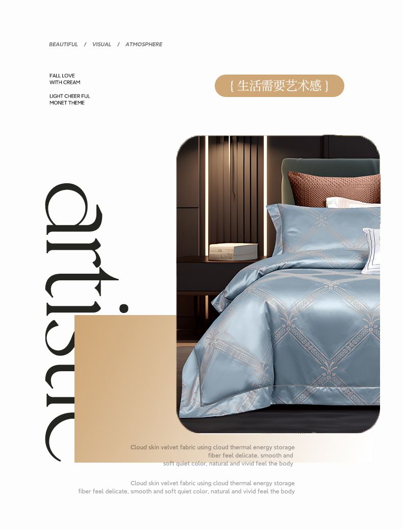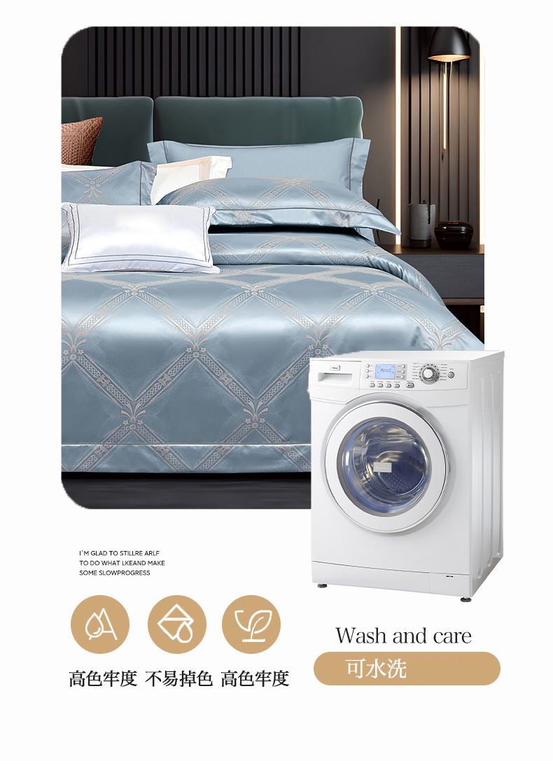 被套:200*230cm 床单:250*250cm 枕套:48*74cm*2 面料:贡缎提花(聚酯纤维) 执行标准:GB/T22796-2021 安全类别:GB18401-2010 B类 1.莱赛尔是自然界的绿色纤维,是从校树中提取木浆为原料,赋予了织物以柔滑的触感和美妙的光泽,丝滑柔滑的全新享受。 2.从木材中萃取出来织成的纺品轻薄透气,柔滑垂顺,被誉为“会呼吸的面料