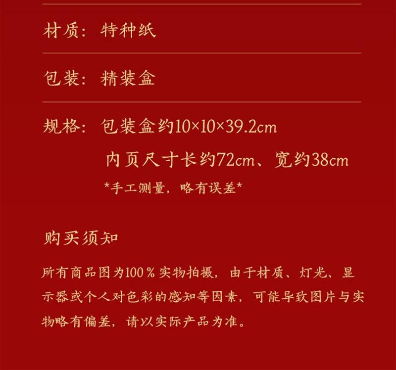 单位:1 本 材质:特种纸 包装:精装盒 规格:包装盒约 10×10×39.2cm 内页尺寸长约 72cm、宽约 38cm