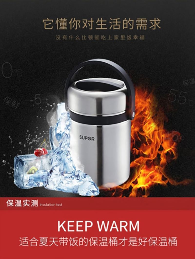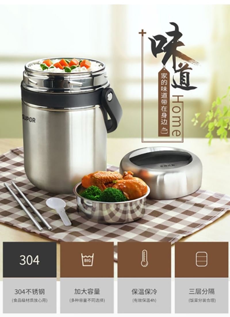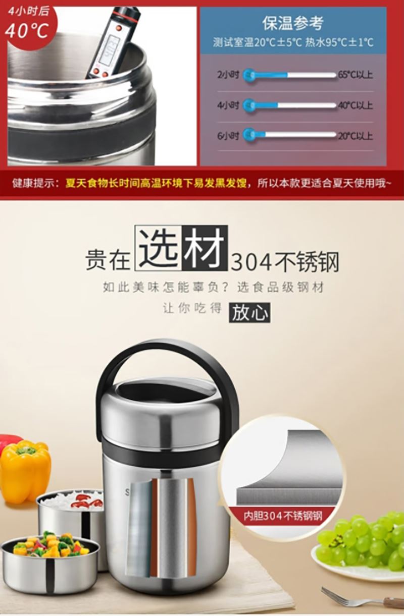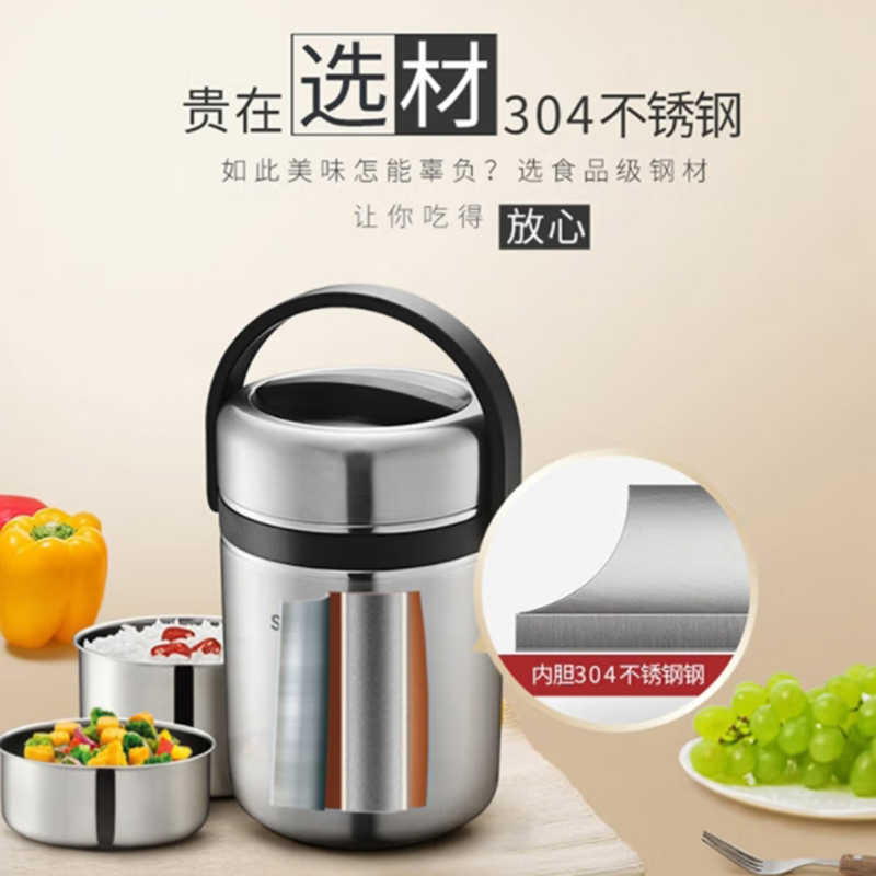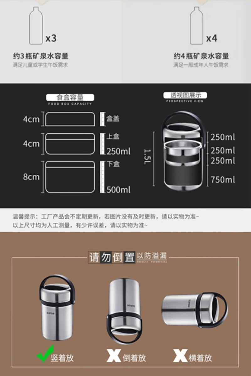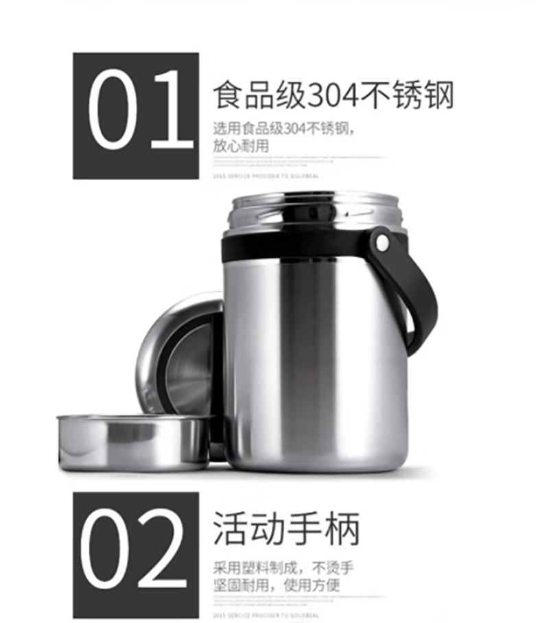 容量 1.5L 材质 304不锈钢 规格参数 颜色:不锈钢本色 商品毛重:1.025kg 功能:真空保温,手提式 功能卖点 1、不锈钢内胆,保温保冷; 2、大容量,美味一次足够; 3、广口设计,清洗不操心。